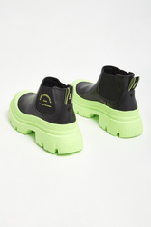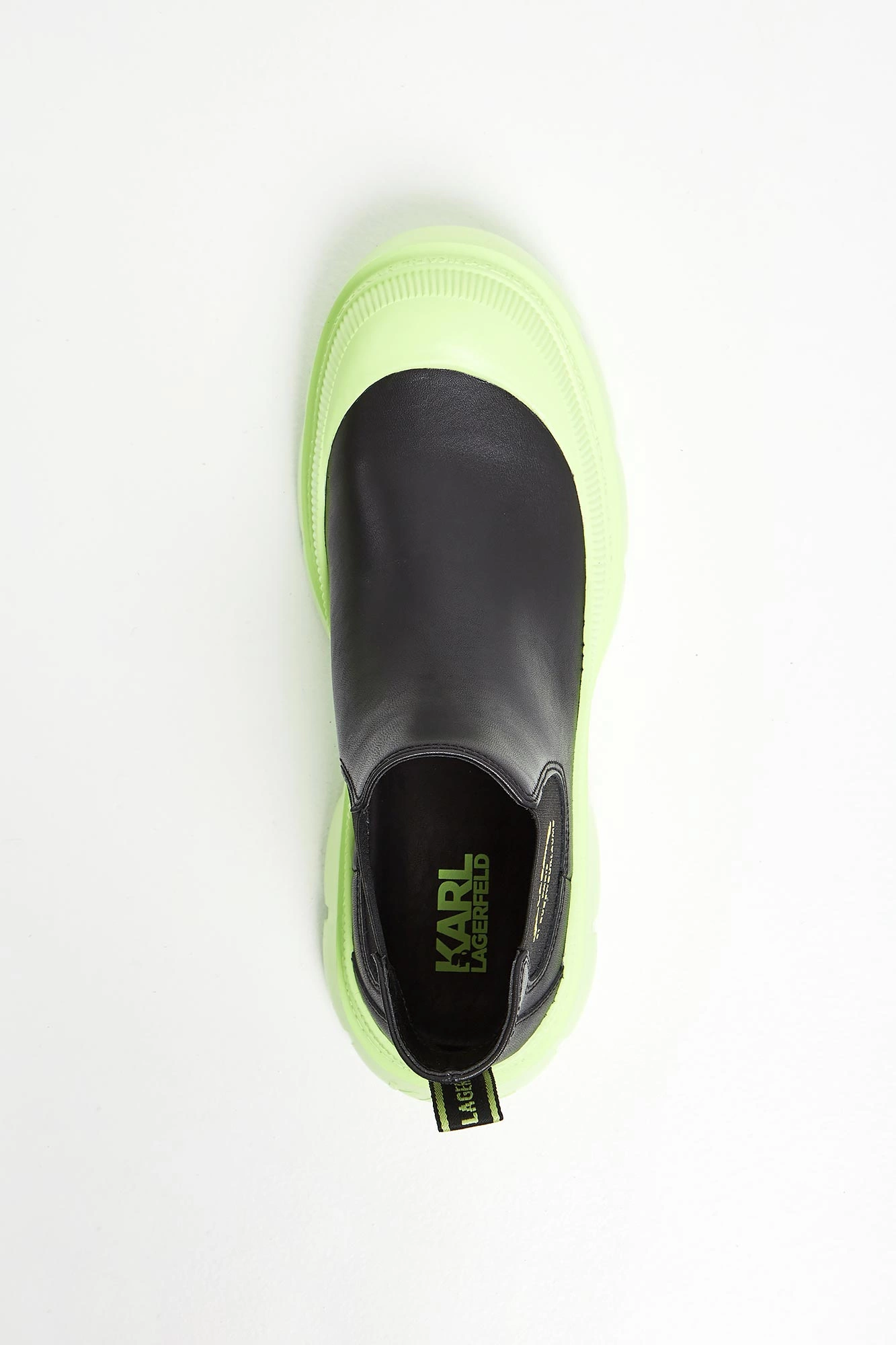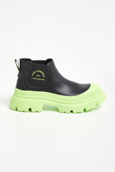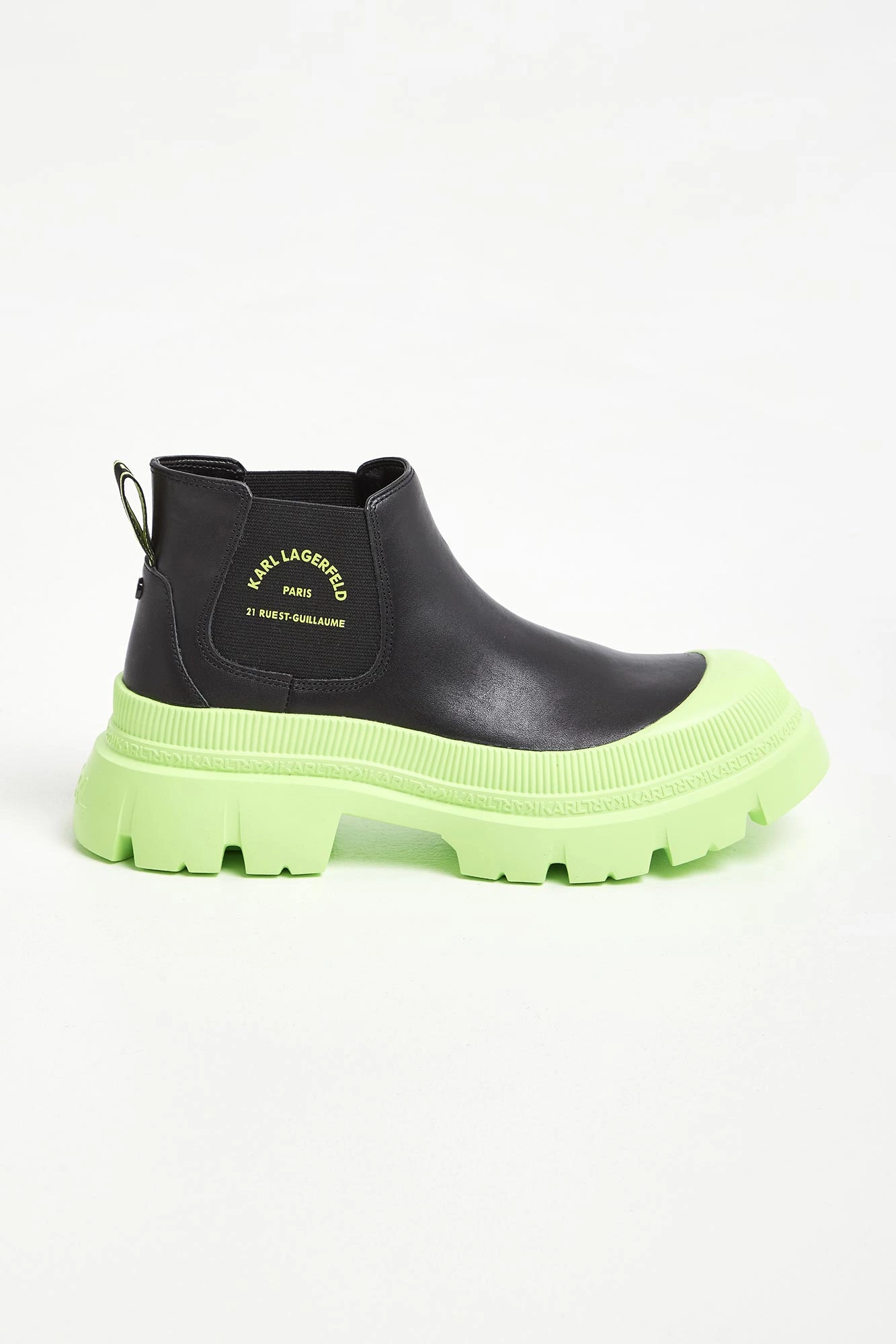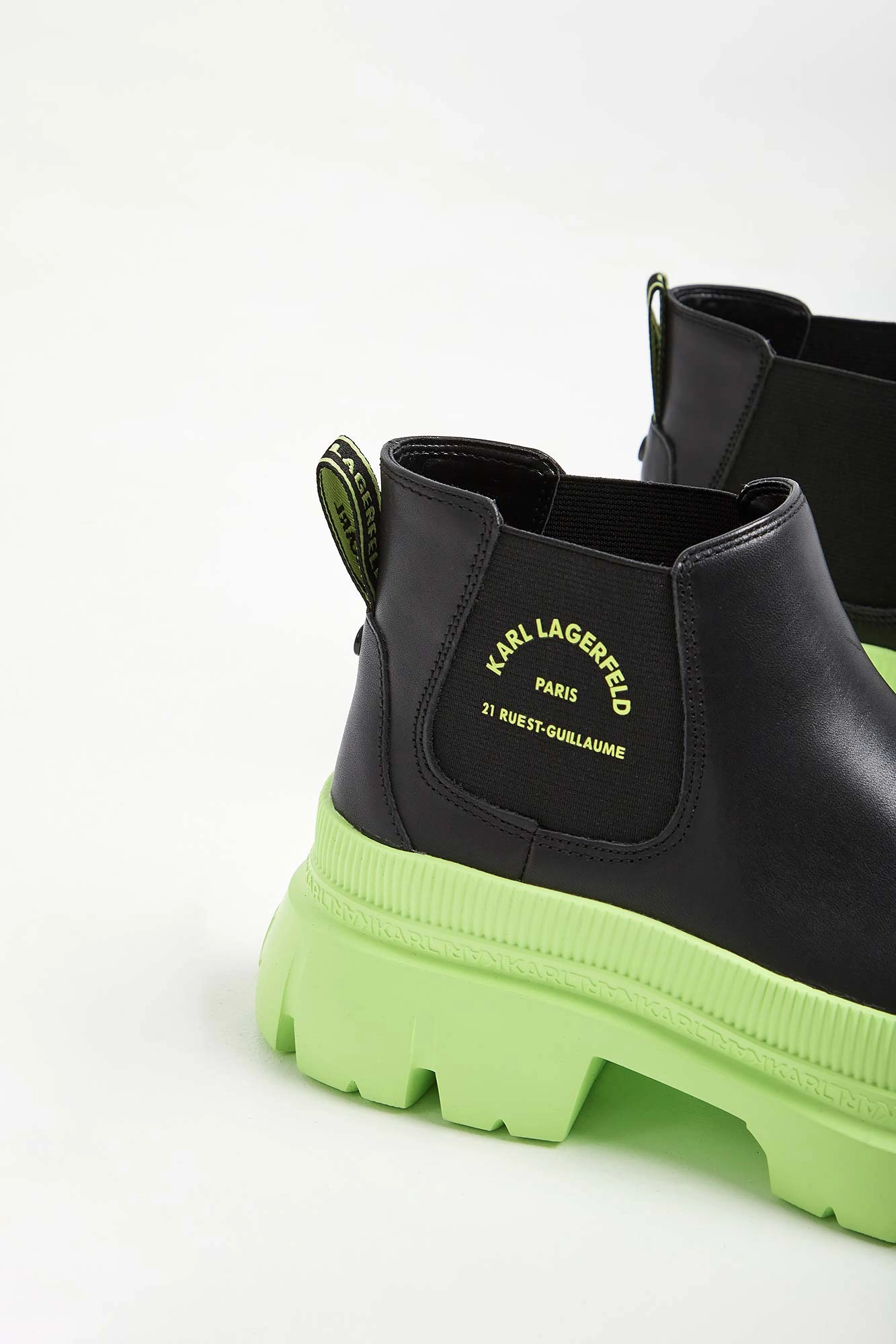 Sztyblety marki Karl Lagerfeld w czarno-limonkowym kolorze. Wysoka, sygnowana, traperowa podeszwa. Po boku wstawka elastycznej gumy z nadrukiem nazwy marki w limonkowym kolorze. Z tyłu pętelka ułatwiająca zakładanie. Wsuwane.