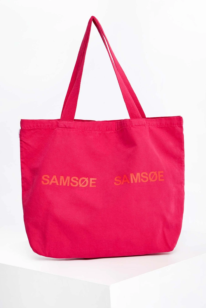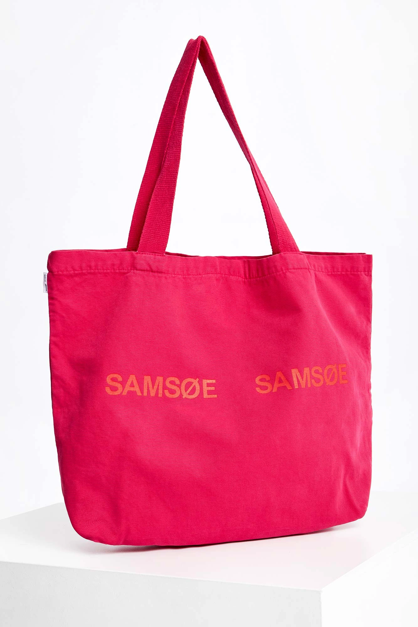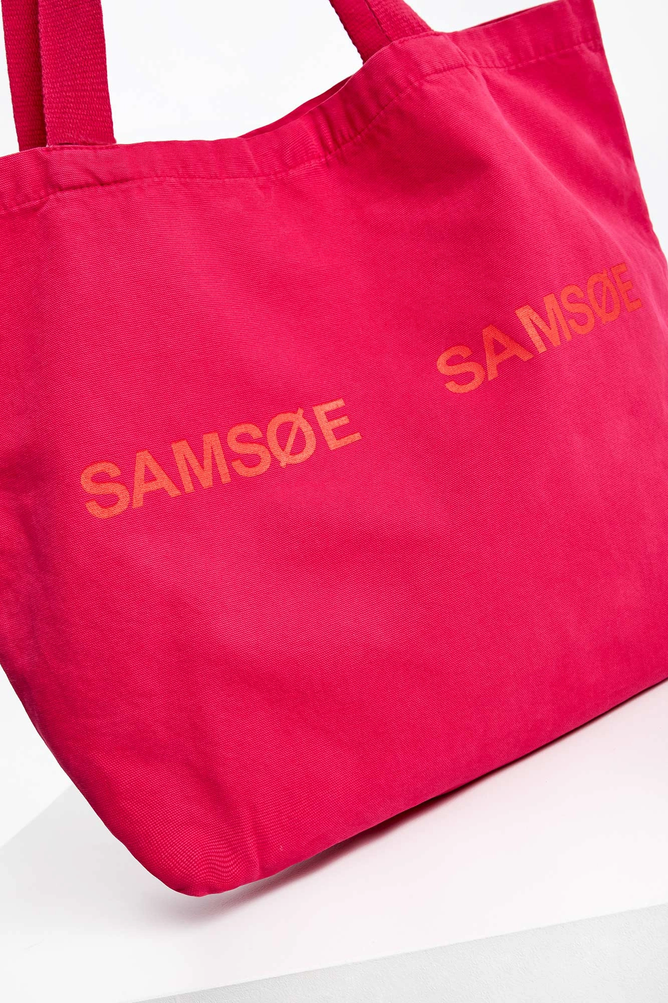 Torba typu shopper marki Samsøe Samsøe w kolorze różowym. Wykonana z płótna bawełnianego. Na froncie nadrukowane logo marki. Parciane paski na ramię. Jednokomorowa.