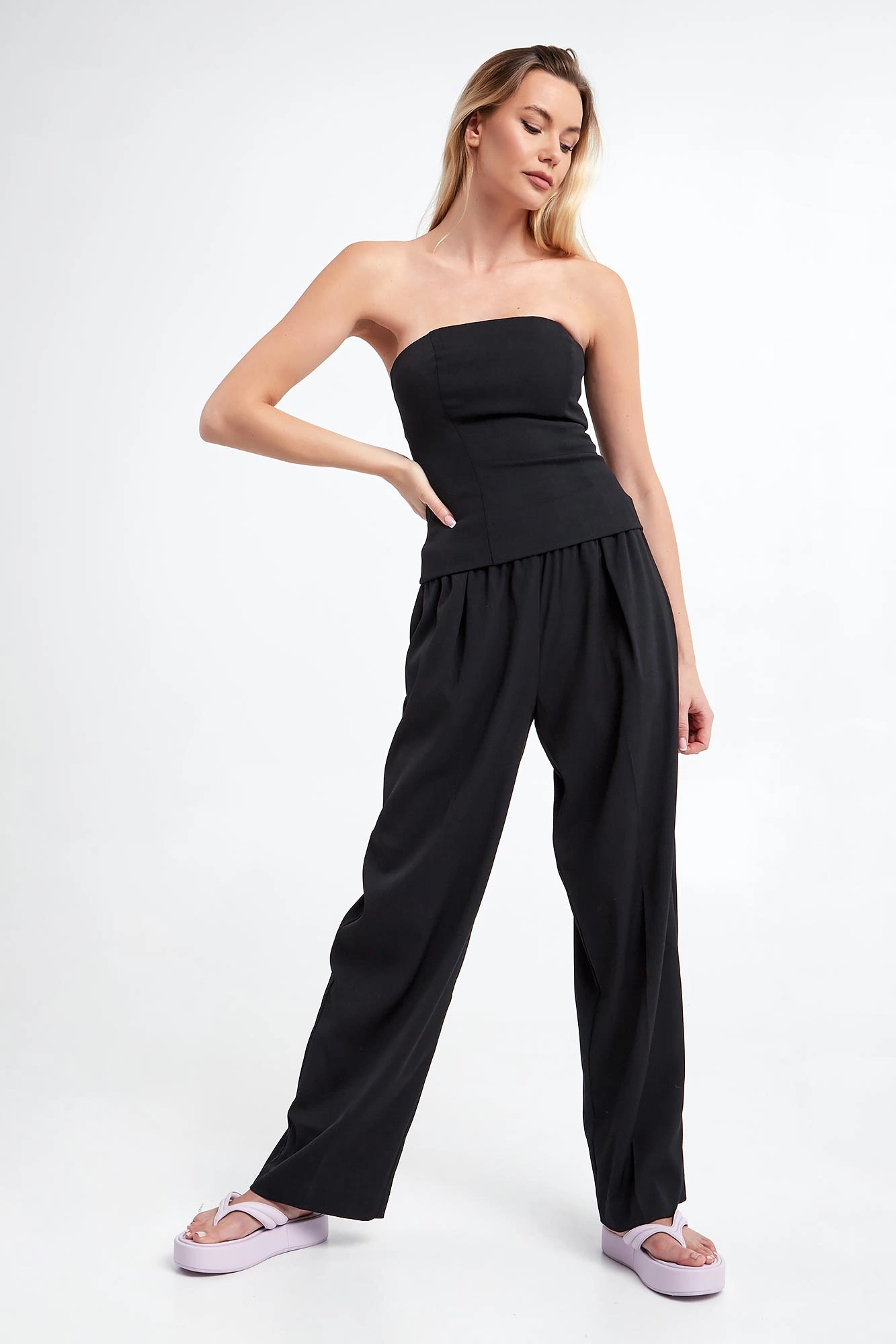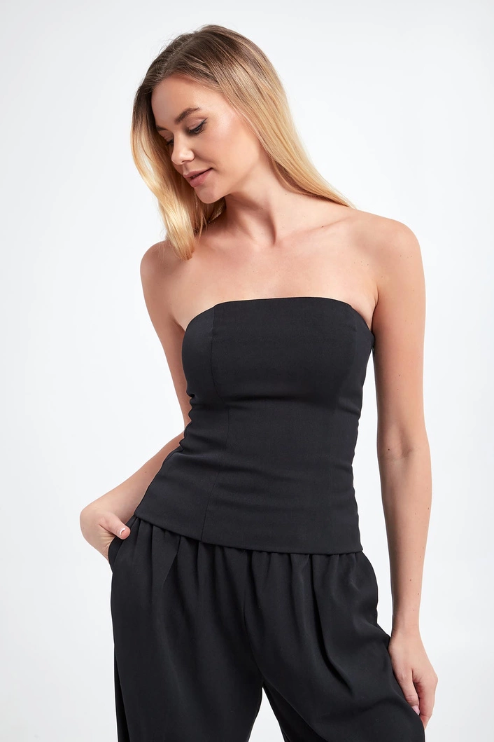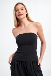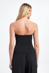 Dopasowany top marki Samsøe Samsøe w kolorze granatowym. Wykonany z mieszanki poliestru z recyklingu z dodatkiem elastanu. Materiał posiada certyfikat GRS, czyli każdy etap łańcucha dostaw spełnia surowe wymagania społeczne, środowiskowe i chemiczne. Model bez ramiączek, gorsetowy z profilowanymi szwami. Zapinany z boku na niewidoczny zamek. Model slim.