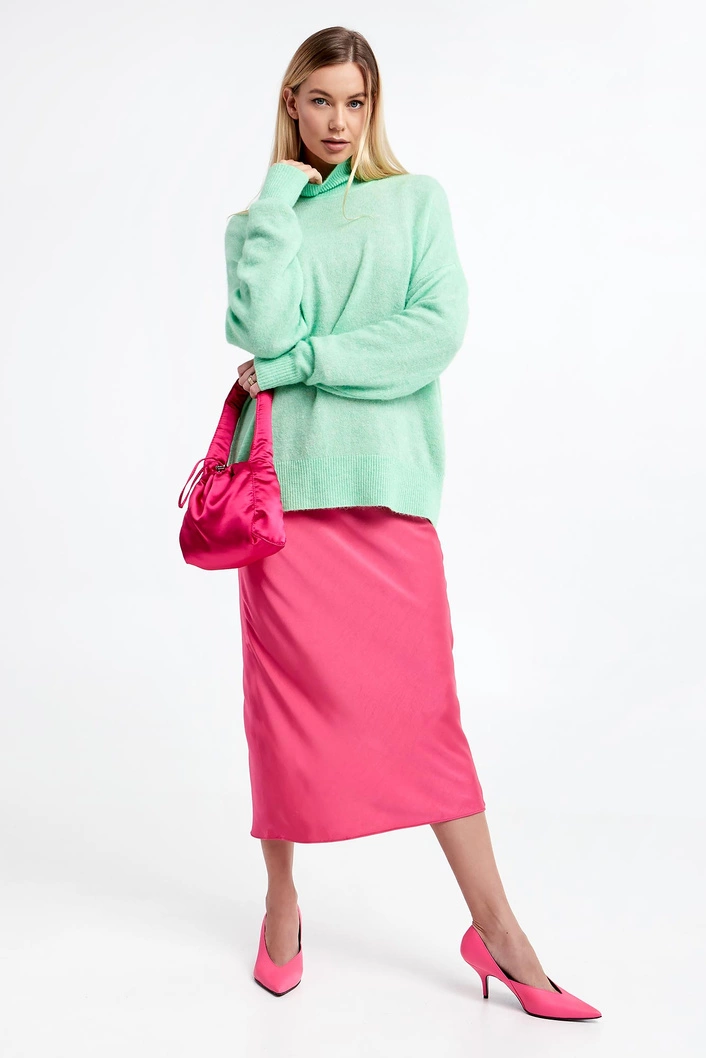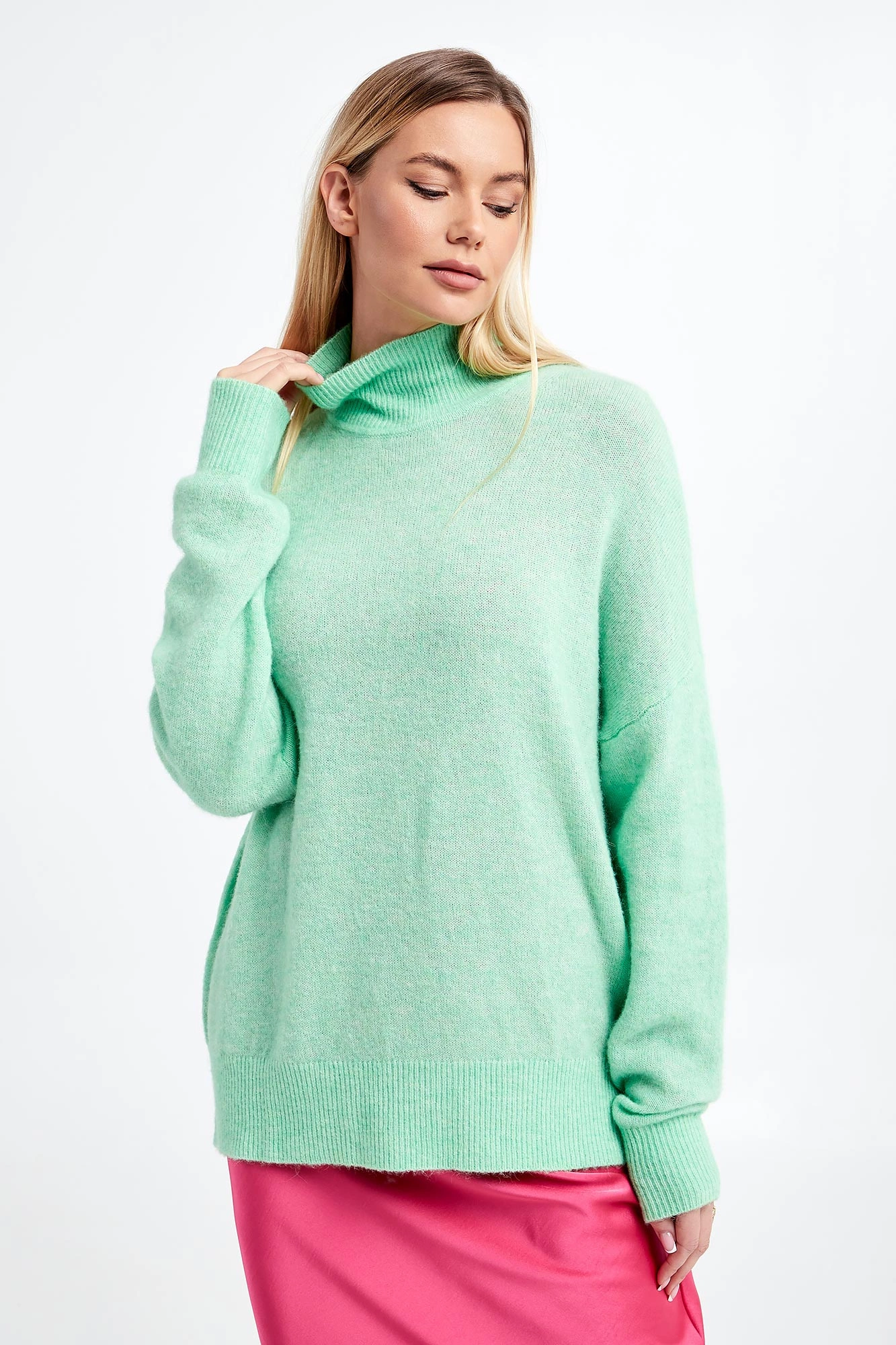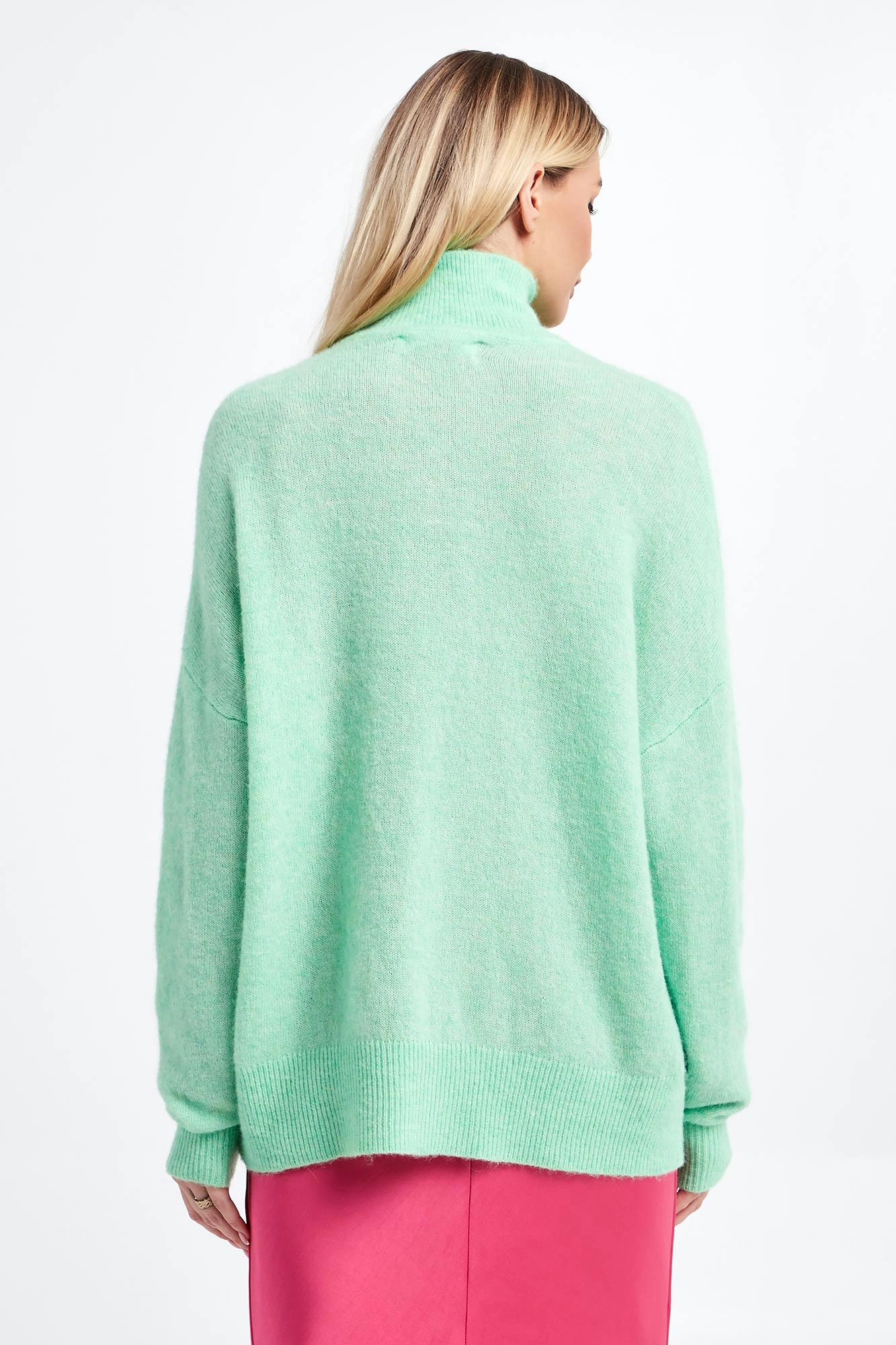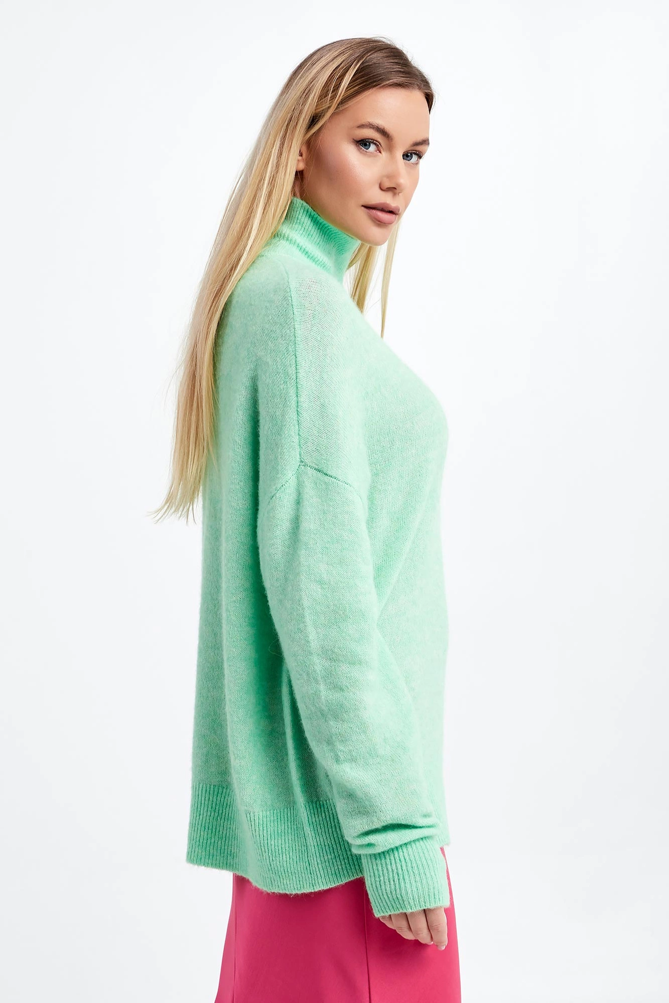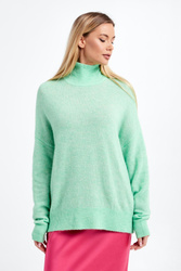 Golf marki Samsøe Samsøe w seledynowym kolorze. Wykonany z mieszanki alpaki, bawełny i wełny merino z dodatkiem elastycznych włókien. Góra, długie rękawy i dół wykończone elastycznym ściągaczem. Obniżona linia ramion. Fason typu oversize.