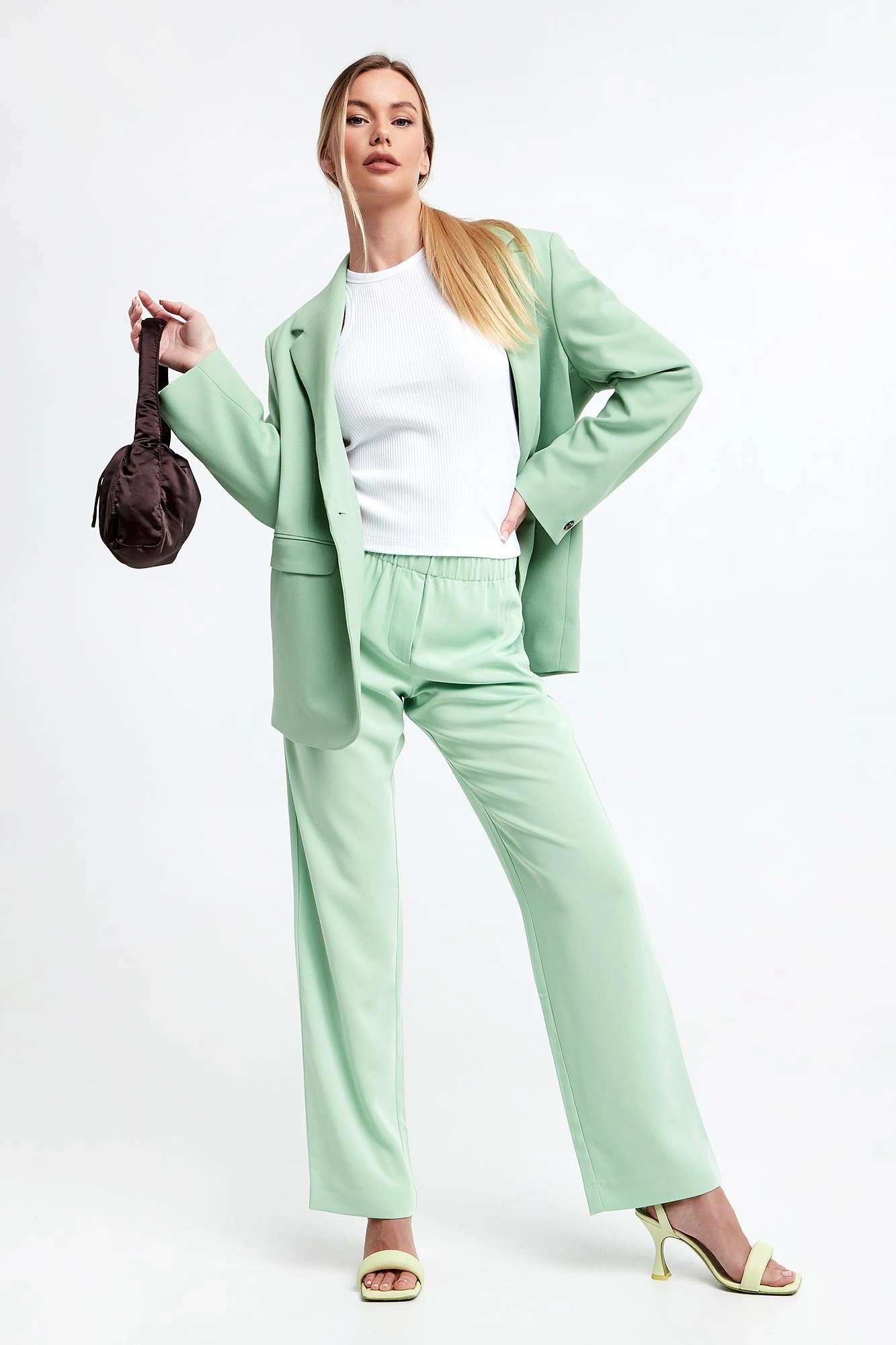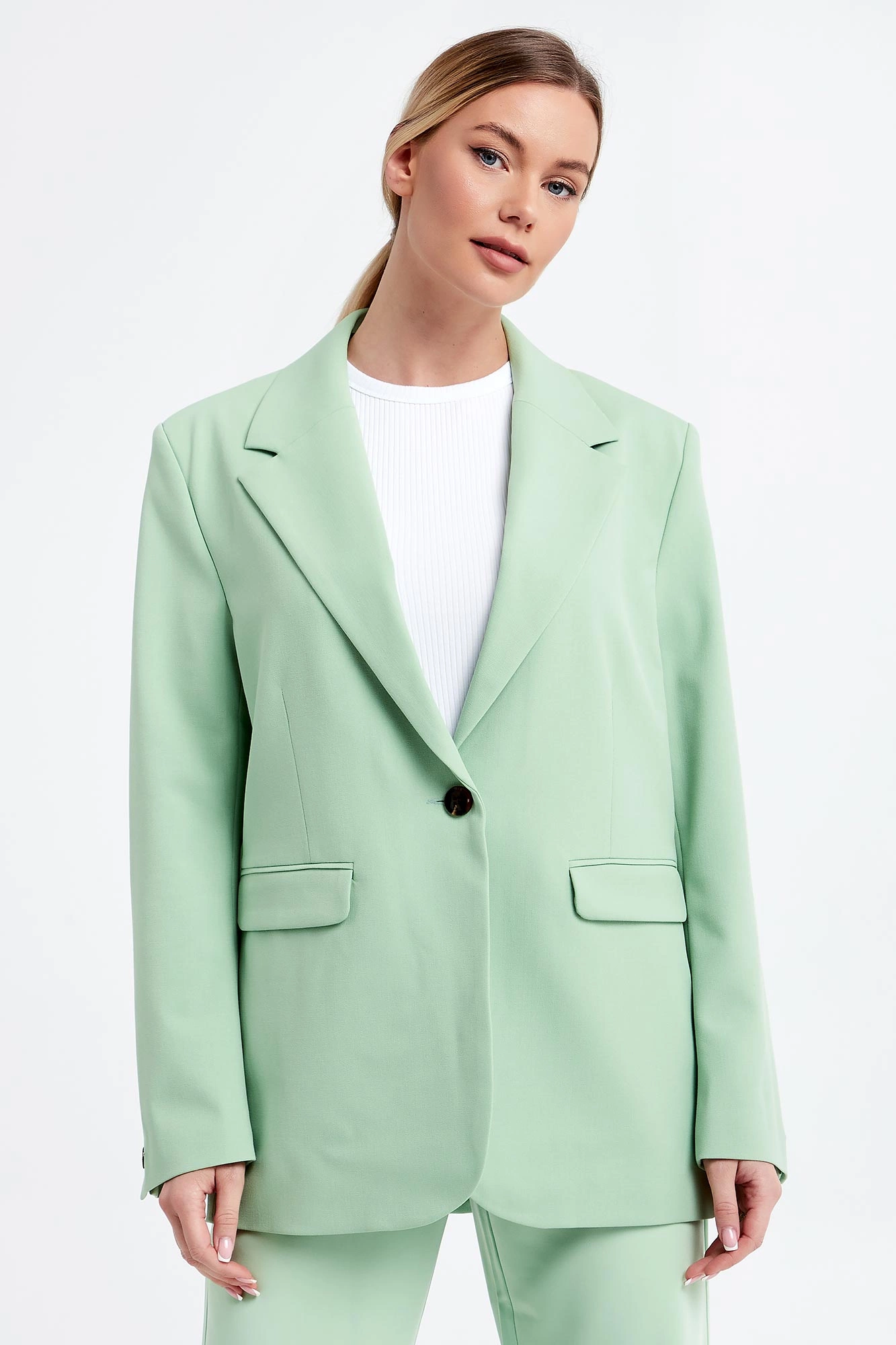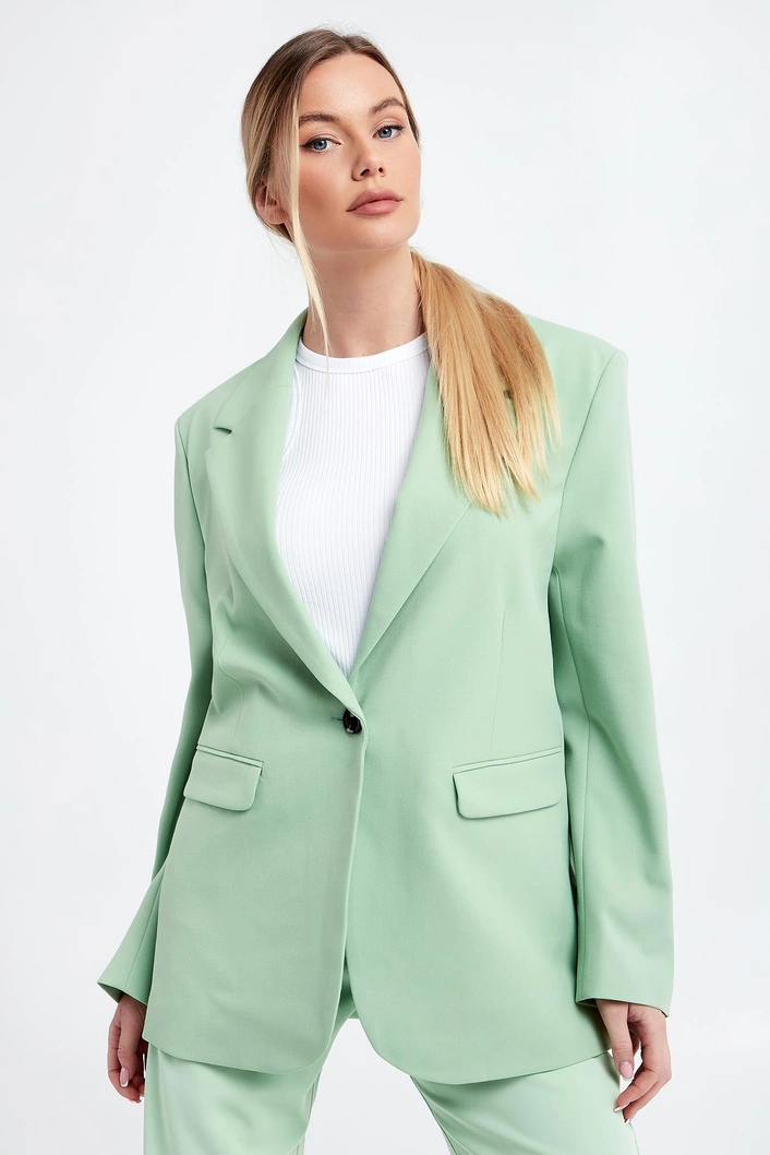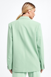Marynarka marki Samsøe Samsøe w seledynowym kolorze. Fason typu oversize. Klasyczna klapa. Zapinana za pomocą jednego guzika w brązowym kolorze. Model z dwoma kieszeniami z patką. Długie rękawy wykończone guzikiem. Wykonana z poliestru z recyklngu i wiskozy z włókien LENZING™ ECOVERO™.