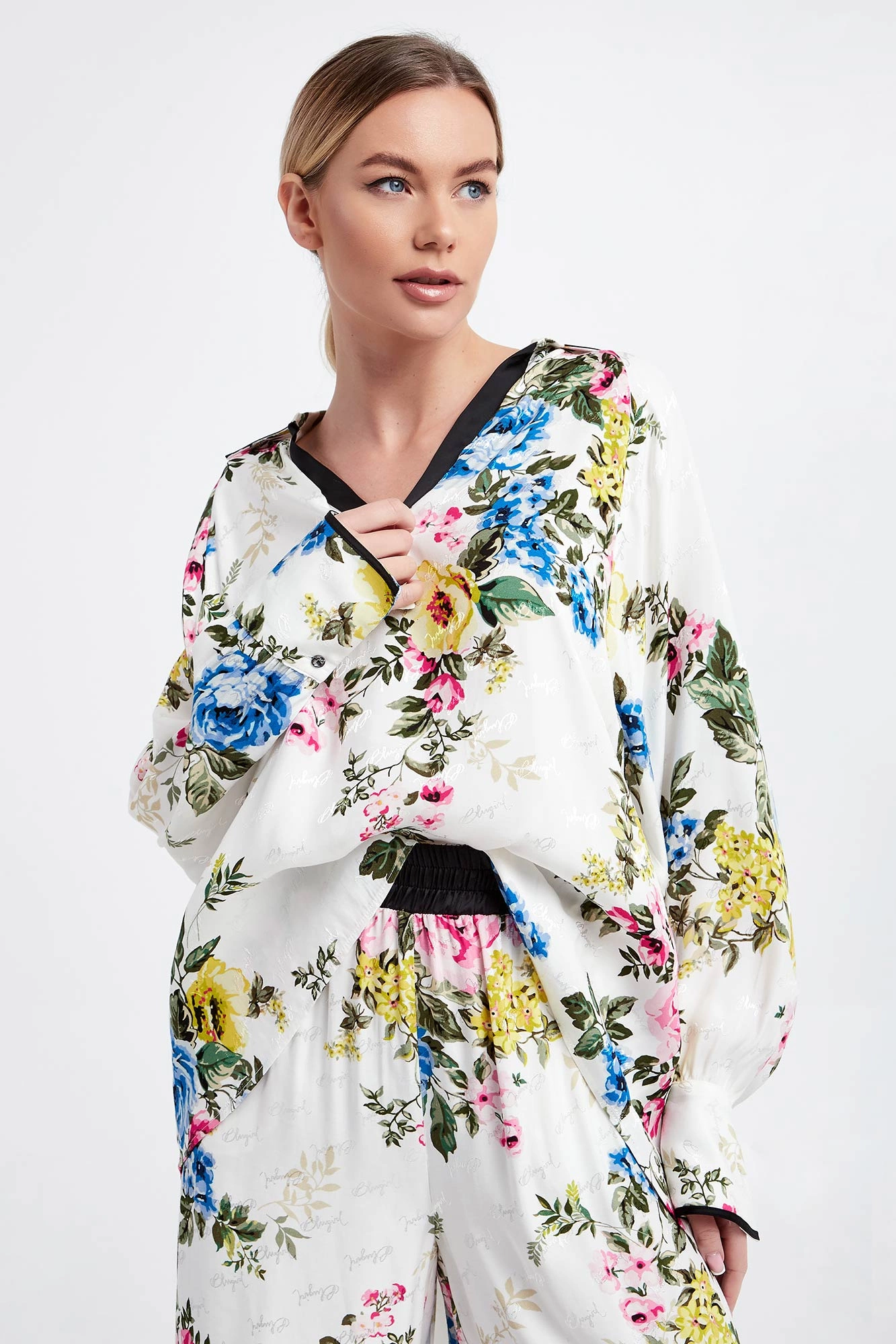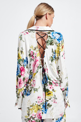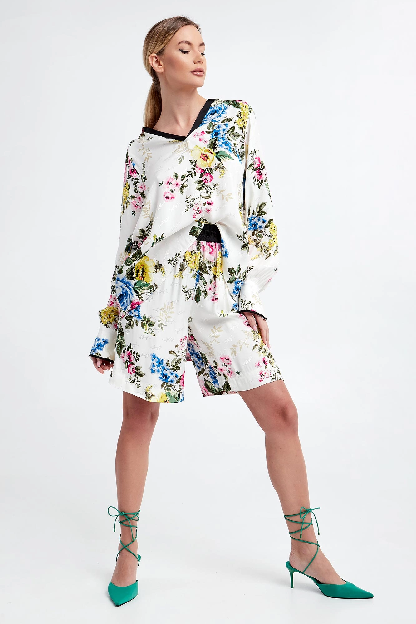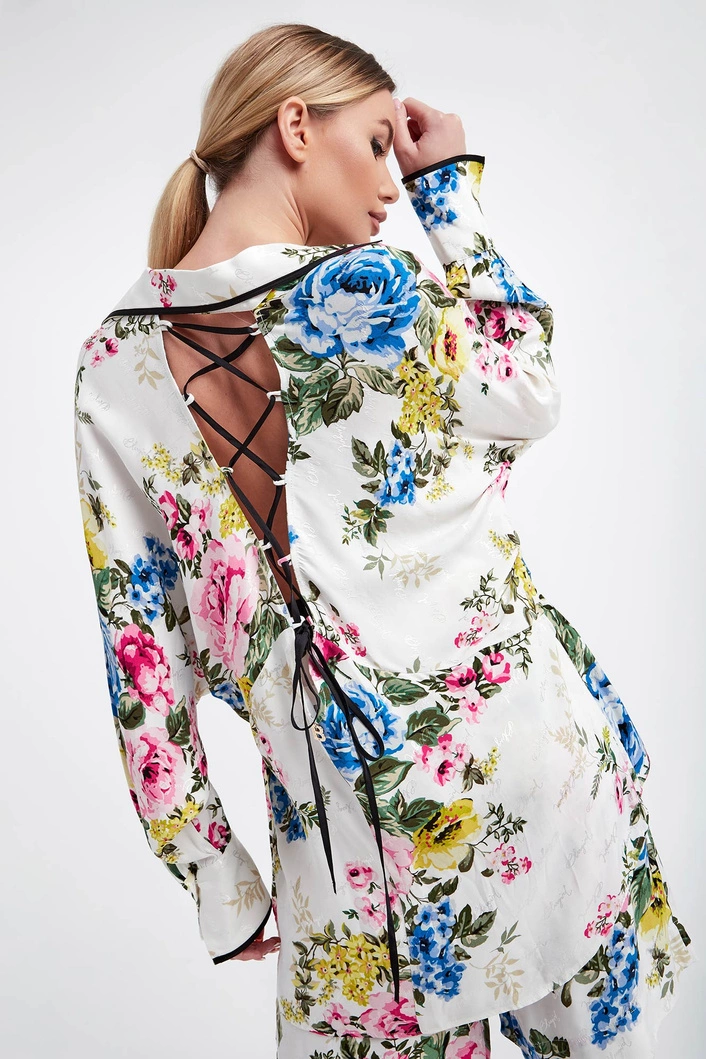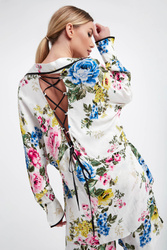Koszula żakardowa marki Blugirl Blumarine w kolorze ecru. Na całości wielokolorowy kwiatowy wzór i nadruk nazwy marki. Wykonana ze stuprocentowej wiskozy. Dekolt v-neck wykończony kołnierzem. Z tyłu metalowa aplikacja w kształcie litery B w złotym kolorze i ozdobne wiązanie za pomocą troczka w czarnym kolorze. Nietoperzowe rękawy zakończone mankietami zapinanymi za pomocą guzika w postaci kryształku. Fason typu relaxed.