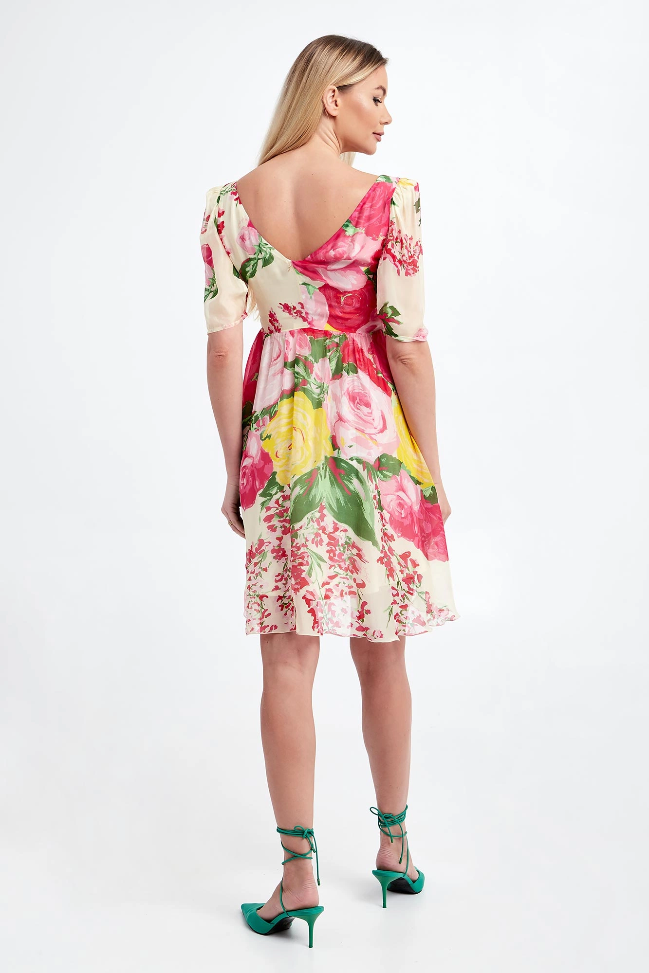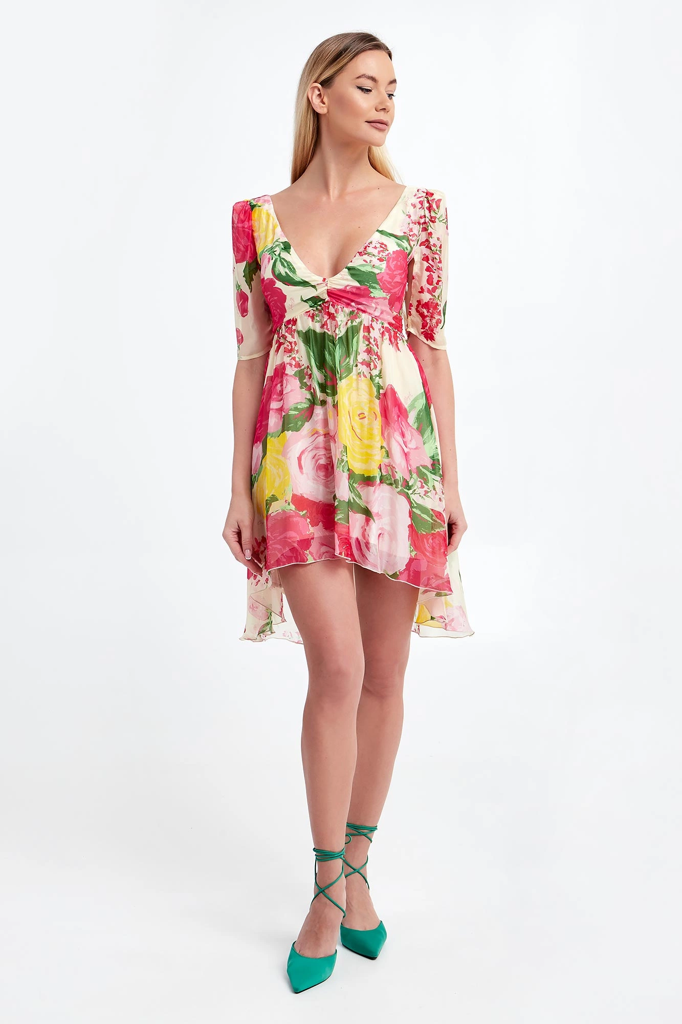 Sukienka marki Blugirl Blumarine w wielokolorowy kwiecisty wzór. Wykonana z półtransparentnego, gładkiego materiału z jedwabiu i wiskozy. Wewnątrz beżowa podszewka. Dekolt typu v-neck z drapowaniem między piersiami. Pod biustem odcięcie. Krótki rękaw z ozdobnymi wycięciami pod pachami. Wycięcie na plecach. Tył dłuższy względem przodu. Całość wykończona beżową nicią. Fason typu regular, długość mini.