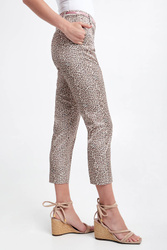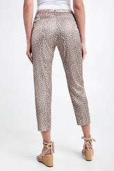 Spodnie marki Blugirl Blumarine w beżowym kolorze. Na całości nadruk w postaci zwierzęcego wzoru i nazwy marki. Typu cygaretki. W pasie szlufki i ozdobna tasiemka w różowym kolorze. Zapinane za pomocą zamka i haftki. Nogawki w kant, nieco zwężane.