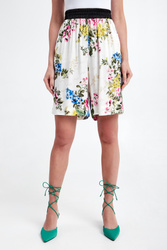 Spodenki żakardowe marki Blugirl Blumarine w kolorze ecru. Na całości wielokolorowy kwiatowy wzór i nadruk nazwy marki. Wykonana ze stuprocentowej wiskozy. Model z trzema wpuszczanymi kieszeniami. W talii elastyczny ściągacz w czarnym kolorze. Marszczone u góry. Z przodu metalowa aplikacja w kształcie litery B w złotym kolorze. Wysoki stan i fason typu regular.