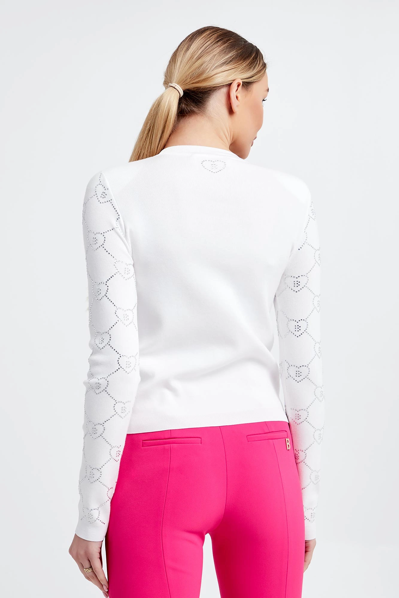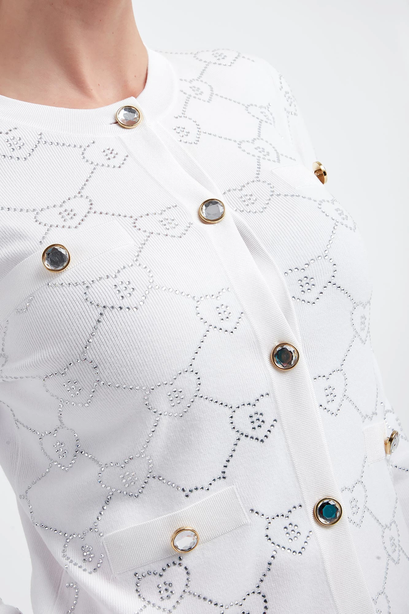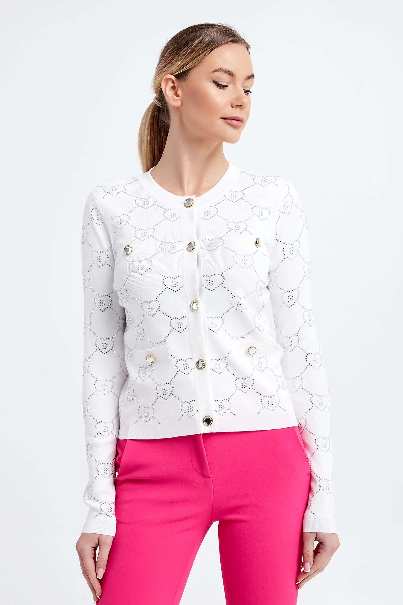 Kardigan marki Blugirl Blumarine w białym kolorze. Wykonany z elastycznej wiskozowej dzianiny swetrowej. Dekolt typu v-neck. Z przodu i na rękawach monogram marki wykonany ze srebrnych cyrkonii. Model z czterema patkami imitującymi kieszenie. Na linii karku logo marki. Zapinany za pomocą złotych biżuteryjnych guzików z kryształem. Całość wykończona prążkowanymi ściągaczami. Fason typu slim.