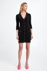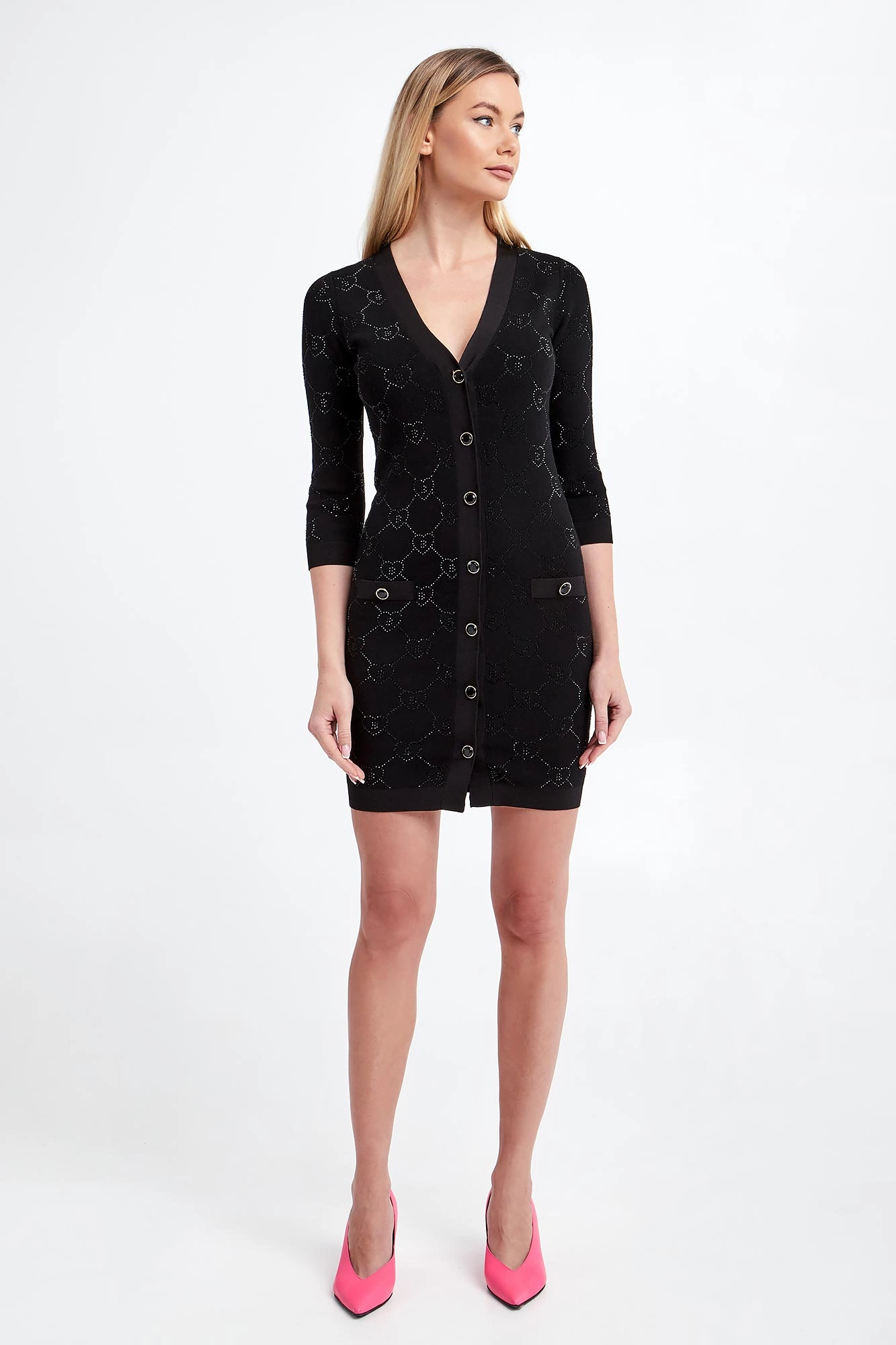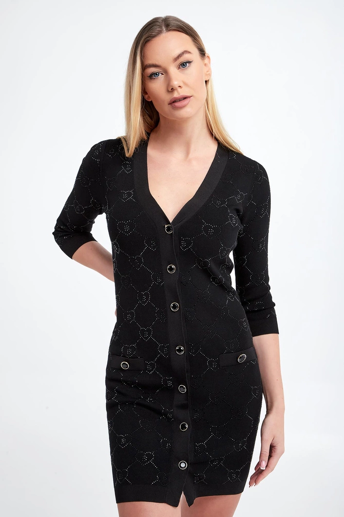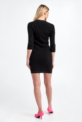 Sukienka marki Blugirl Blumarine w czarnym kolorze. Wykonana z elastycznej wiskozowej dzianiny swetrowej. Dekolt typu v-neck. Z przodu i na rękawach monogram marki wykonany z cyrkonii. Na linii karku logo marki. Zapinana za pomocą złotych biżuteryjnych guzików z kryształem. Rękawy o długości 3/4 i dół zakończone ściągaczami. Po bokach patki imitujące kieszenie. Fason typu slim, długość mini.