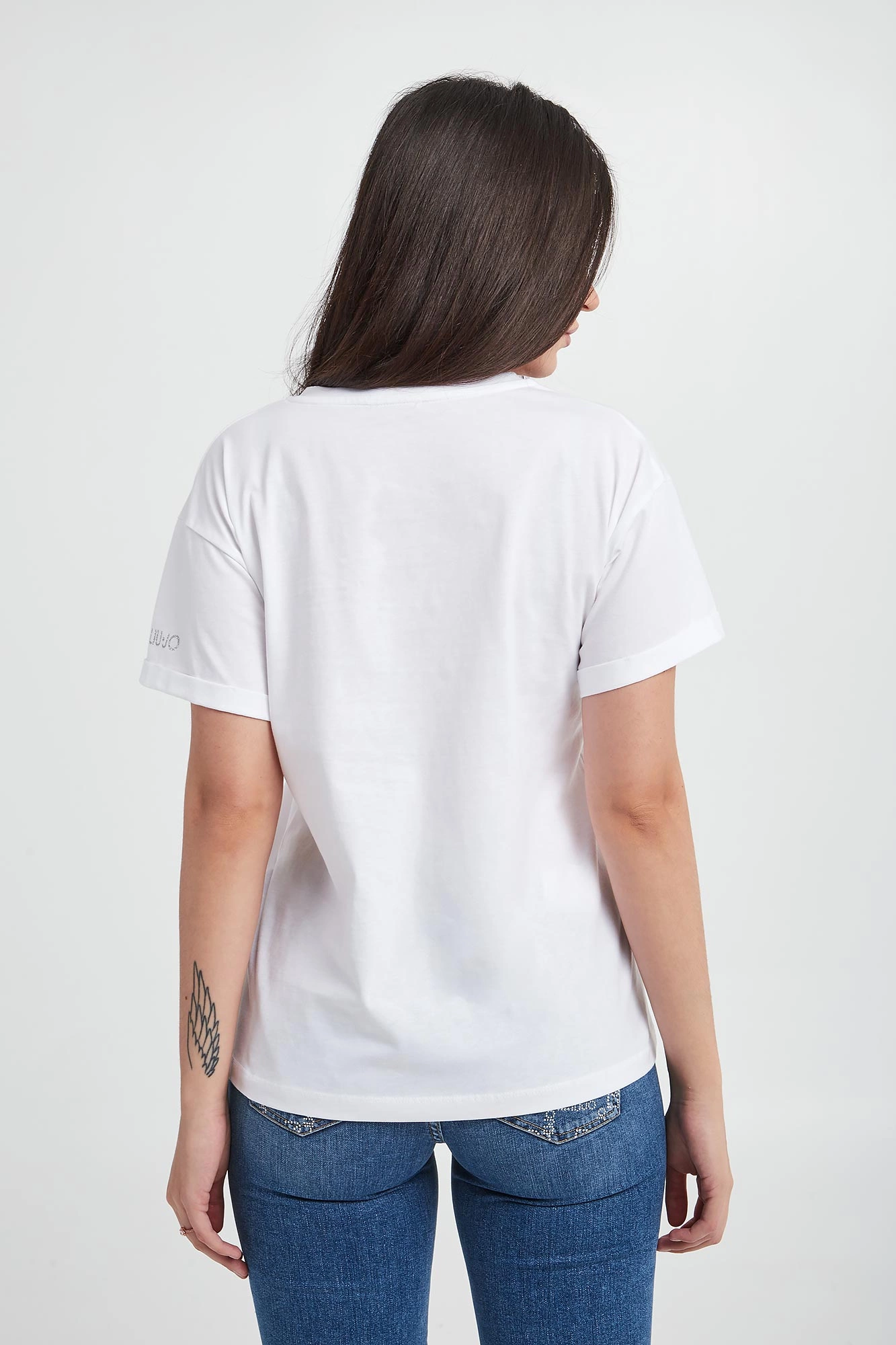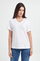 T-shirt marki Liu Jo w białym kolorze. Wykonany z bawełny. Dekolt v-neck. Krótkie rękawy z wywinięciem. Dół wykończony lamówką. Lewy rękaw wykończony błyszczącym nadrukiem z nazwą marki. Fason typu relaxed.