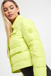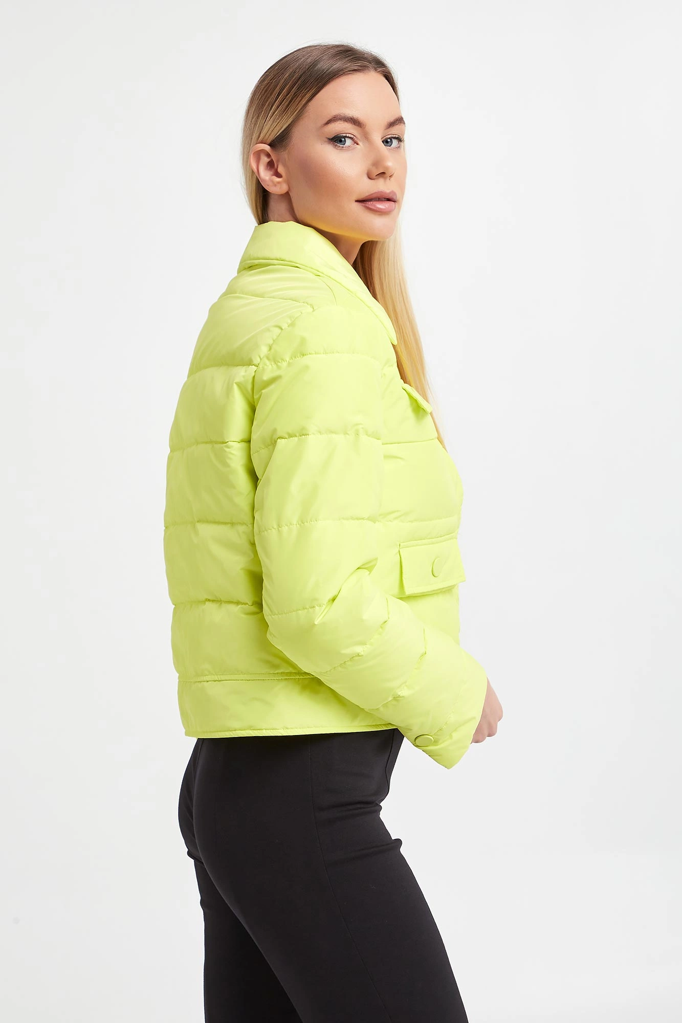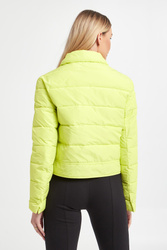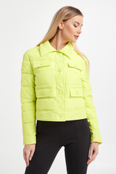Krótka kurtka marki Ermanno Firenze w limonkowym kolorze. Na całości poziome pikowania. Syntetyczne wypełnienie. Dekolt wykończony kołnierzem. Na przodzie cztery patki imitujące kieszenie. Zapinana za pomocą zatrzasków. Rękawy z zapinanym rozcięciem. Fason typu regular.