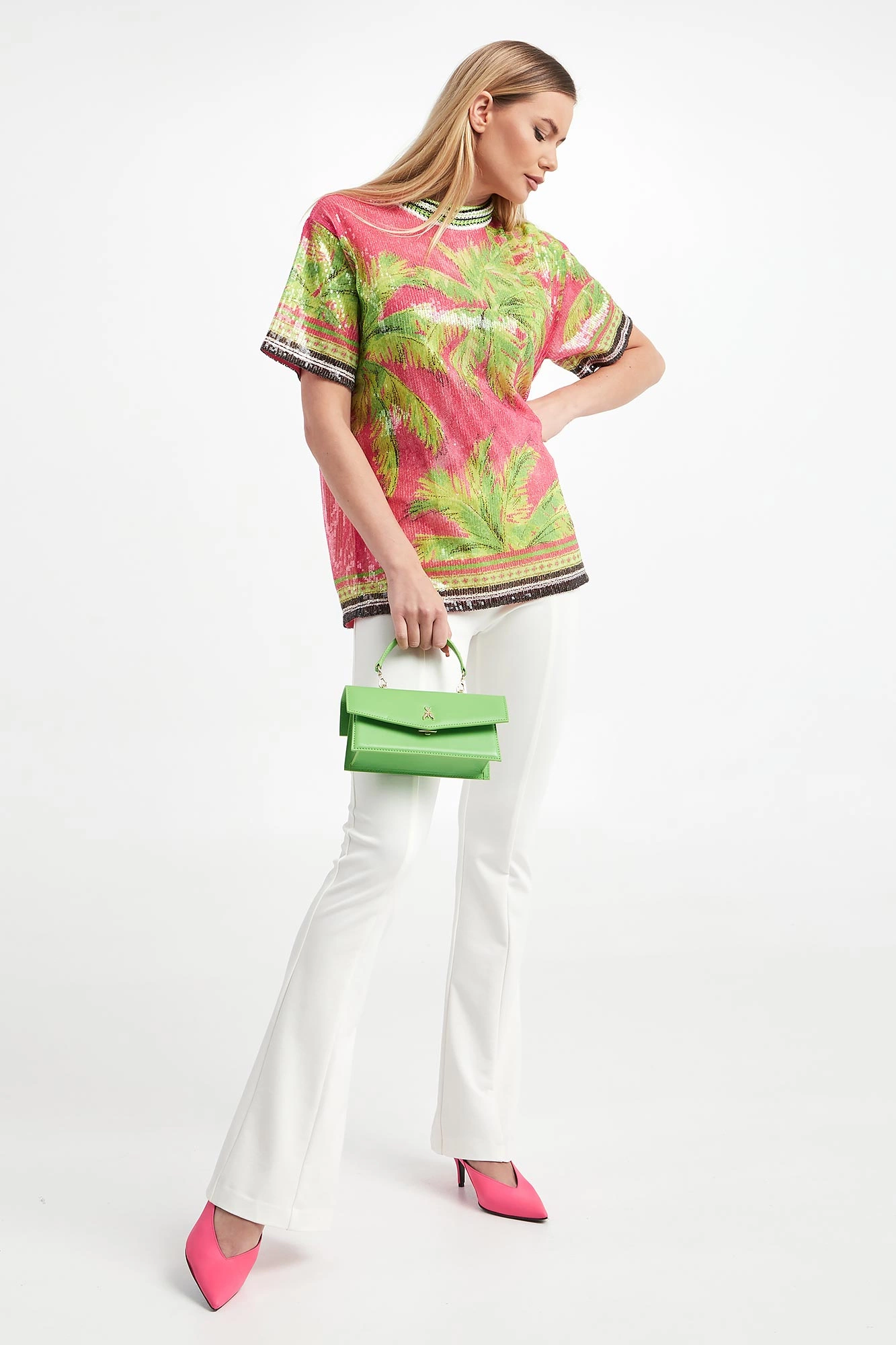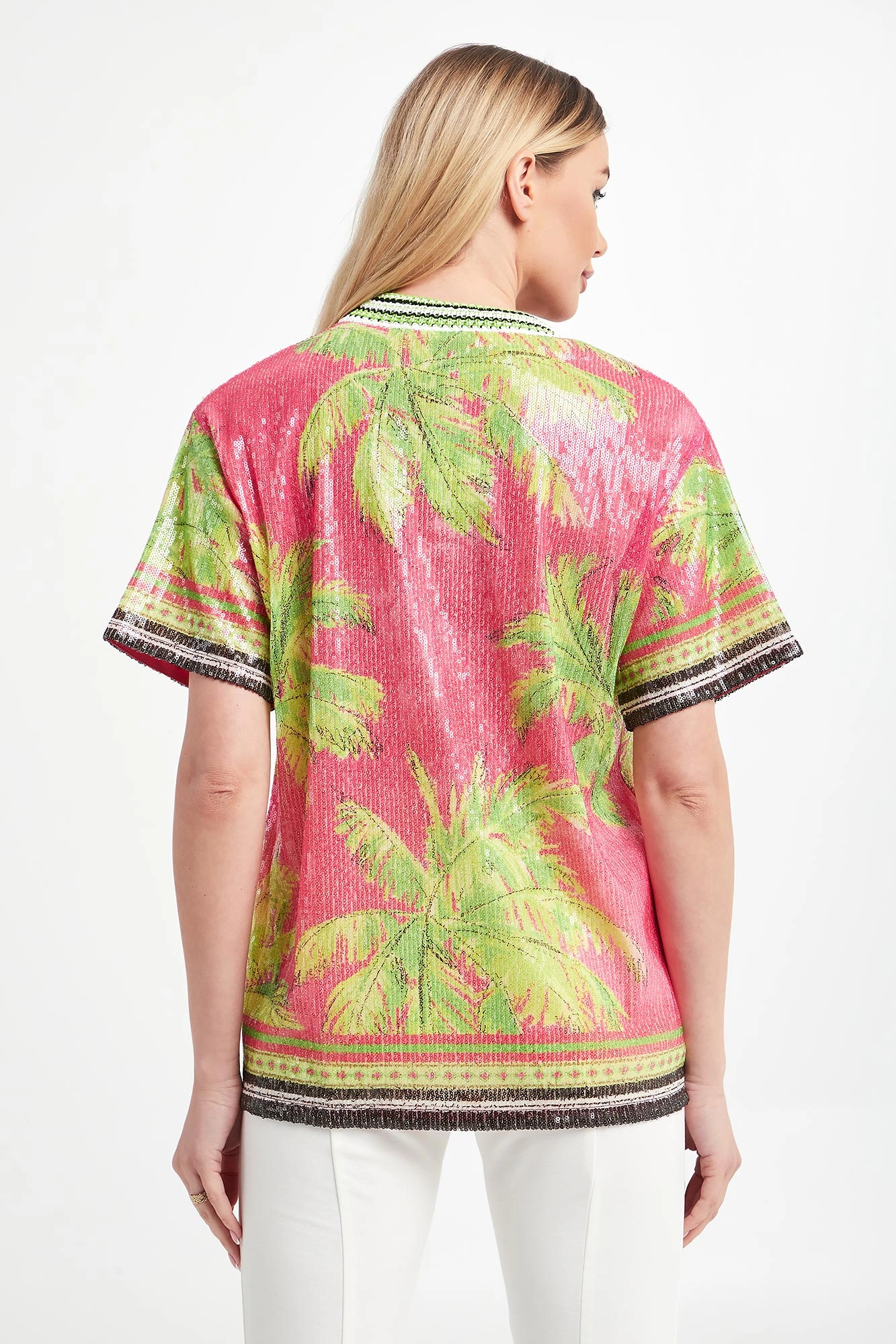 T-shirt marki Ermanno Firenze w różowym kolorze. Całość pokryta cekinami i nadrukiem z motywem palm. Dekolt o-neck wykończony ozdobnym kolorowym warkoczowym splotem. Fason typu relaxed.