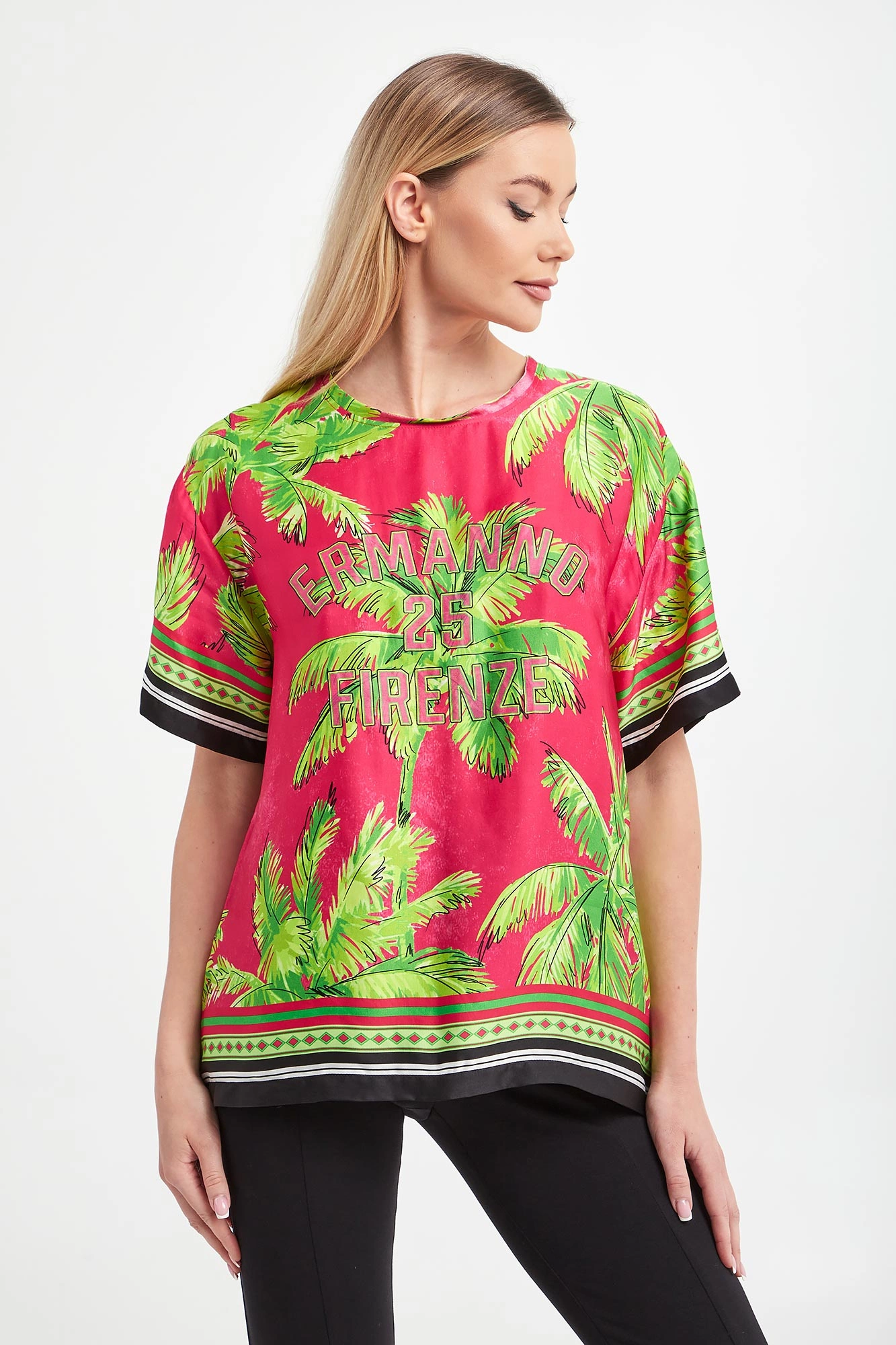 T-shirt marki Ermanno Firenze w fuksjowym kolorze. Wykonany ze stuprocentowej, satynowej wiskozy. Na całości nadruk z motywem palm. Fason typu oversize. Rękawy i dół wykończone dwukolorowym lampasem. Z przodu nadruk nazwy marki. Dekolt typu o-neck.