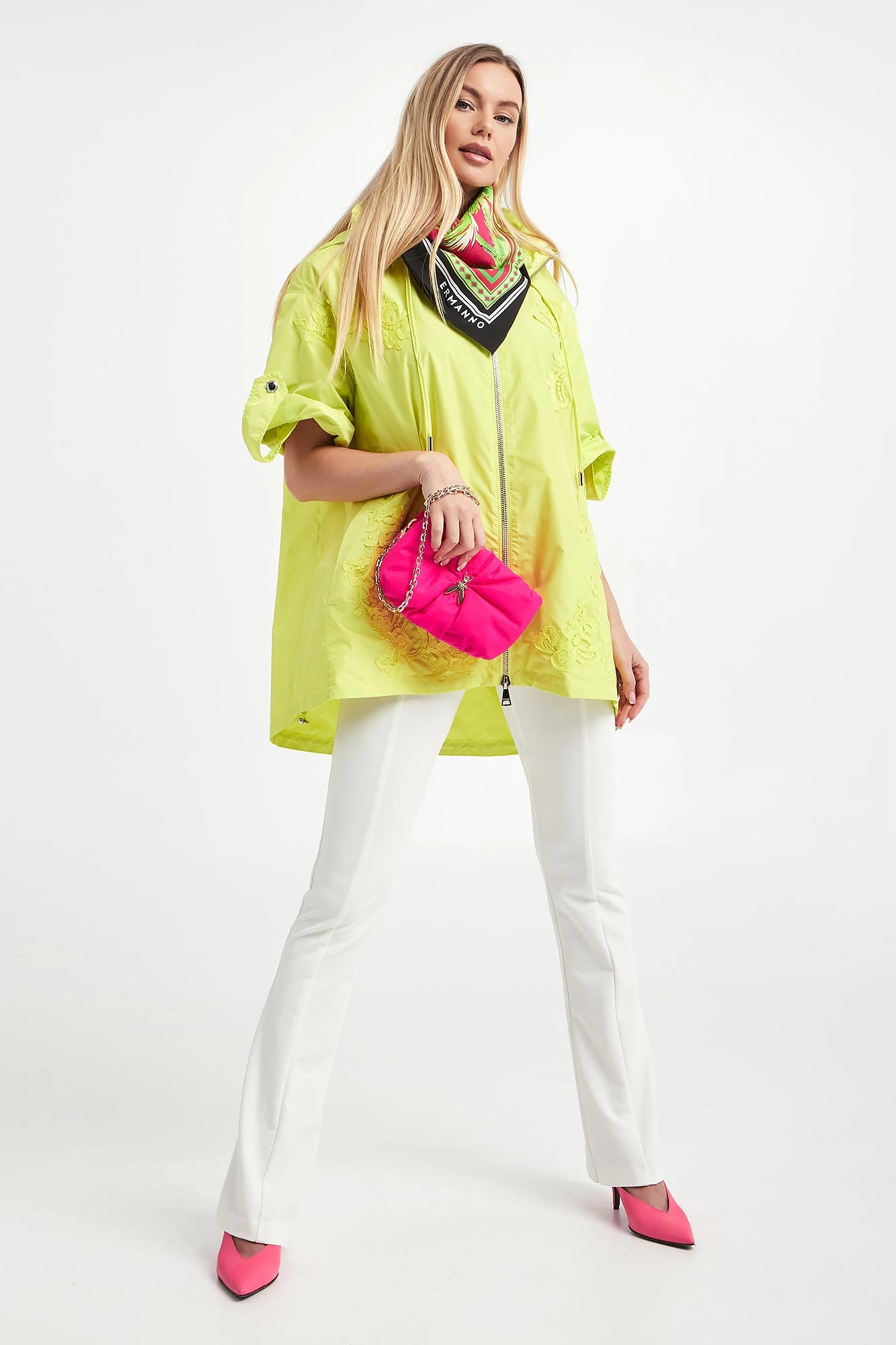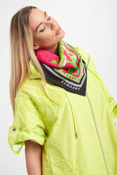 Chusta marki Ermanno Firenze w fuksjowym kolorze. Wykonany ze stuprocentowej, satynowej wiskozy. Na całości nadruk z motywem palm. Wykończony granatowym lampasem z nadrukiem nazwy marki.