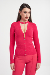 - Głęboki dekolt v-neck z ozdobnymi łańcuszkami.