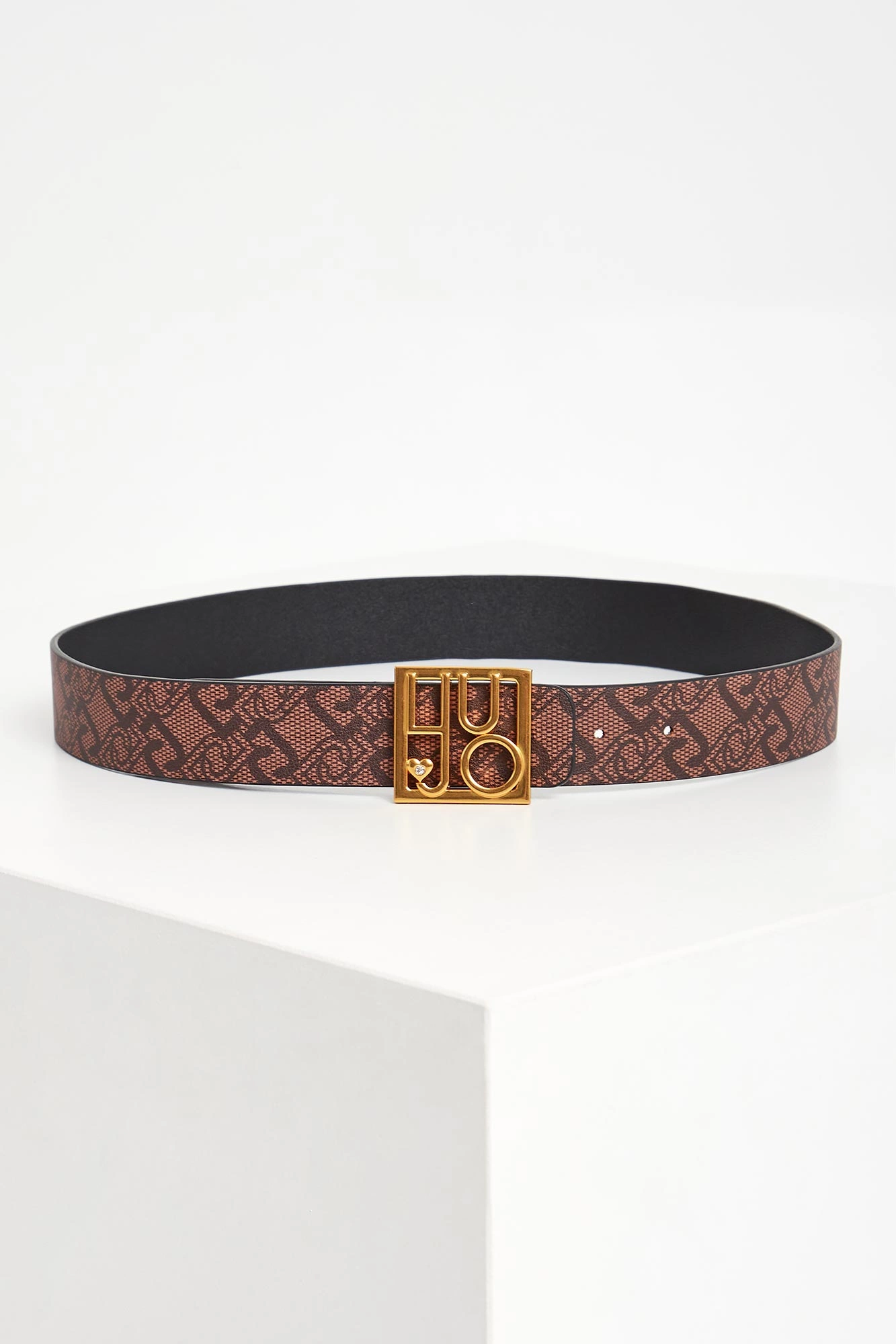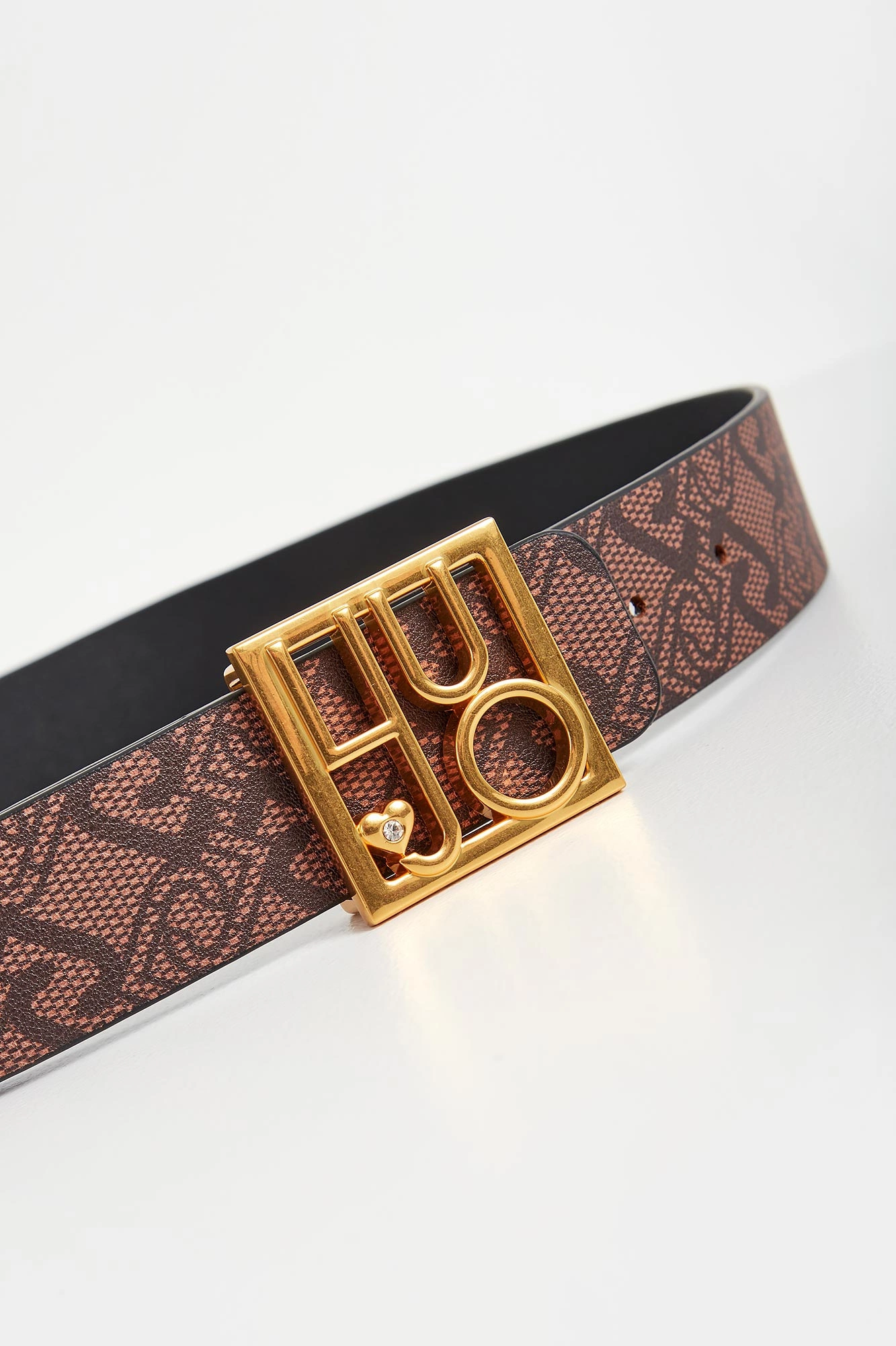 - Regulowana, złota klamra z logo i sercem.