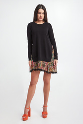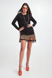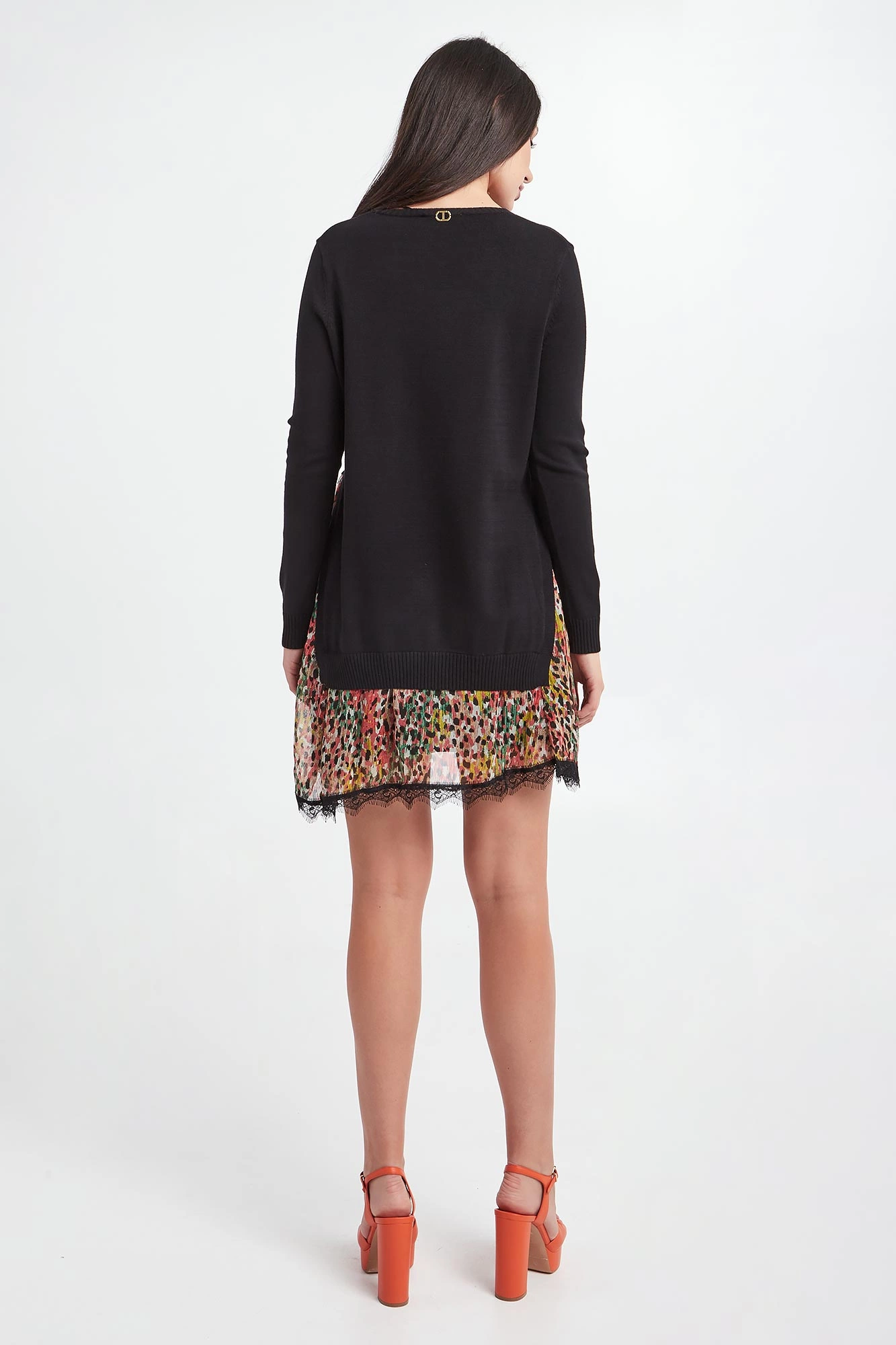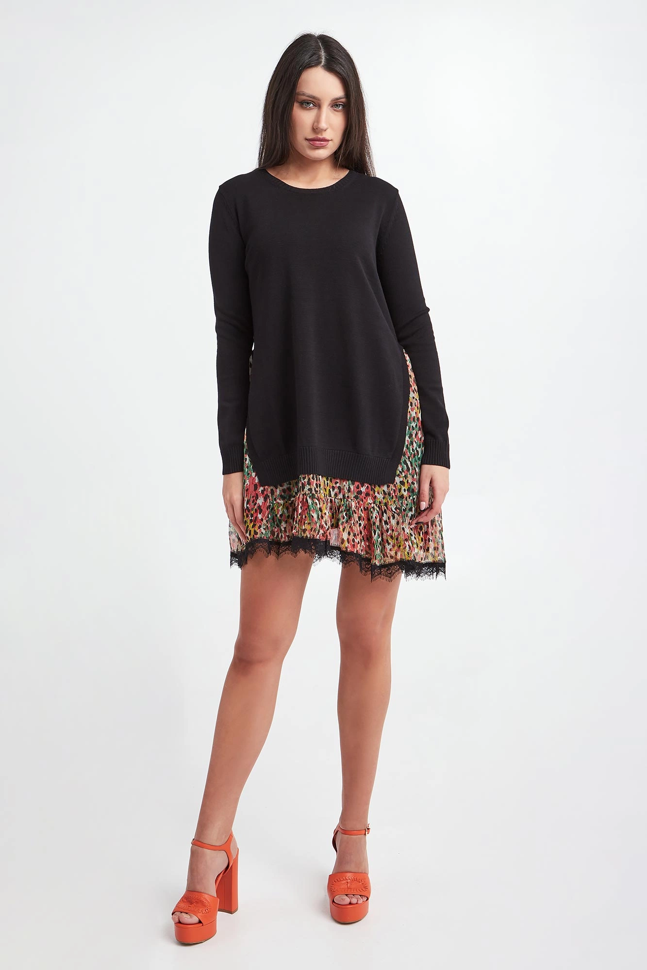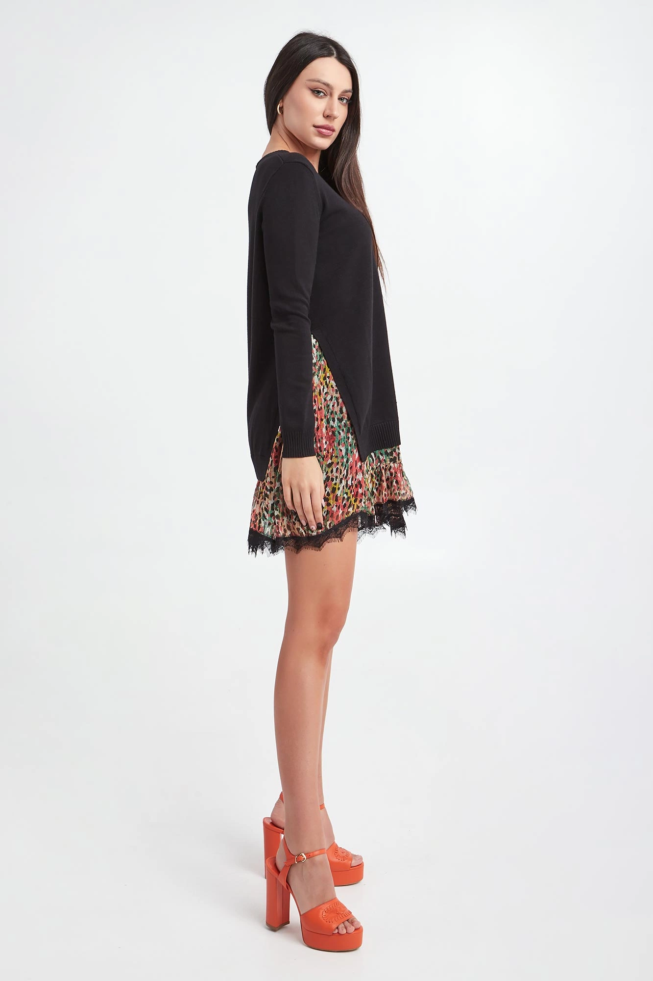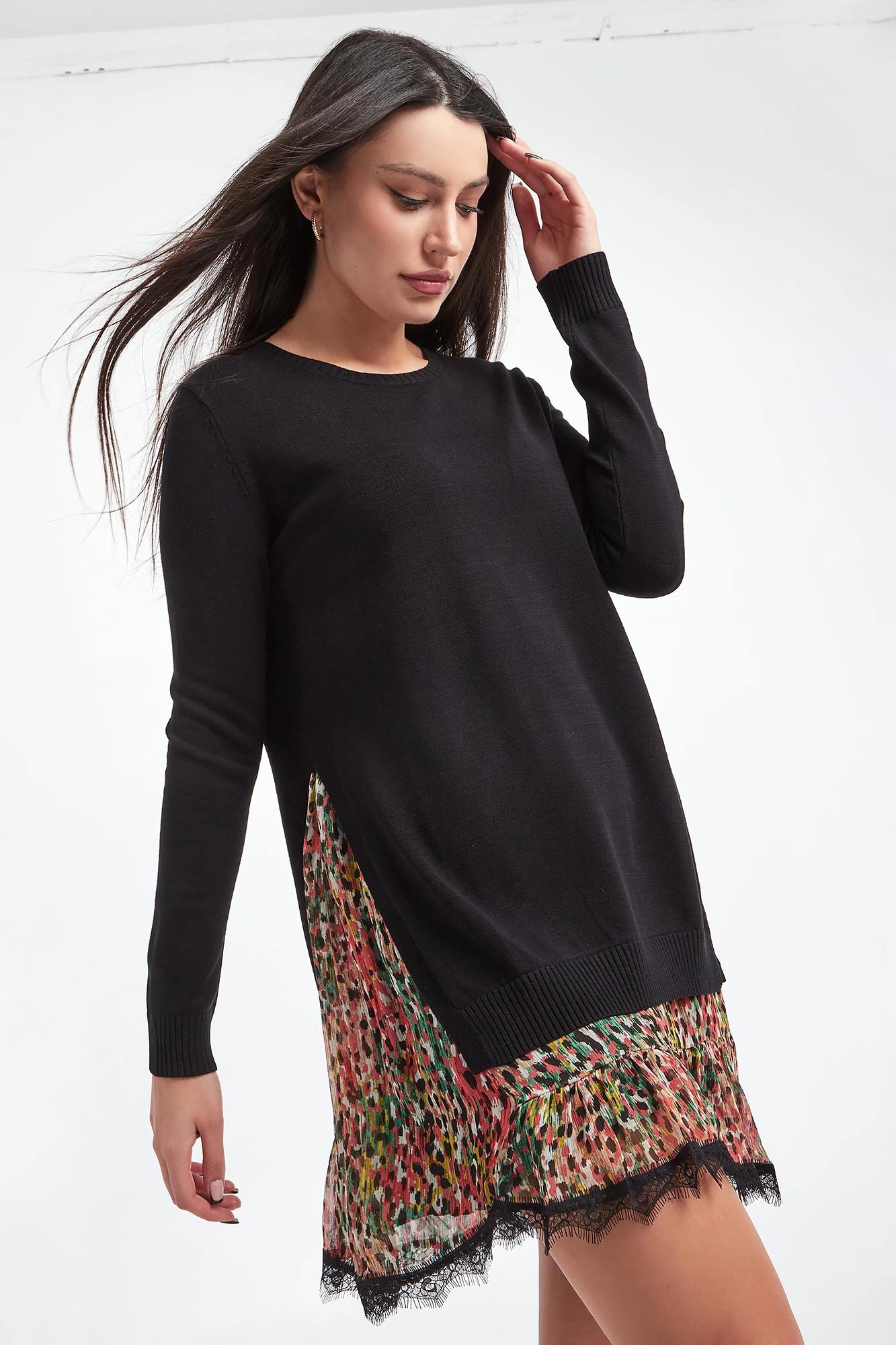 - Dół wykończony materiałem zwierzęcym wzorem i koronką.