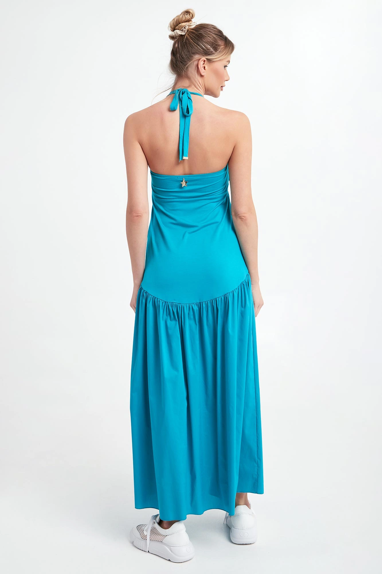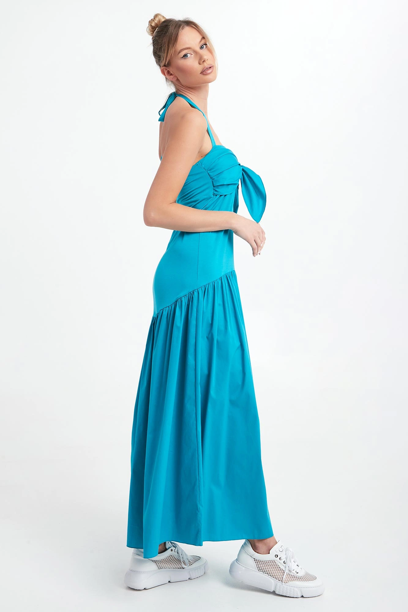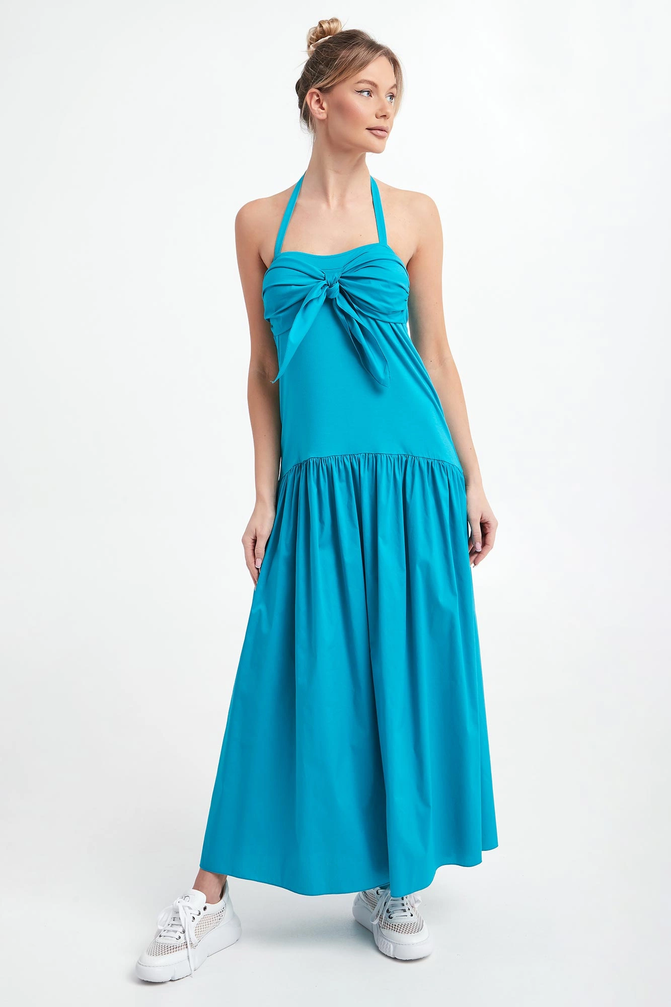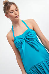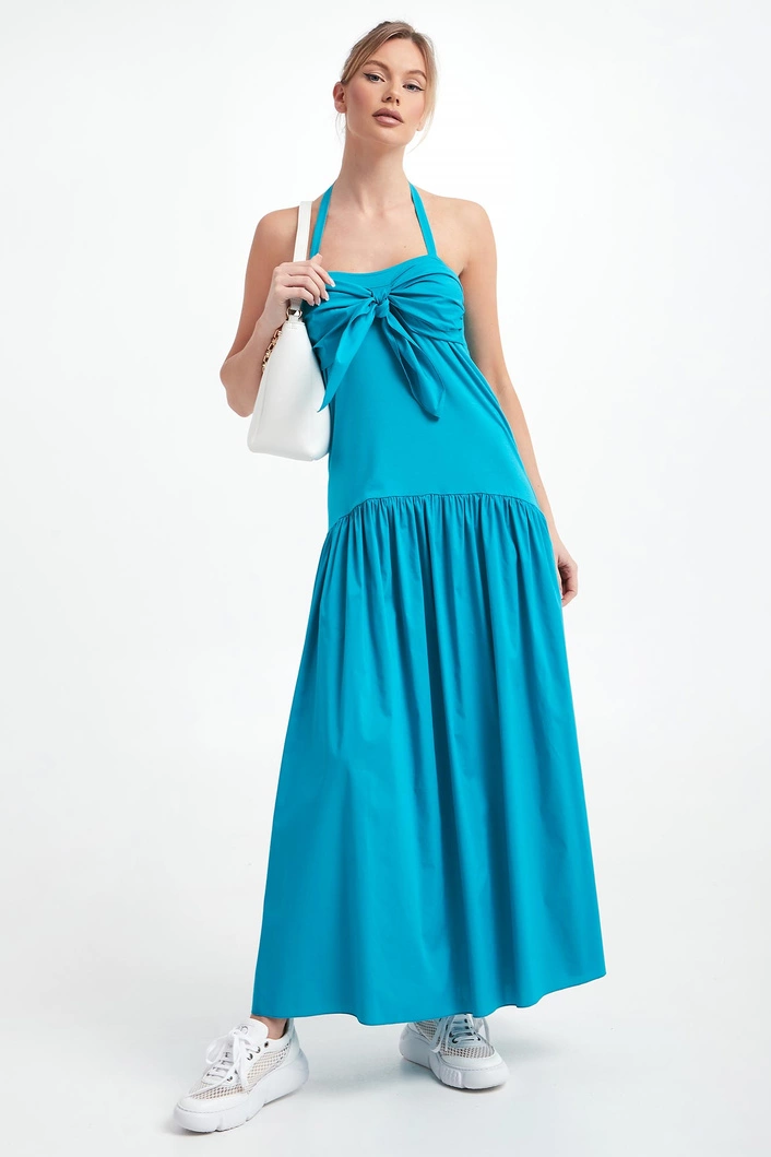 - Prosty dekolt z wiązaniem na szyi.
