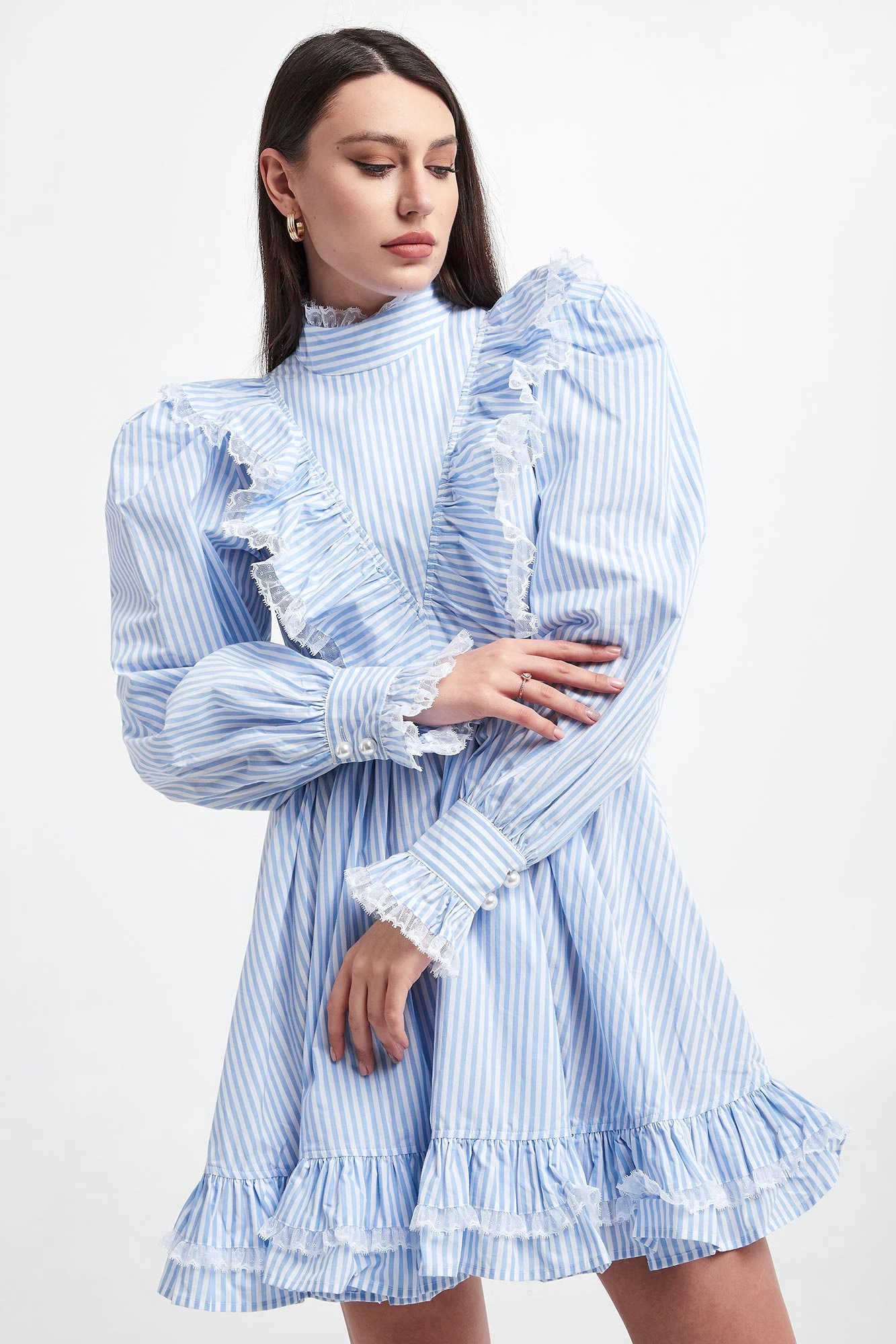 - Wykończenie falbanami z koronką.
