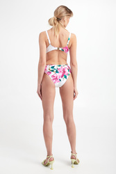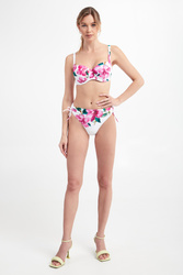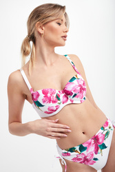 Strój kąpielowy dwuczęściowy marki Roidal w białym kolorze. Na całości fuksjowy, egzotyczny wzór.