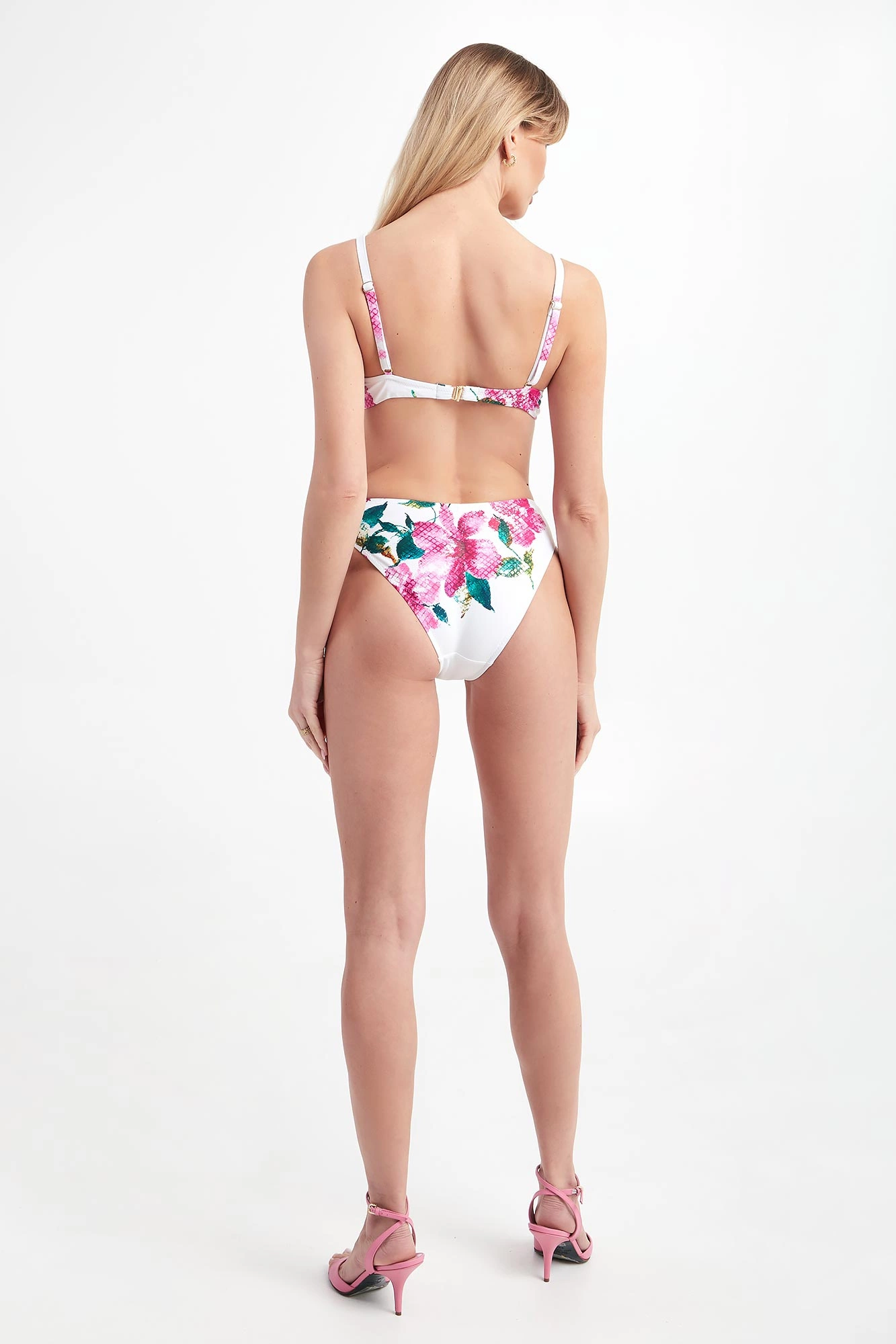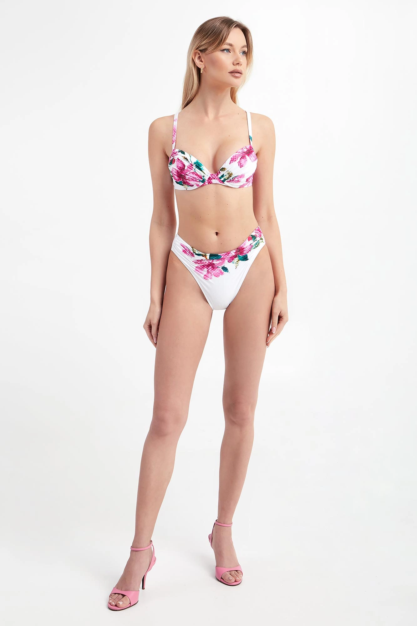 Strój kąpielowy dwuczęściowy marki Roidal w białym kolorze. Na całości fuksjowy, egzotyczny wzór.