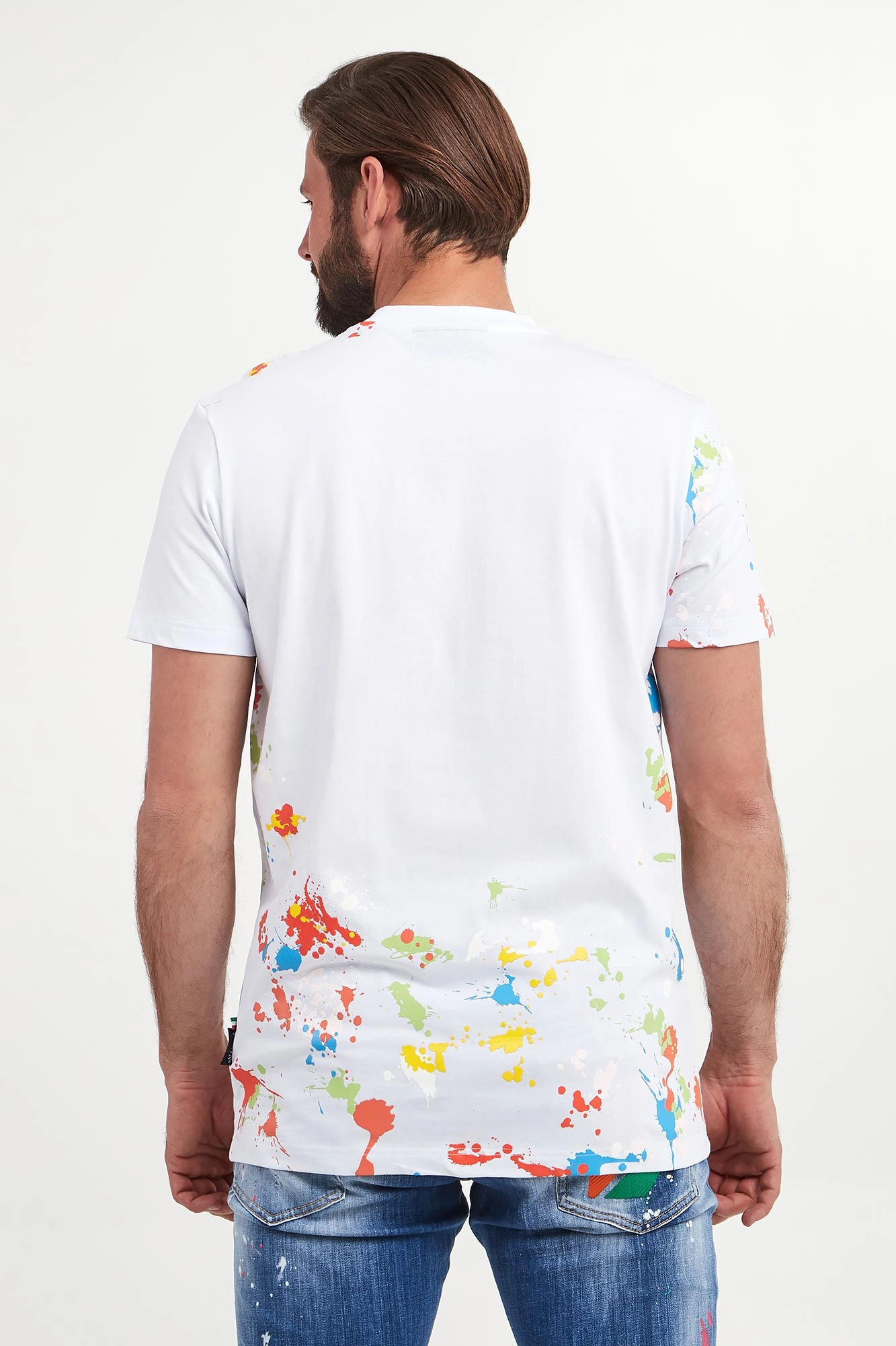 - Wielokolorowy nadruk z motywem czaszki i efektem plam z farby.