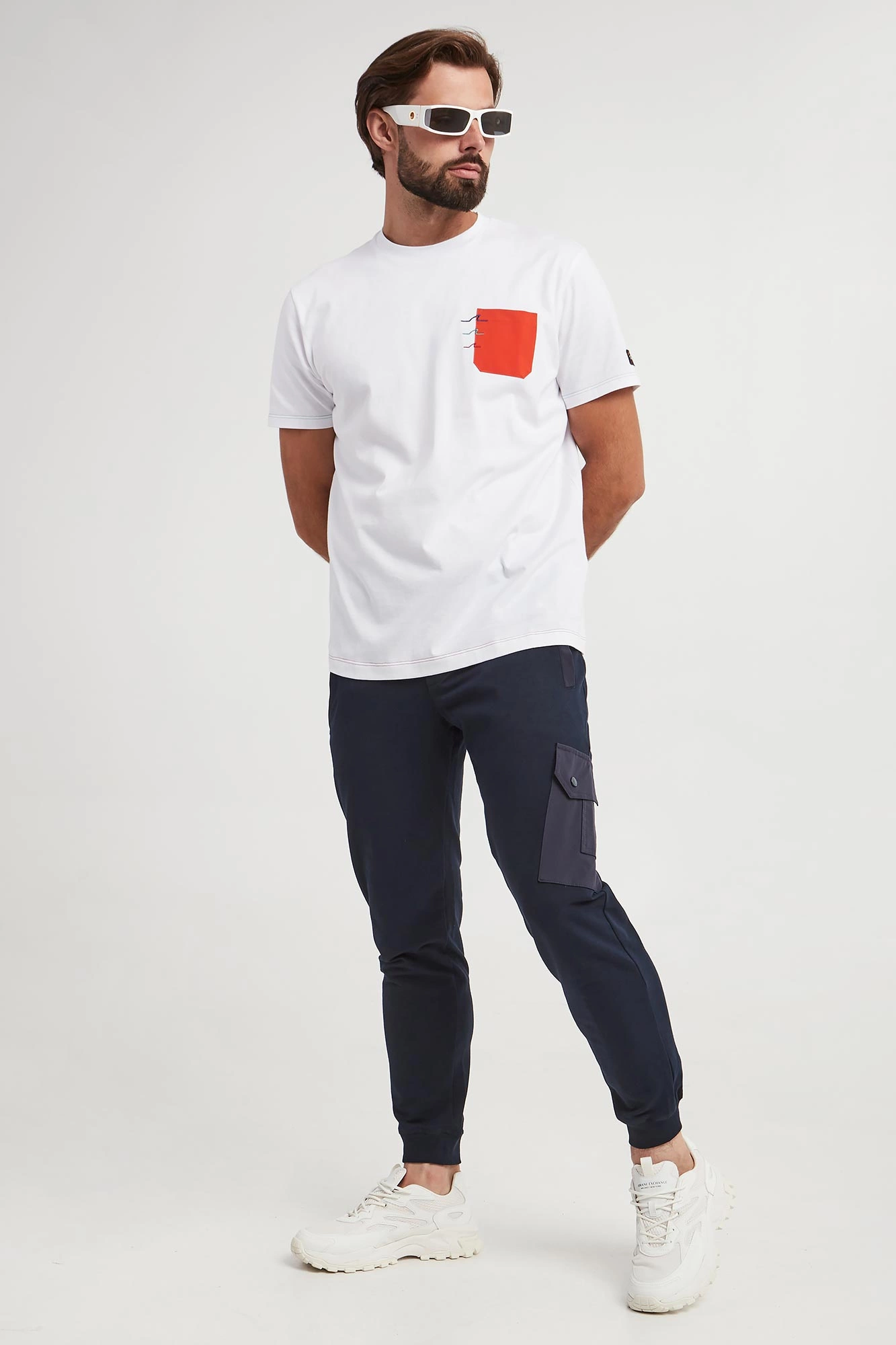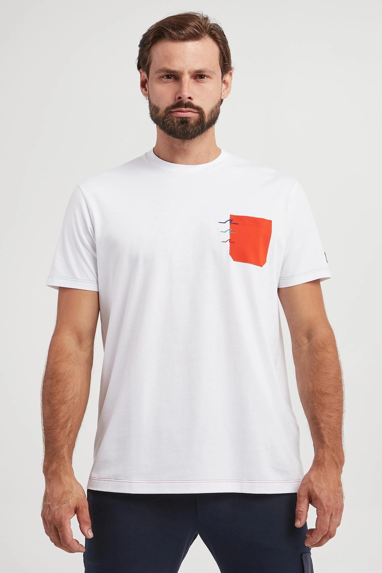 - Pomarańczowa kieszeń na piersi z haftem.
