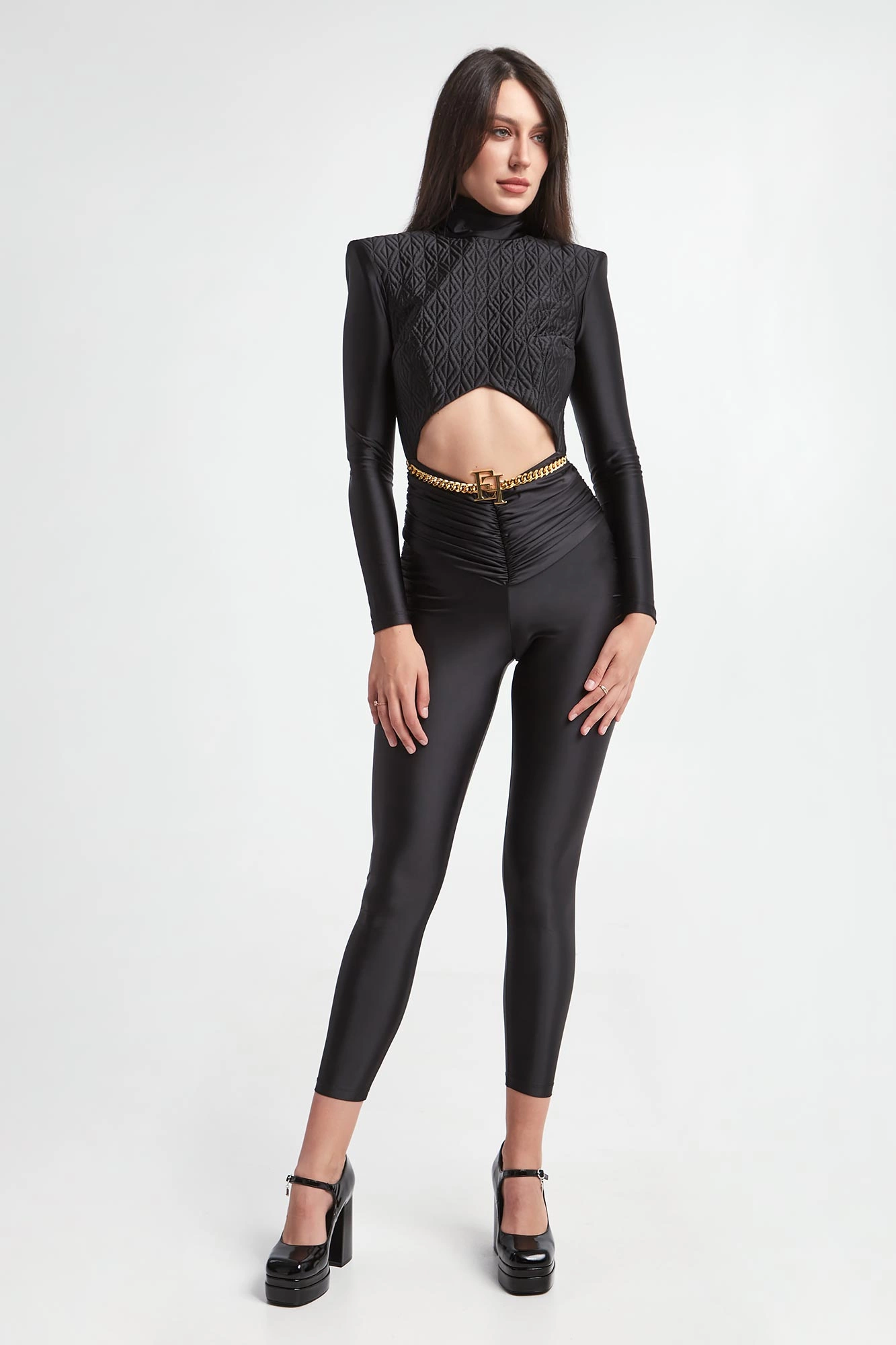 - Wycięcie na brzuchu ozdobione złotym łańcuchem z monogramem.