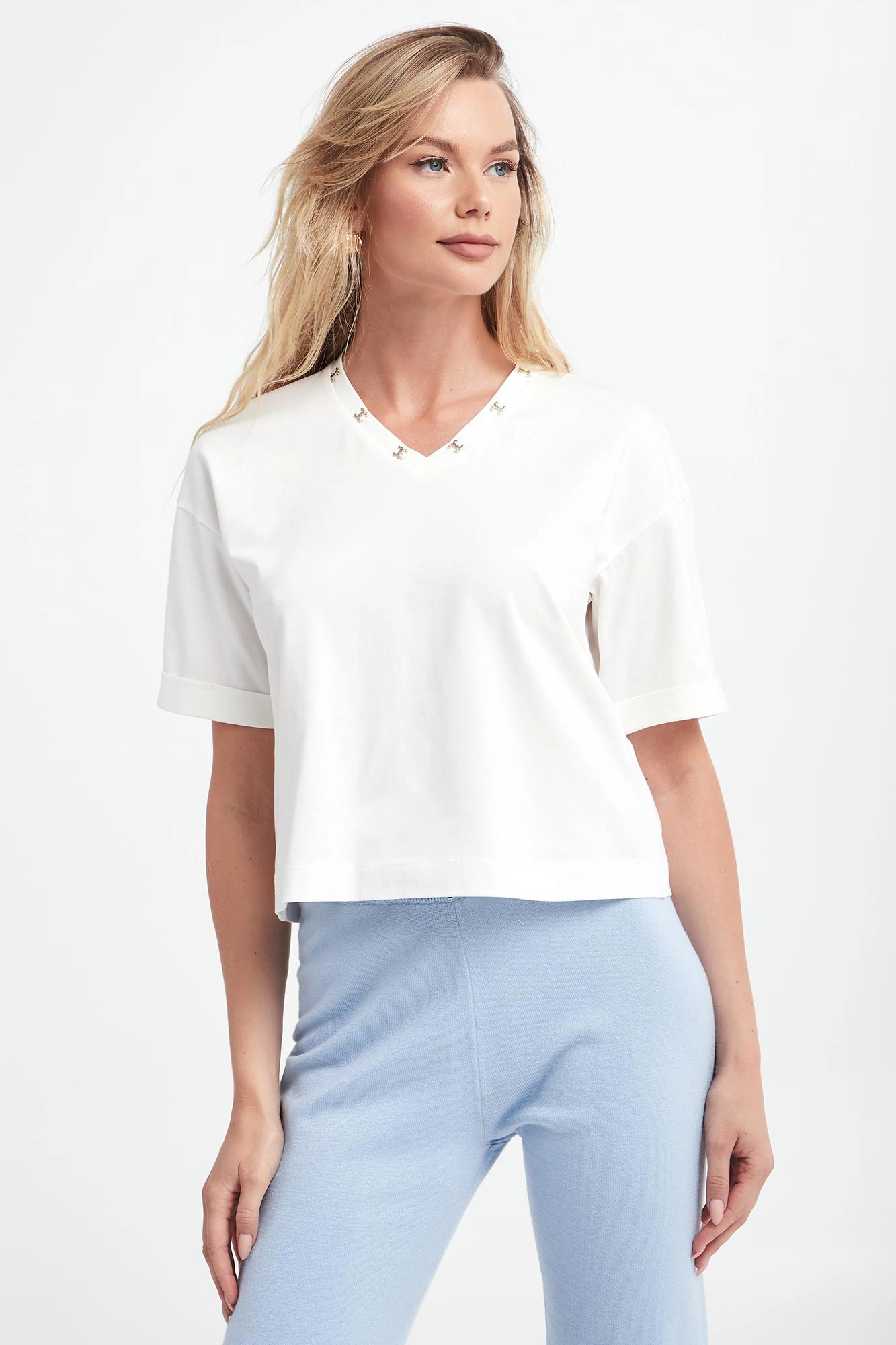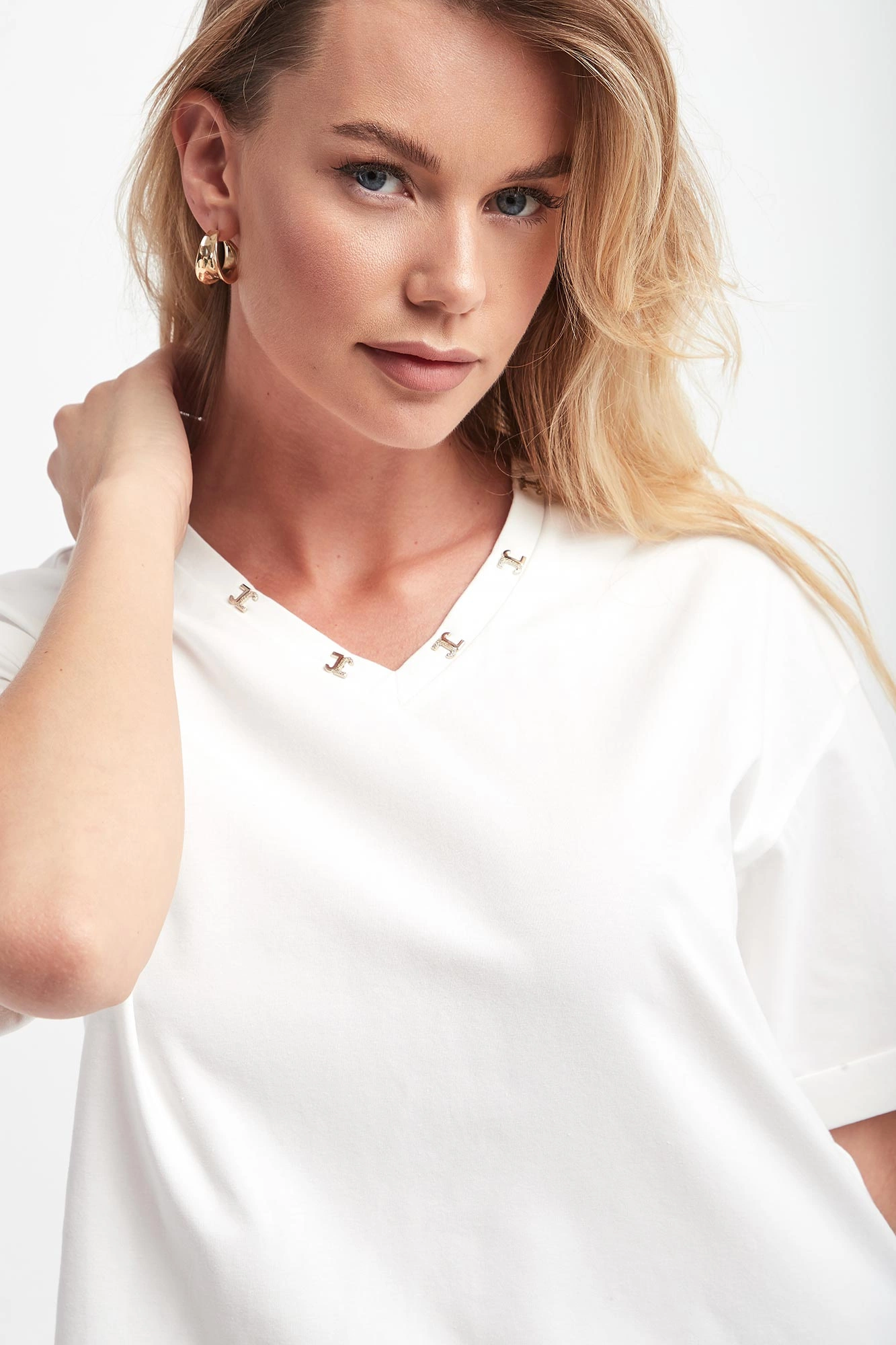 - Na dekolcie biżuteryjne aplikacje z logo.