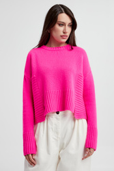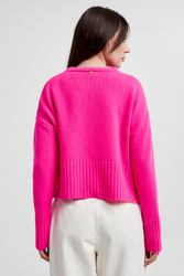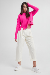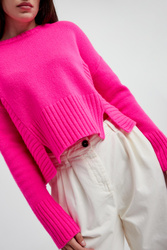 - Po bokach, u dołu, na rękawach i okrągłym dekolcie szerokie, prążkowane ściągacze.