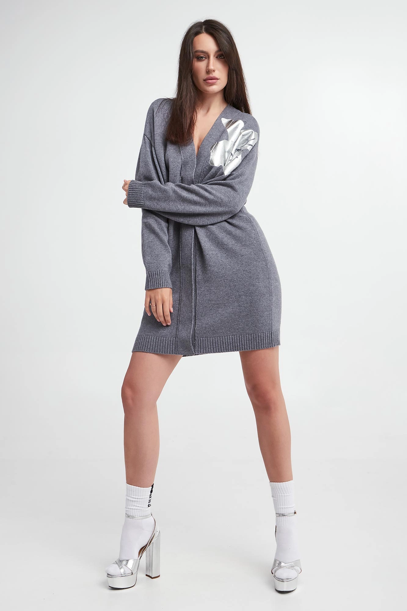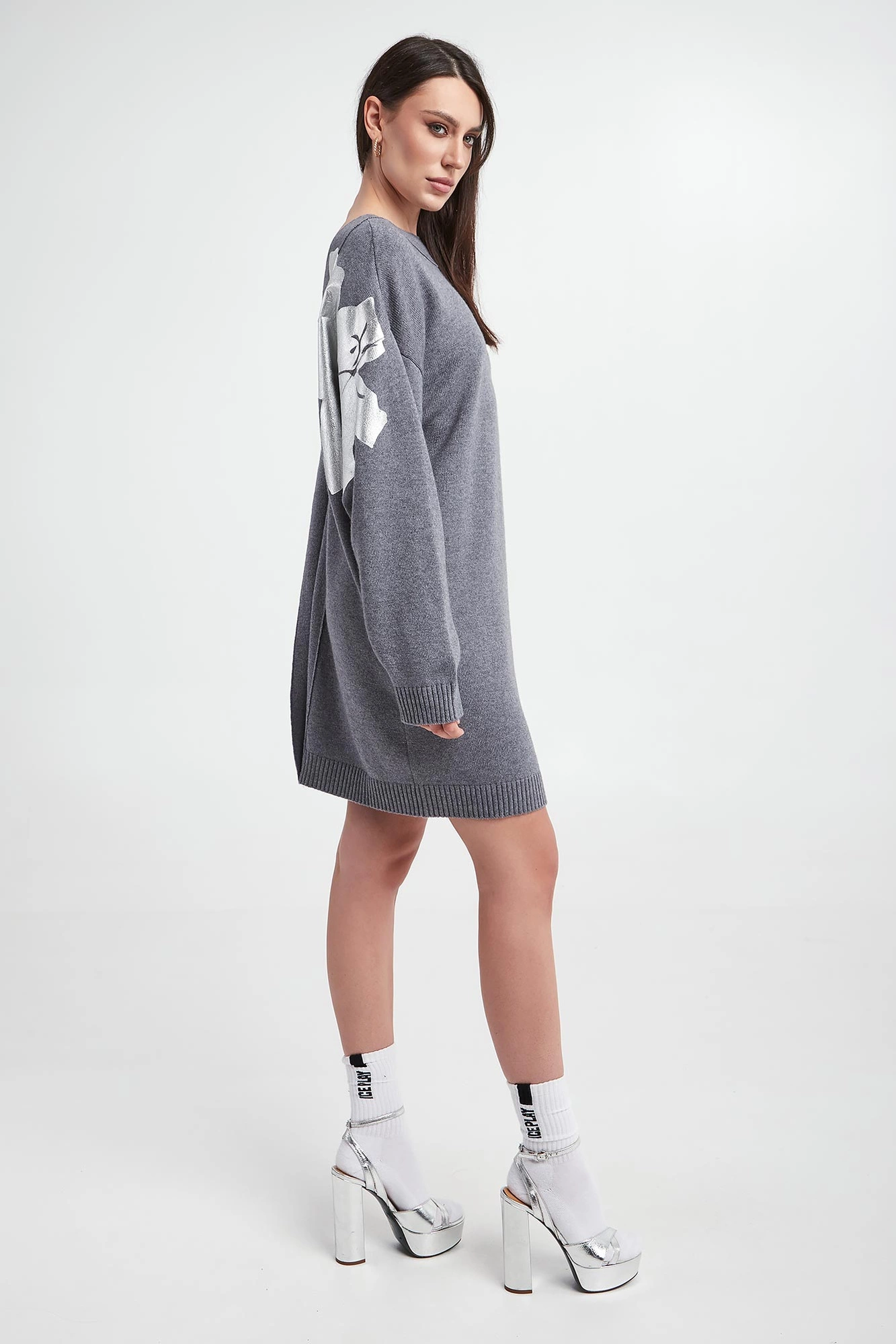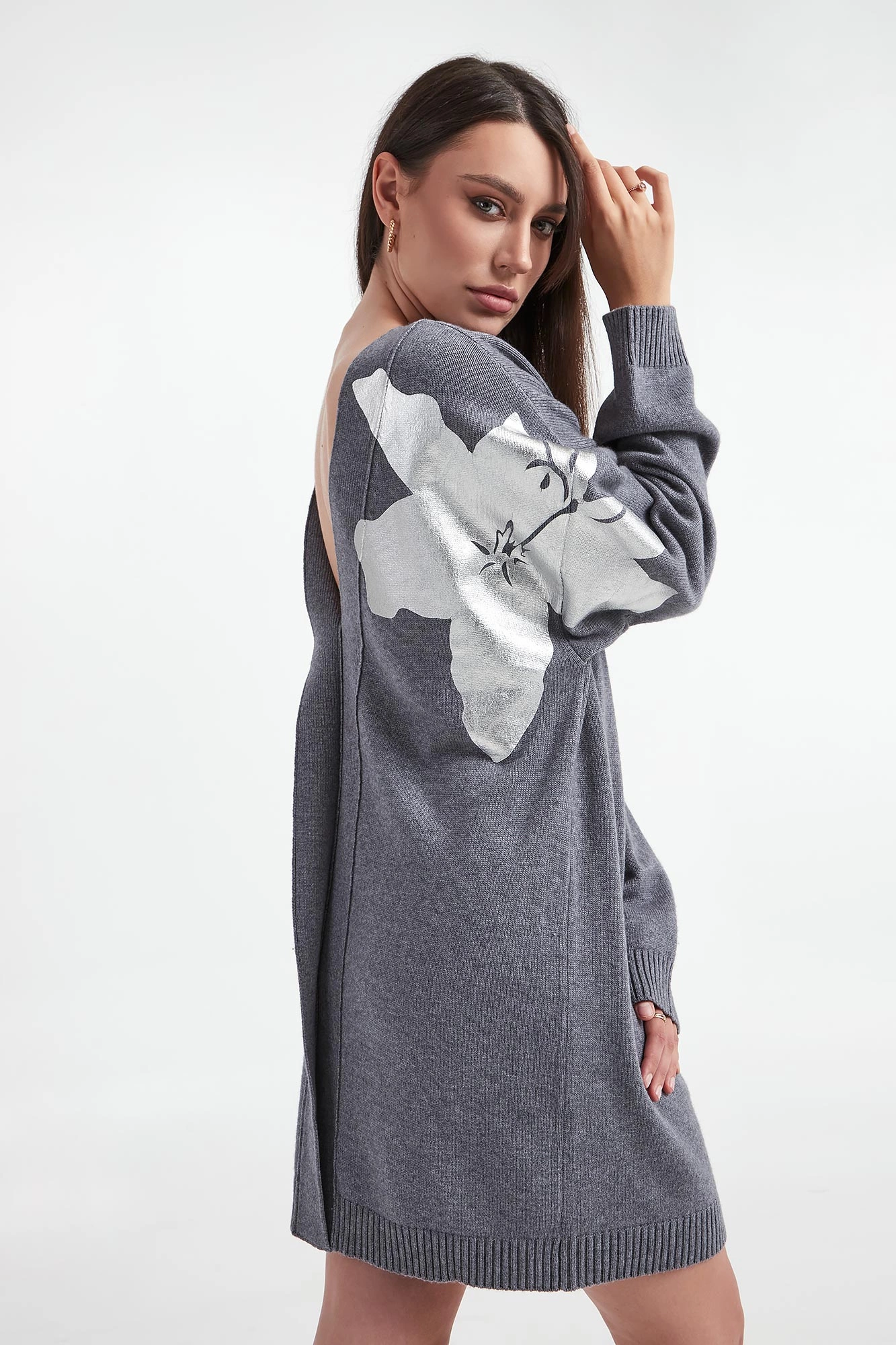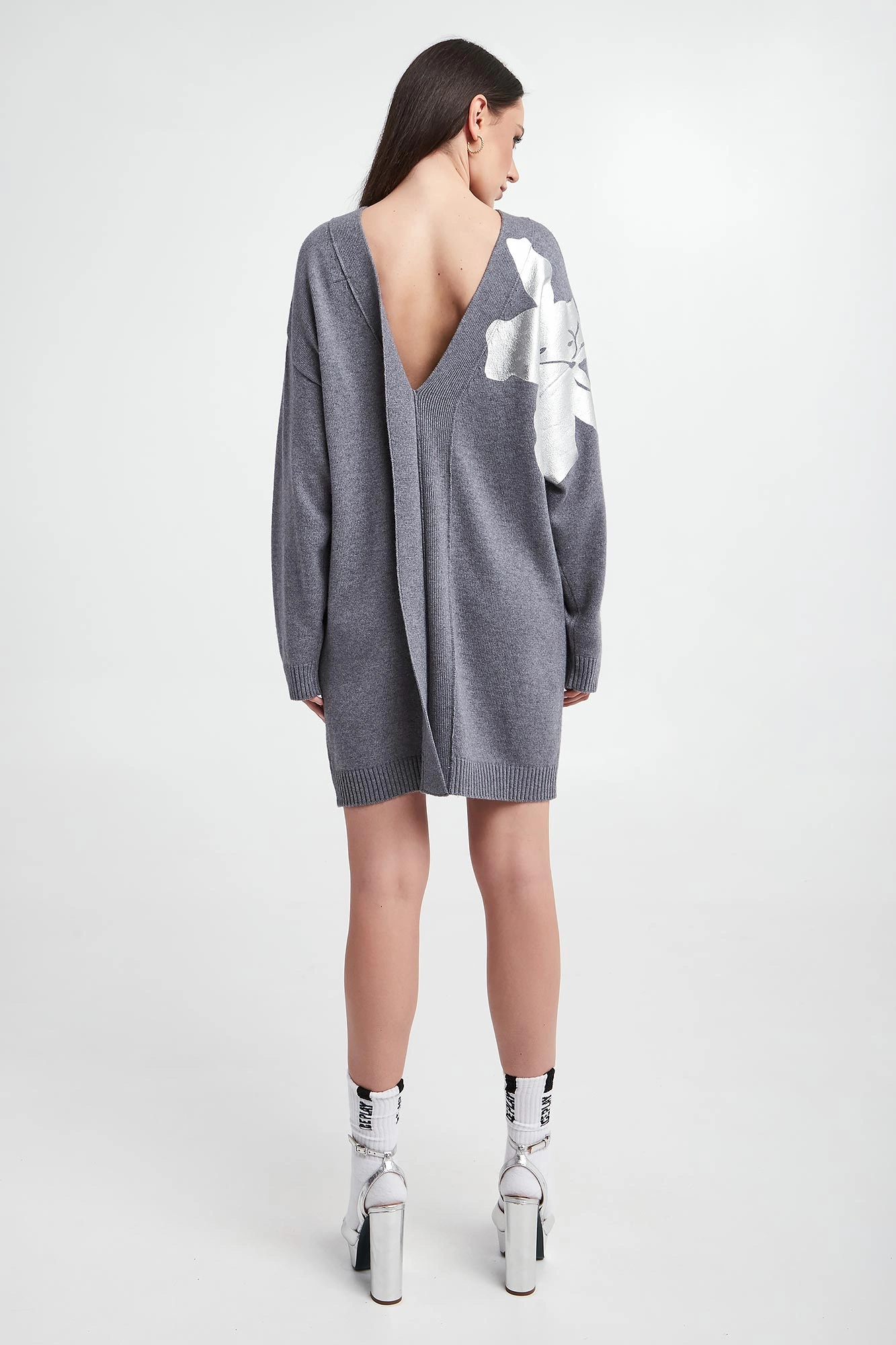 - Z tyłu głębokie wycięcie oraz srebrny nadruk z kwiatowym motywem.