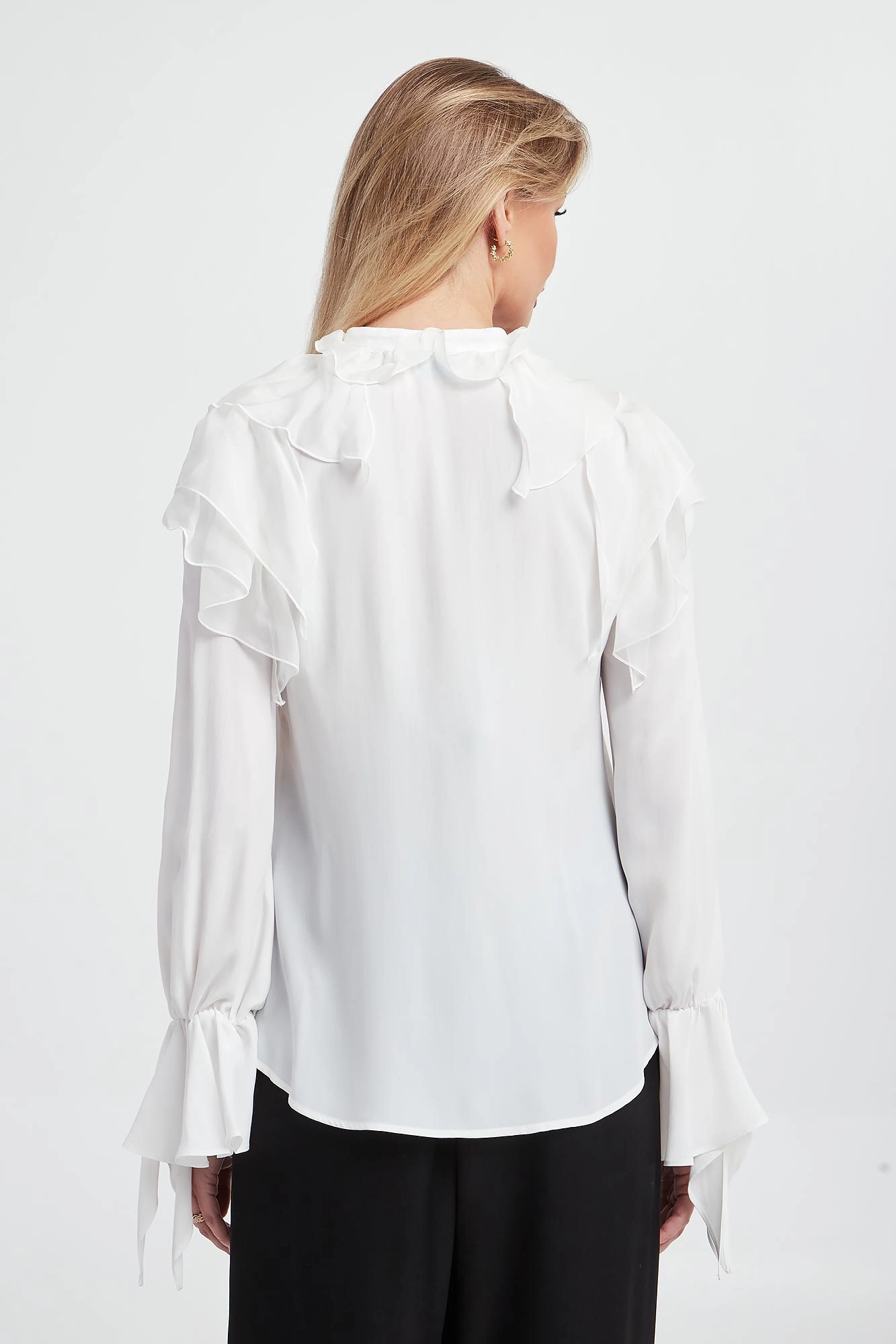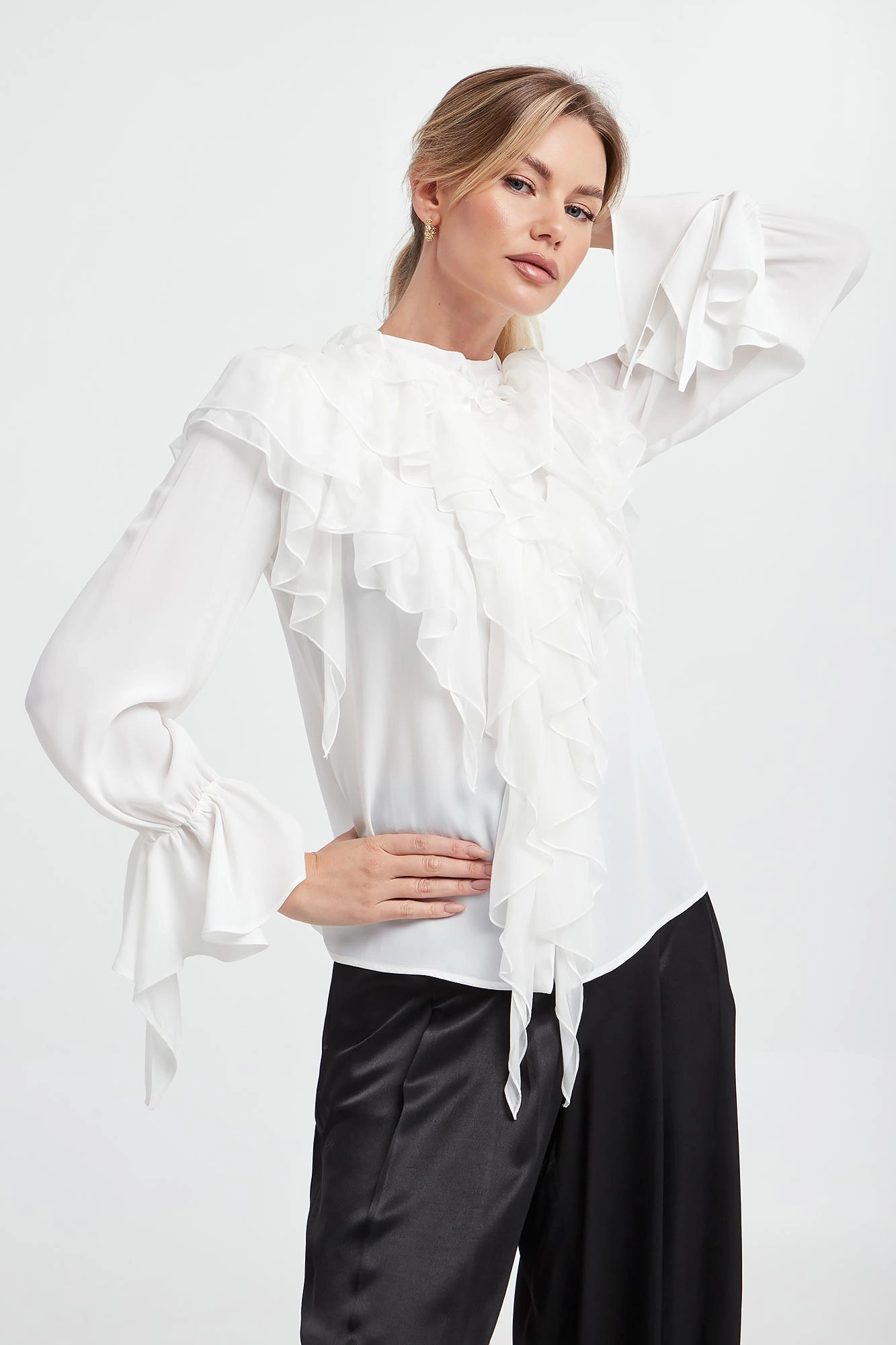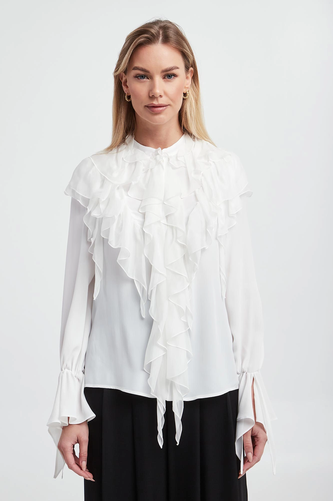 Piękna kobieca biała bluzka z żabotem. Materiał delikatnie transparentny. Wygląda tak samo, jak na zdjęciu. Rozmiar taki sam, jak podano w opisie: włoski i odpowiednik polski. Jestem bardzo zadowolona z tego zakupu. Szczerze polecam!