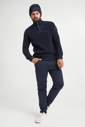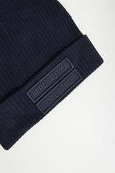 - Podwijany ściągacz z granatowym haftem z logo.