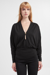 - Dekolt v-neck ozdobiony złotym, logowanym guzikiem oraz wycięciem w kształcie łzy.