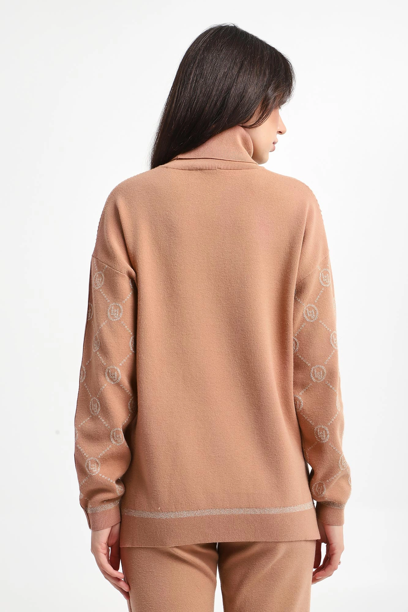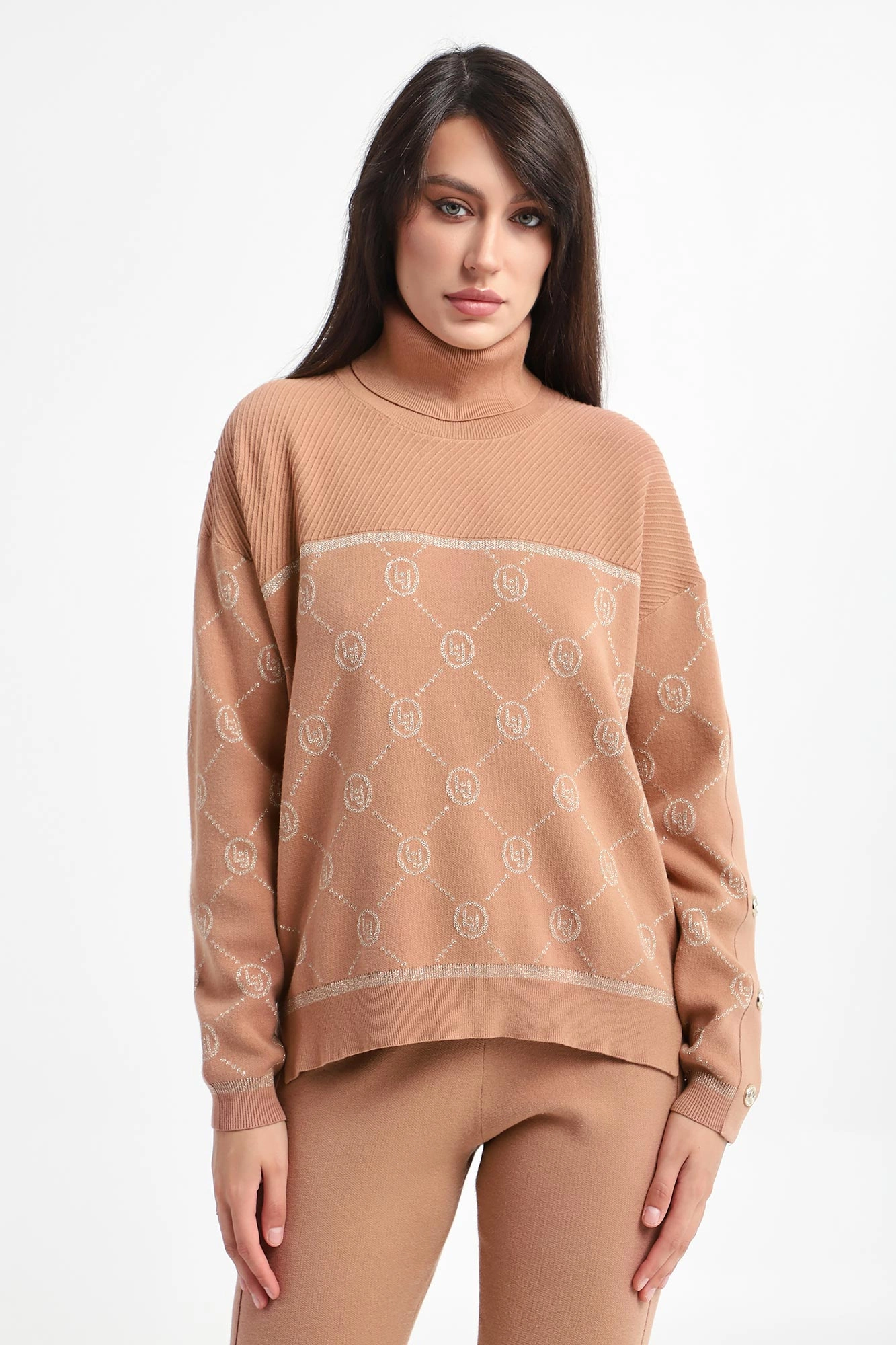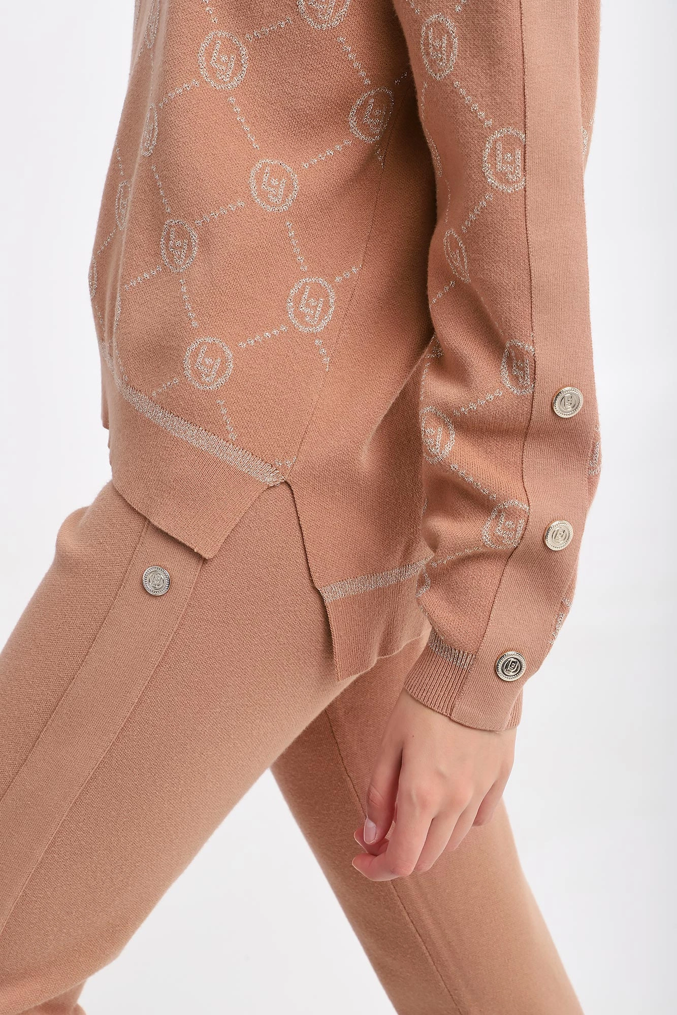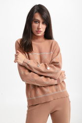 - Na całości złoty, przeszyty połyskującą nicią wzór z monogramem marki.