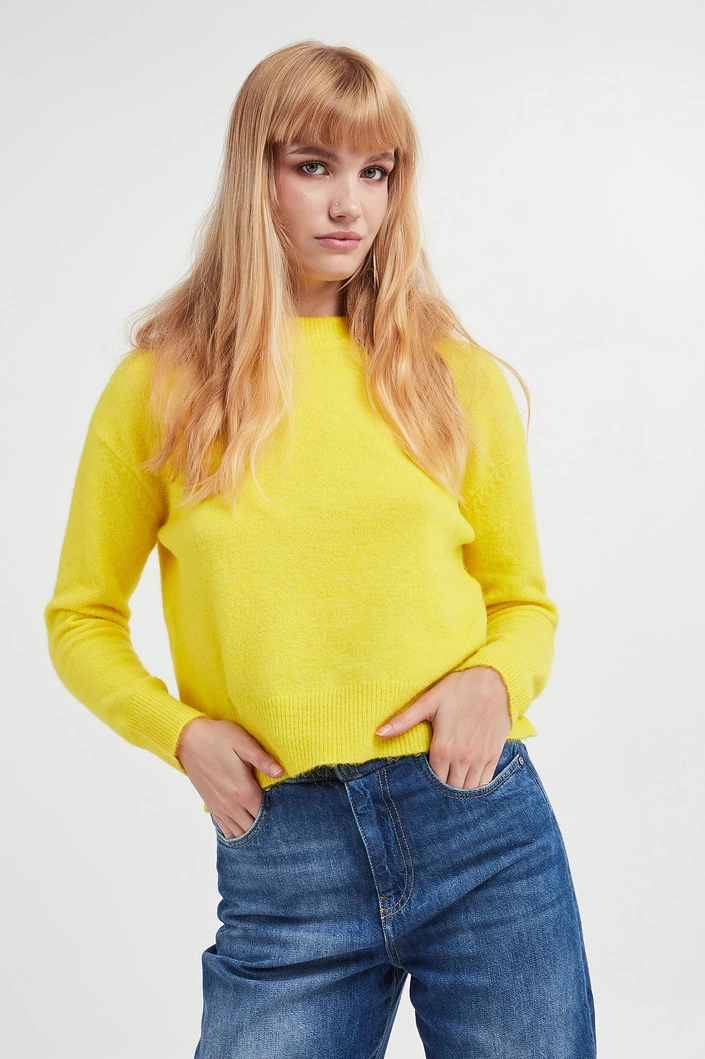 - Swetrowa dzianina z mieszanki wełny, alpaki i poliestru pochodzącego z recyklingu.