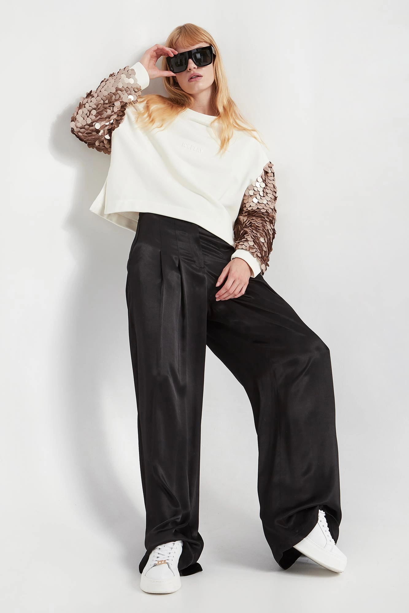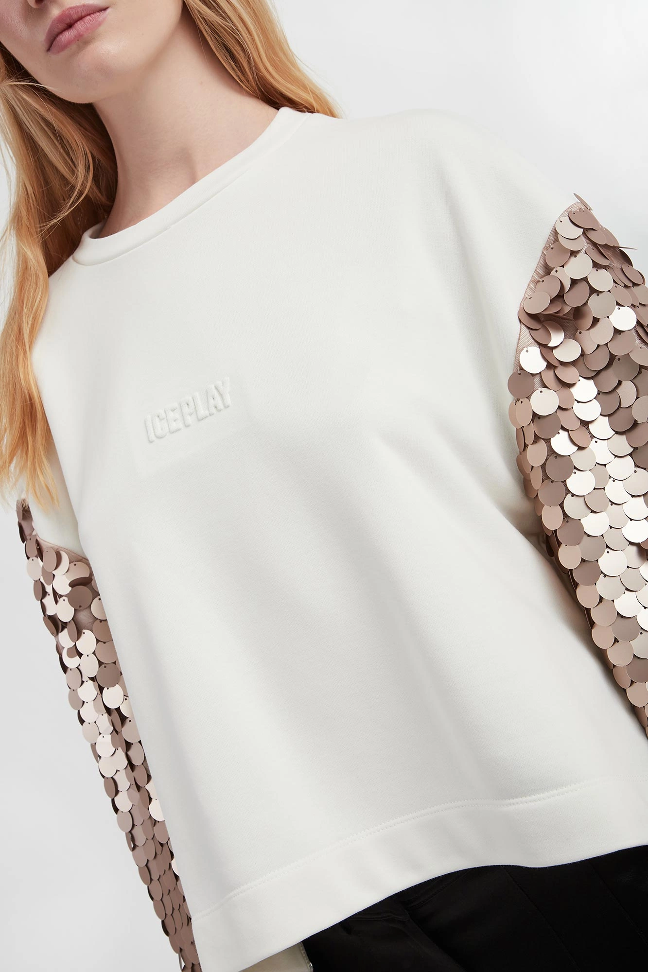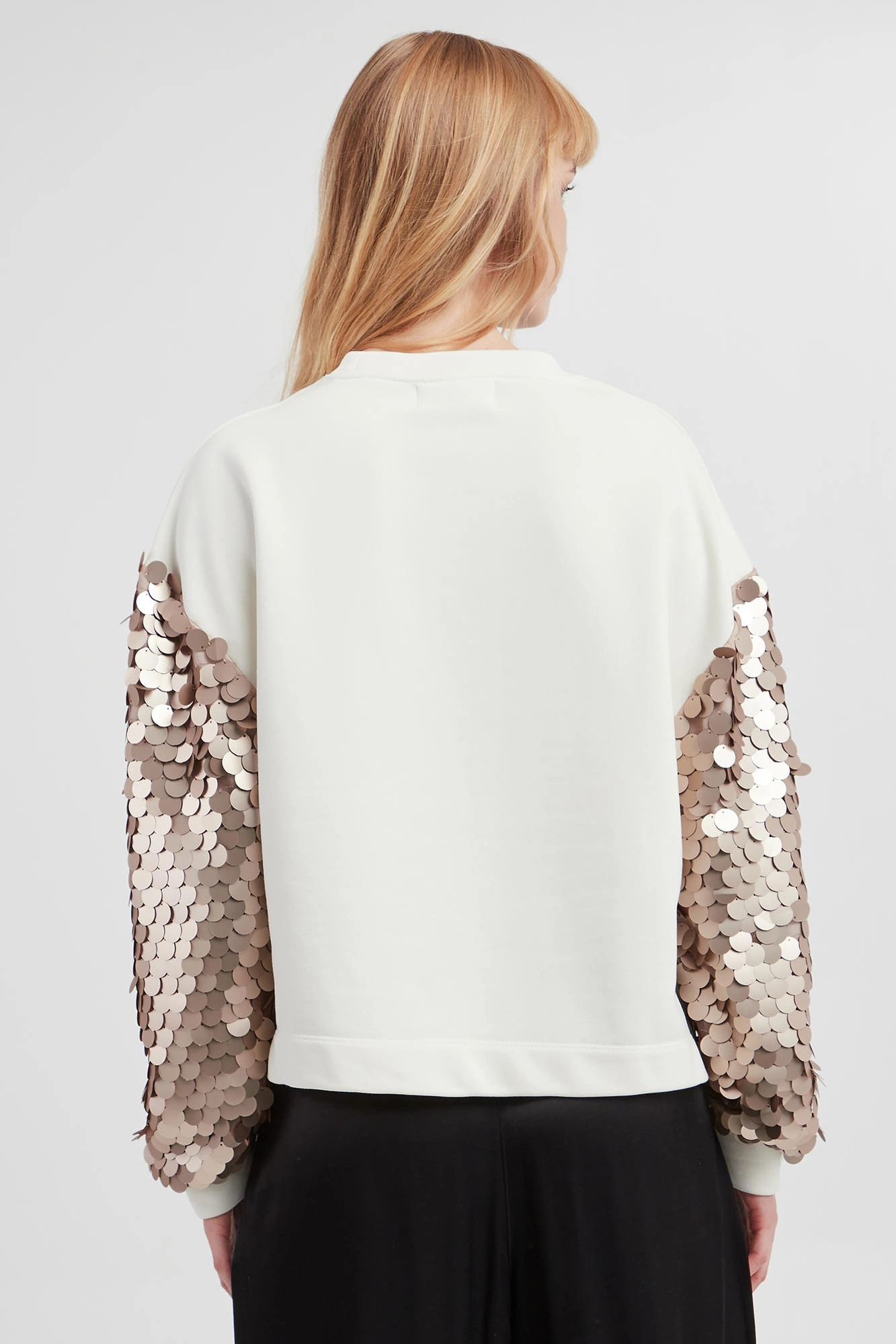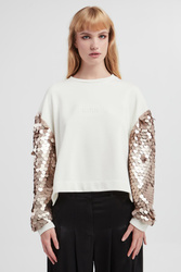 - Rękawy ozdobione siatką oraz beżowymi cekinami.