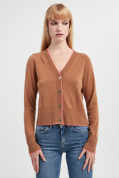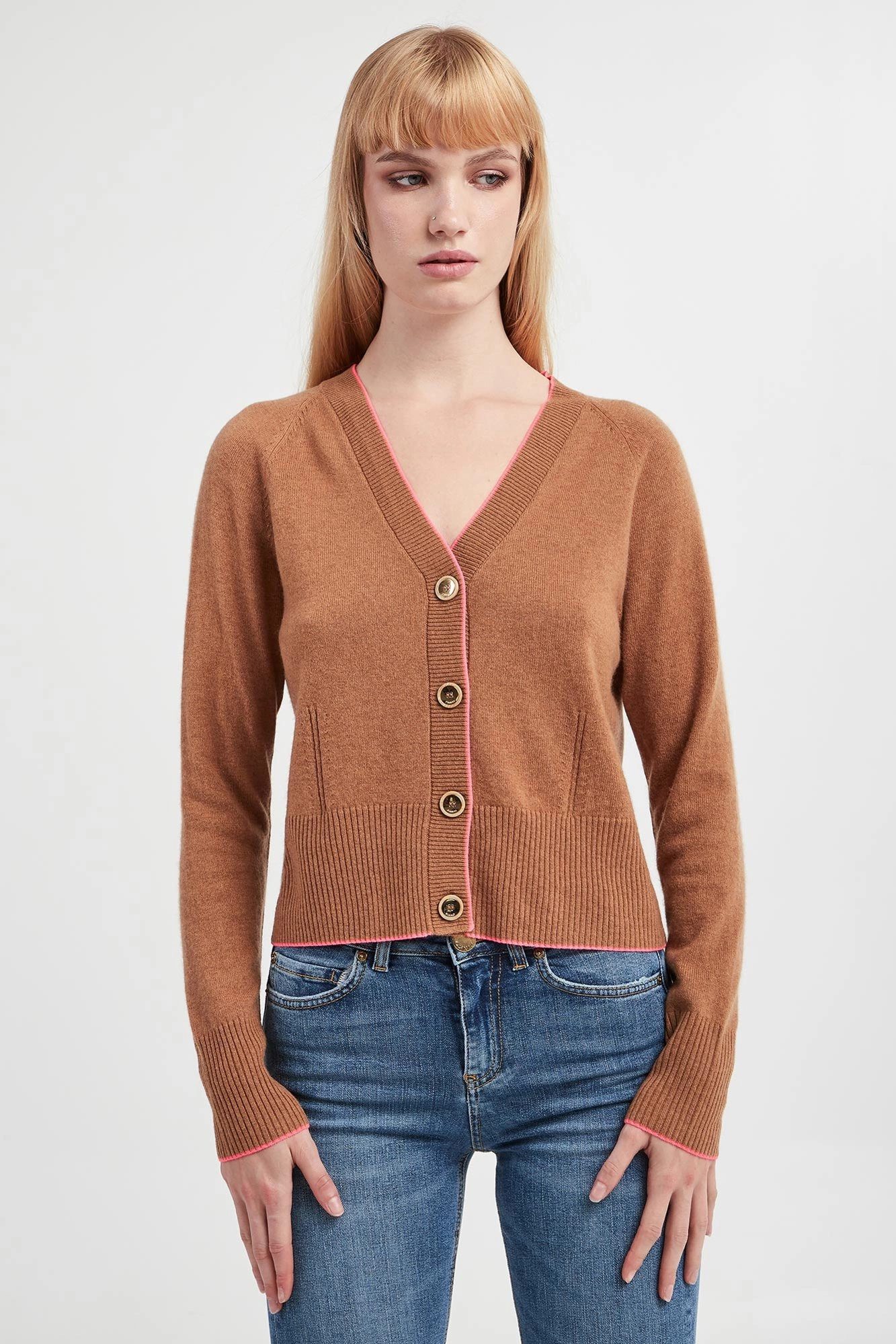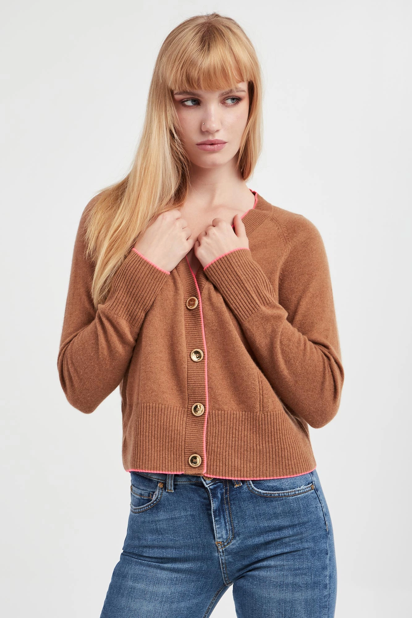 - Dekolt v-neck, długie rękawy i dół wykończone różową lamówką oraz ściągaczami.