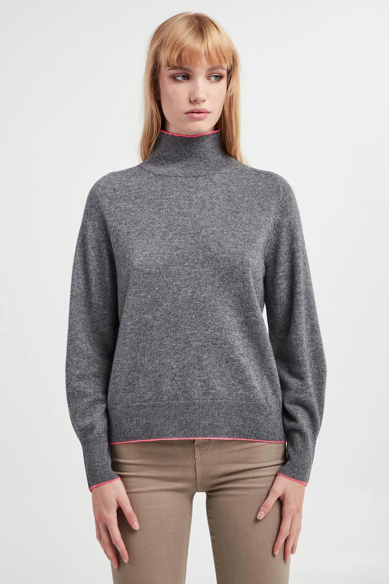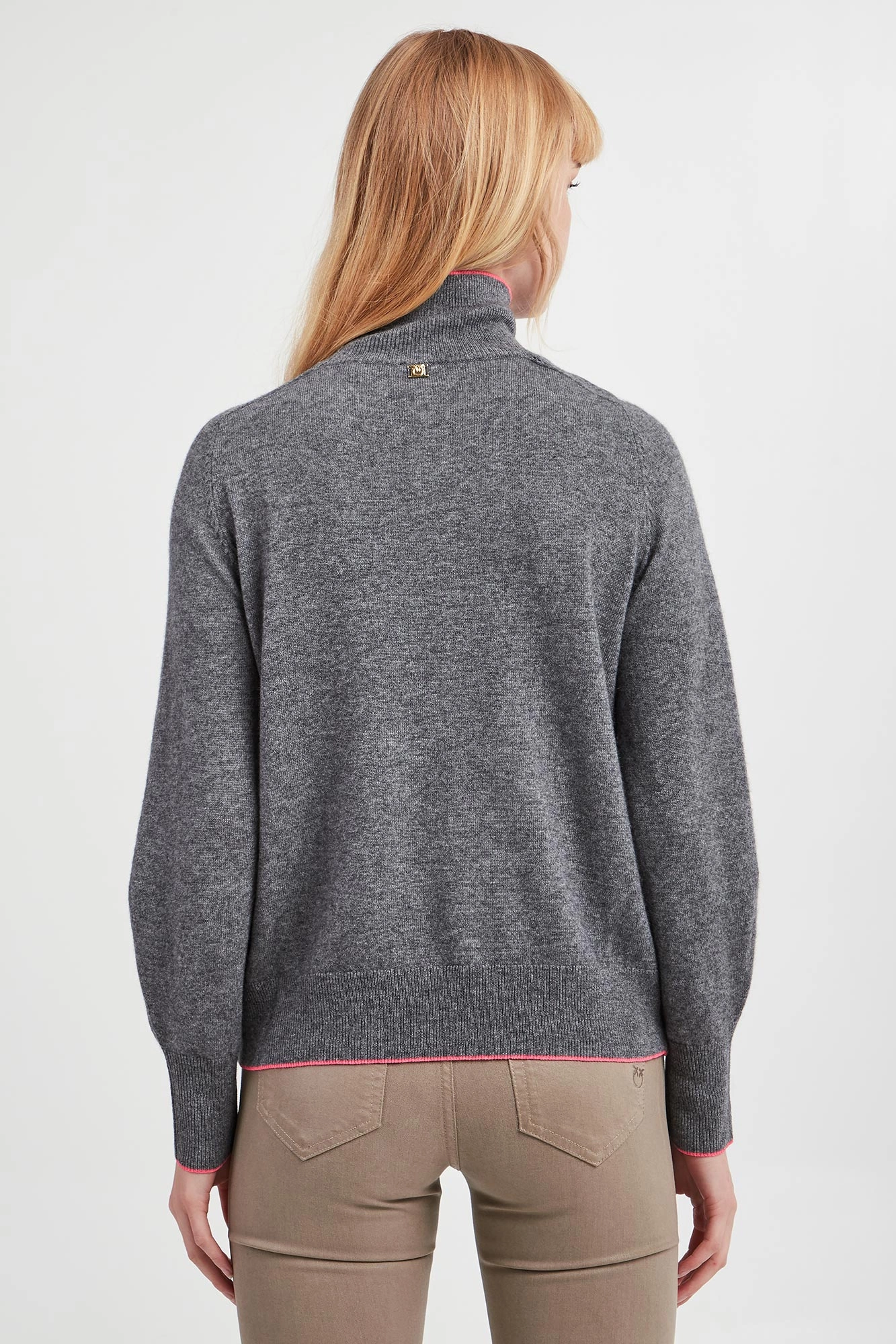 - Dekolt z golfem, długie rękawy i dół wykończone różową lamówką oraz ściągaczami.