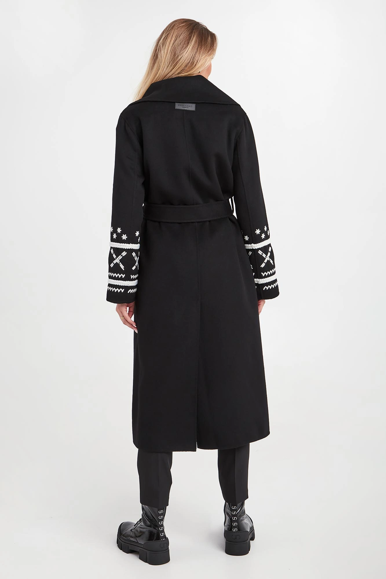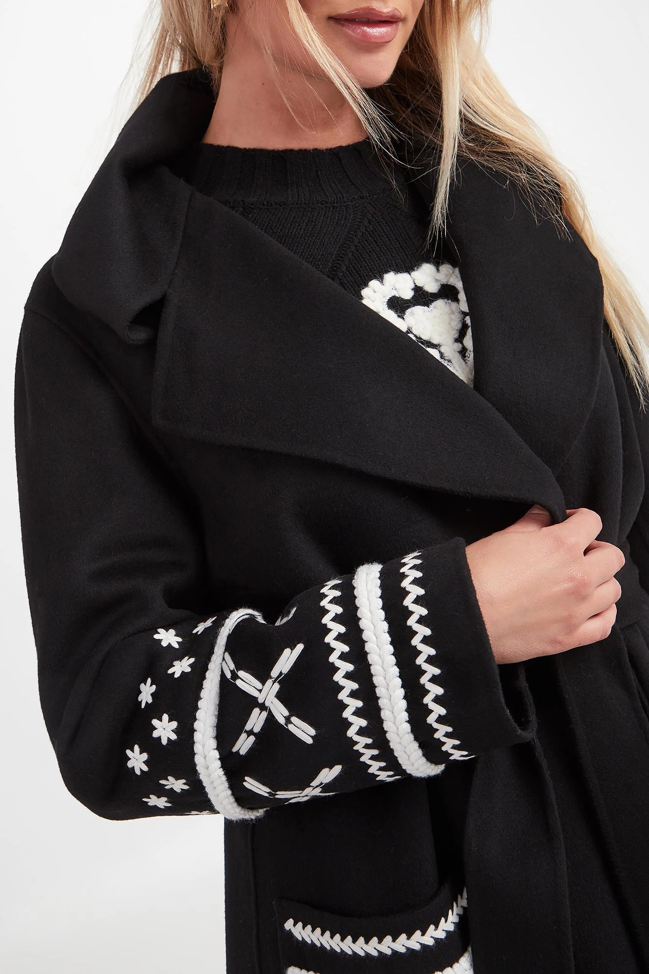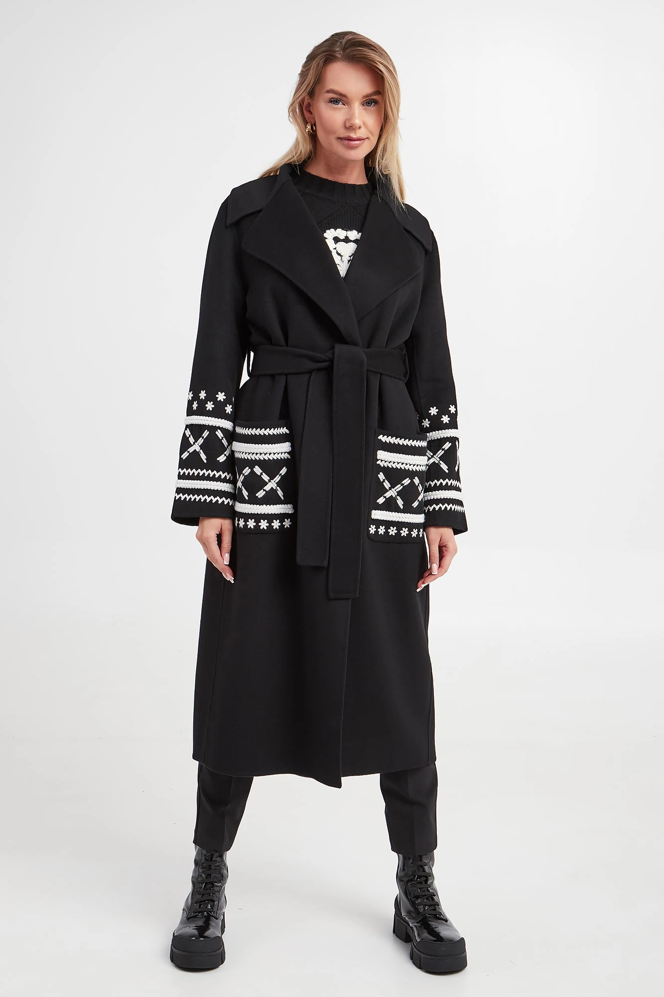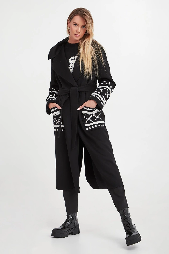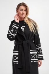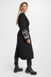- Ozdobny haft w kontrastowym, białym kolorze.