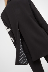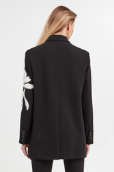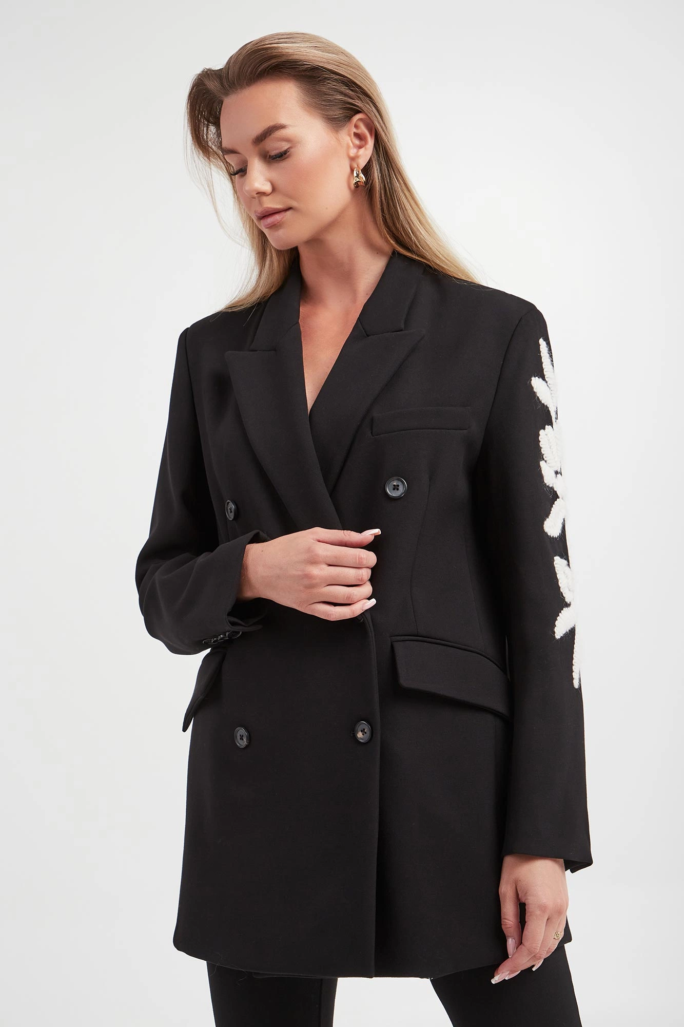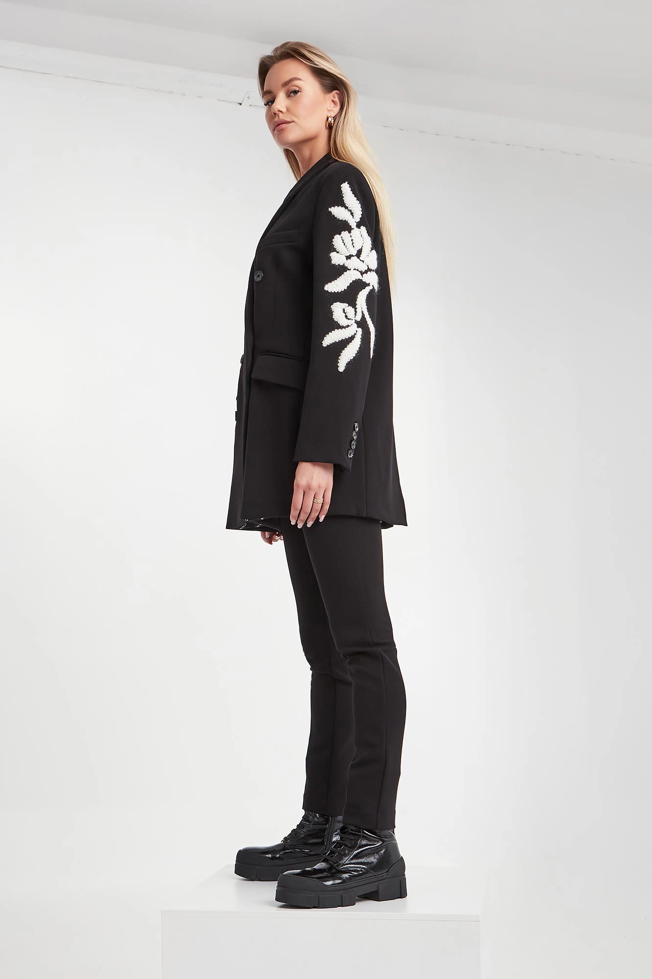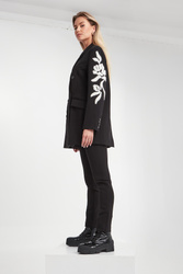 - Ozdobny haft w kontrastowym, białym kolorze.