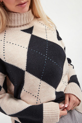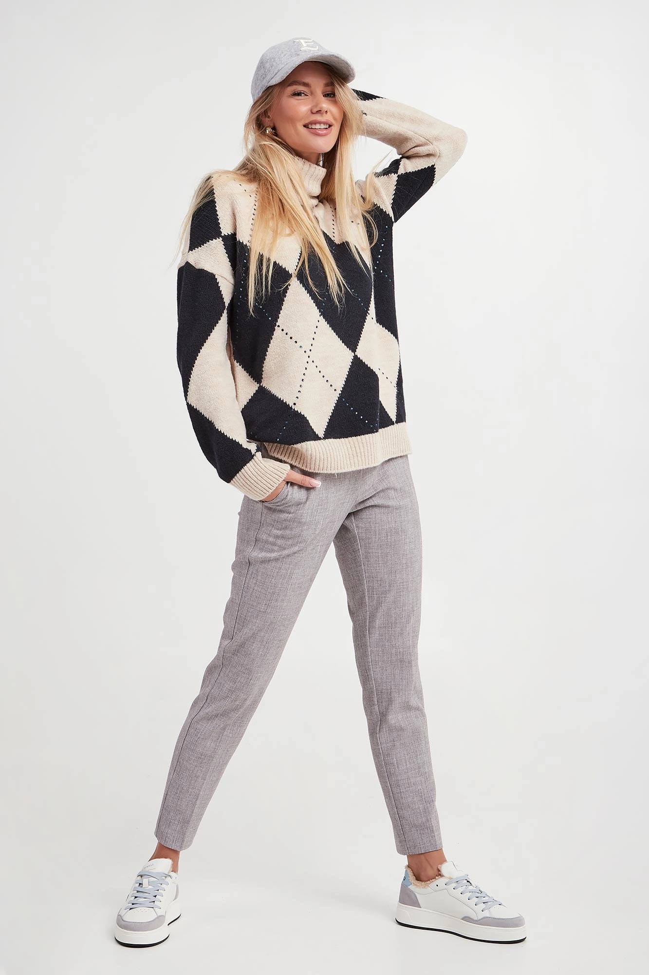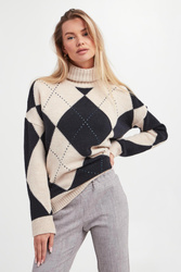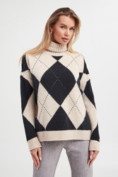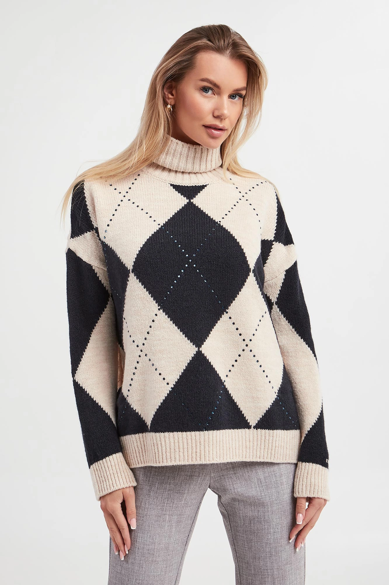 - Z przodu kontrastowy wzór argyle w granatowym kolorze.