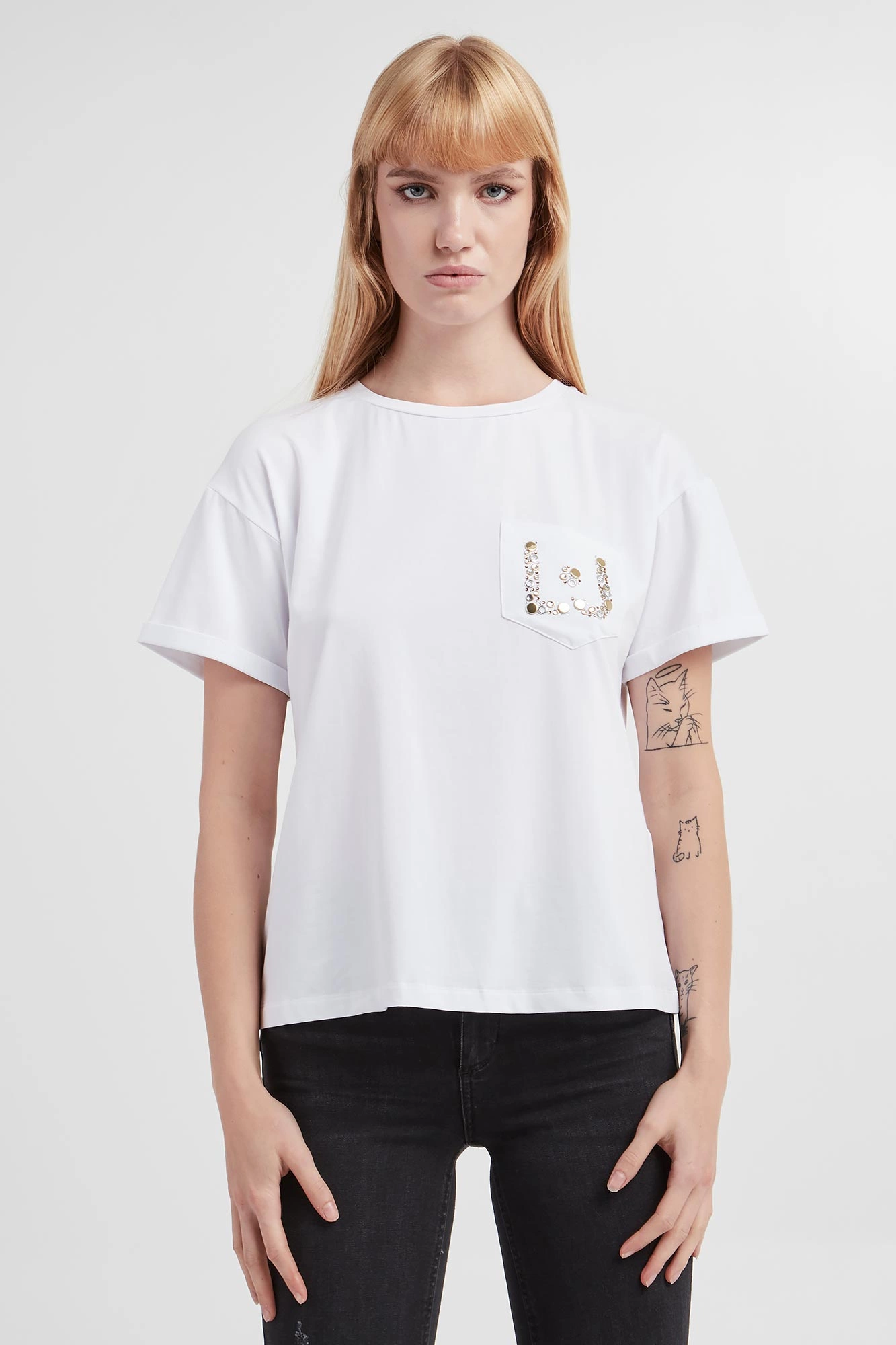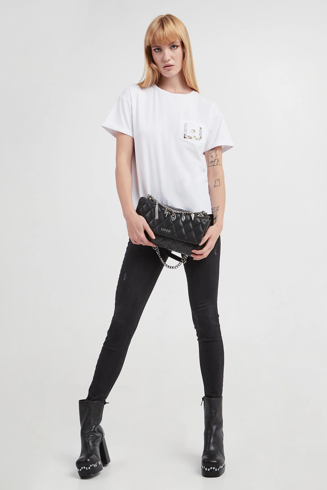 - Kieszeń na piersi wykończona ćwiekami tworzącymi logo.