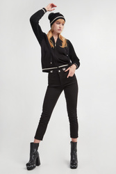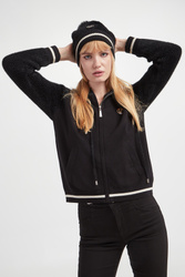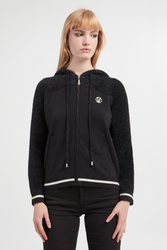 - Góra, rękawy oraz kaptur wykonane z prążkowanej tkaniny przeszytej połyskującą nicią.