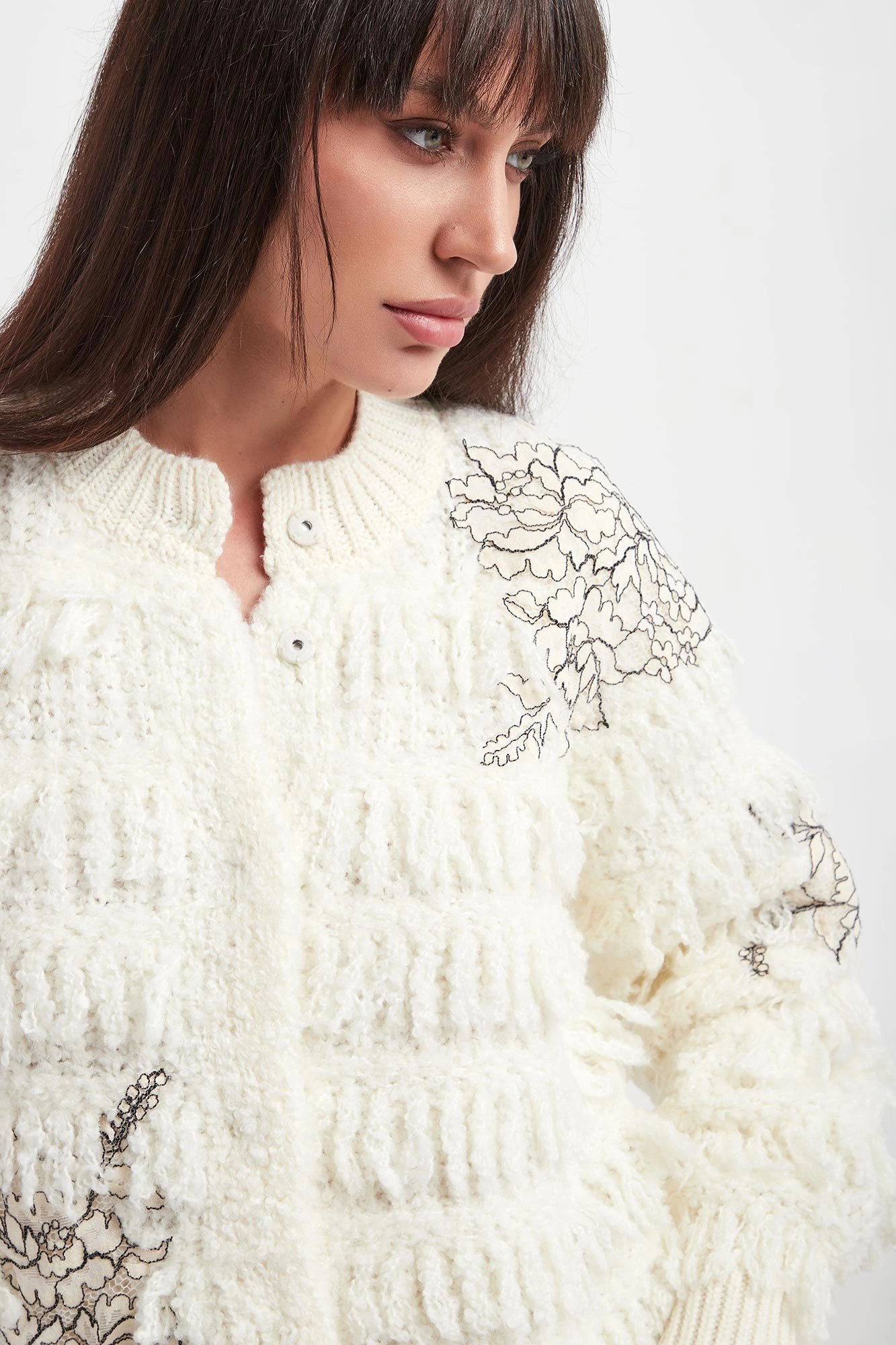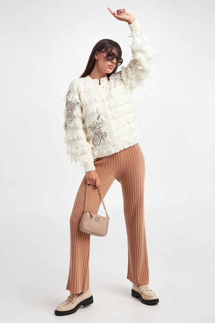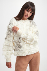 - Ozdobne frędzle i koronka na całości.