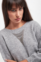 - Przy dekolcie trójkąt z błyszczącego łańcuszka.