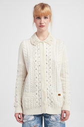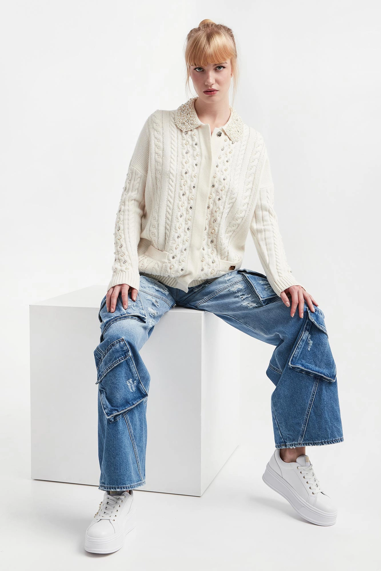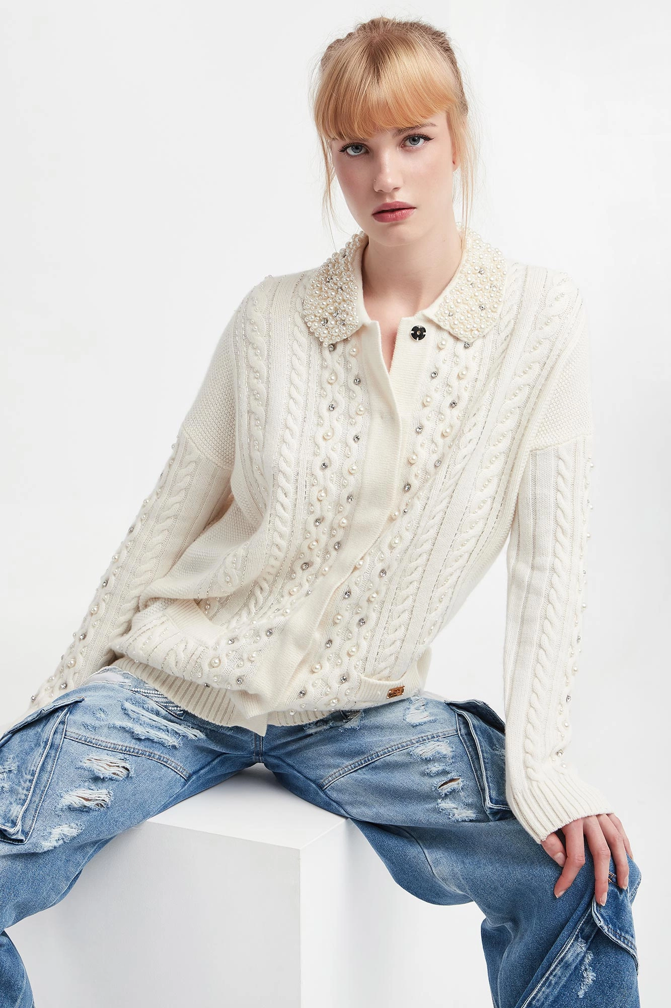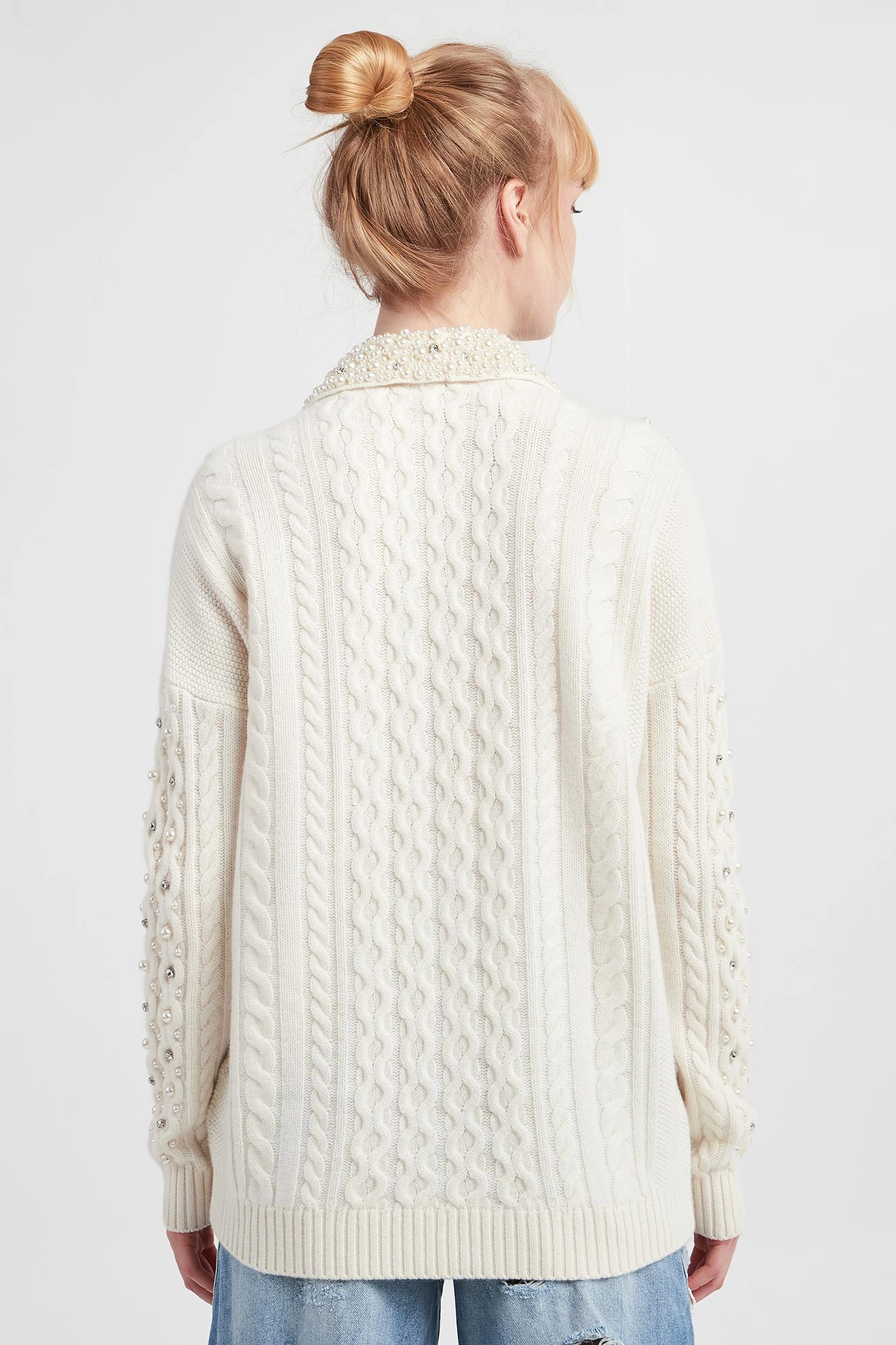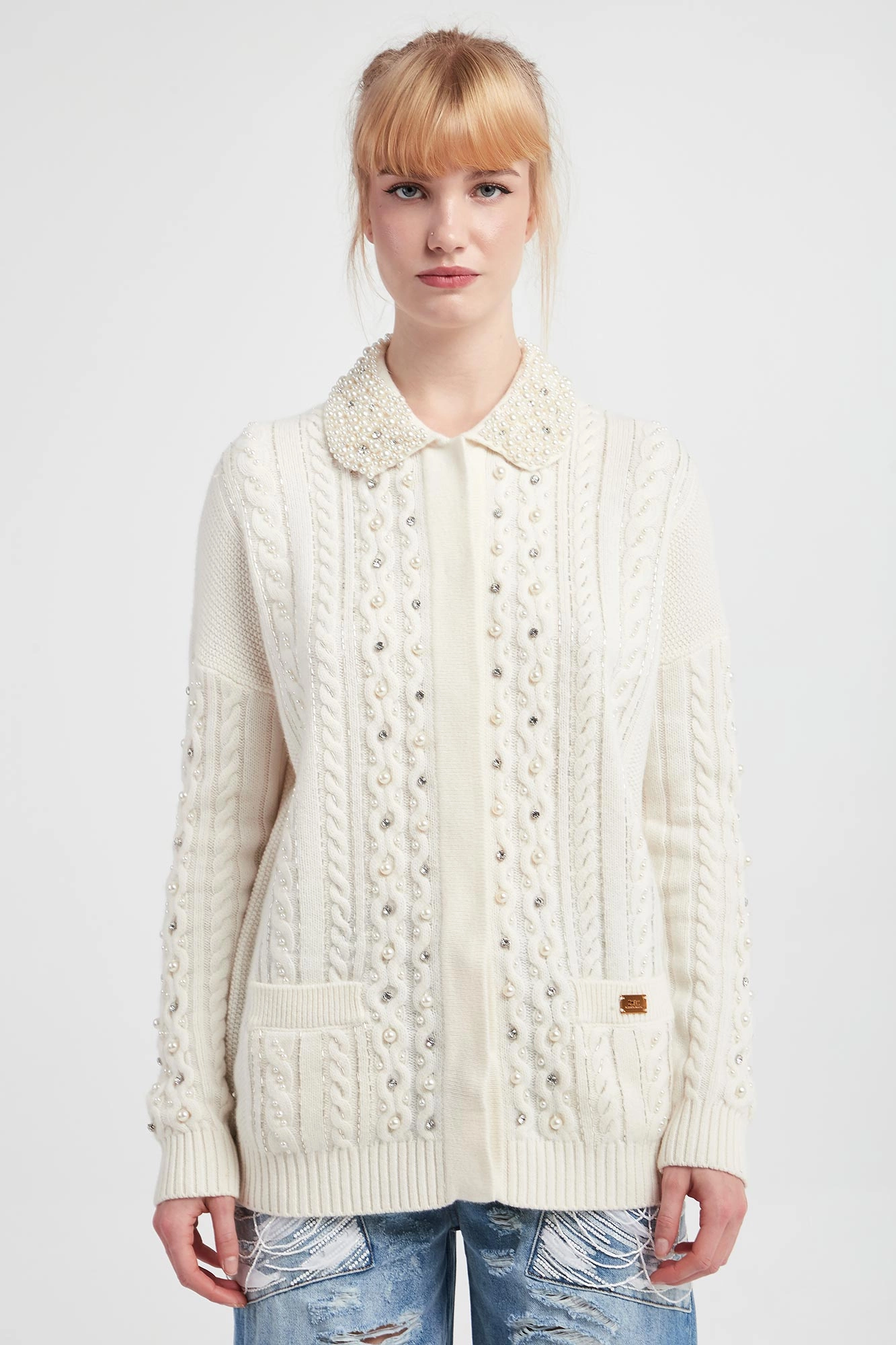 - Kołnierz wykończony ozdobnymi perłami.