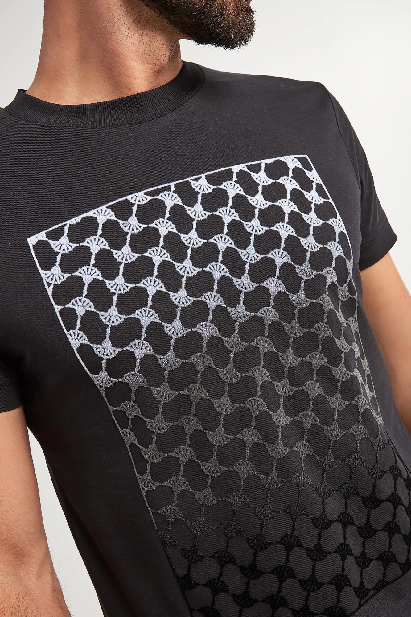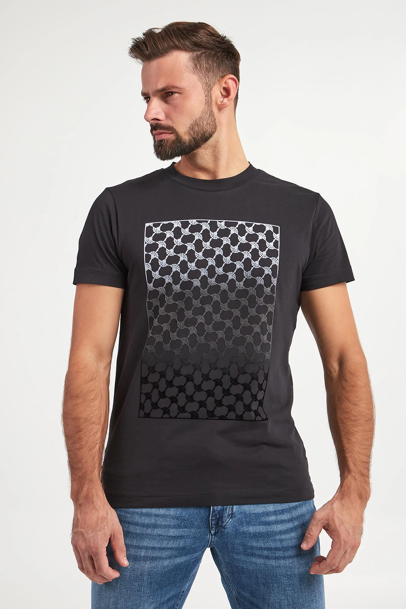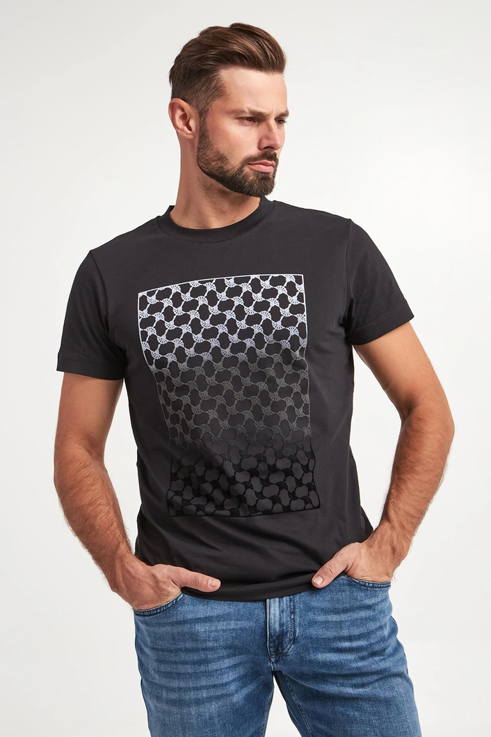 - Na froncie flokowany nadruk z motywem chabrów i efektem ombre.