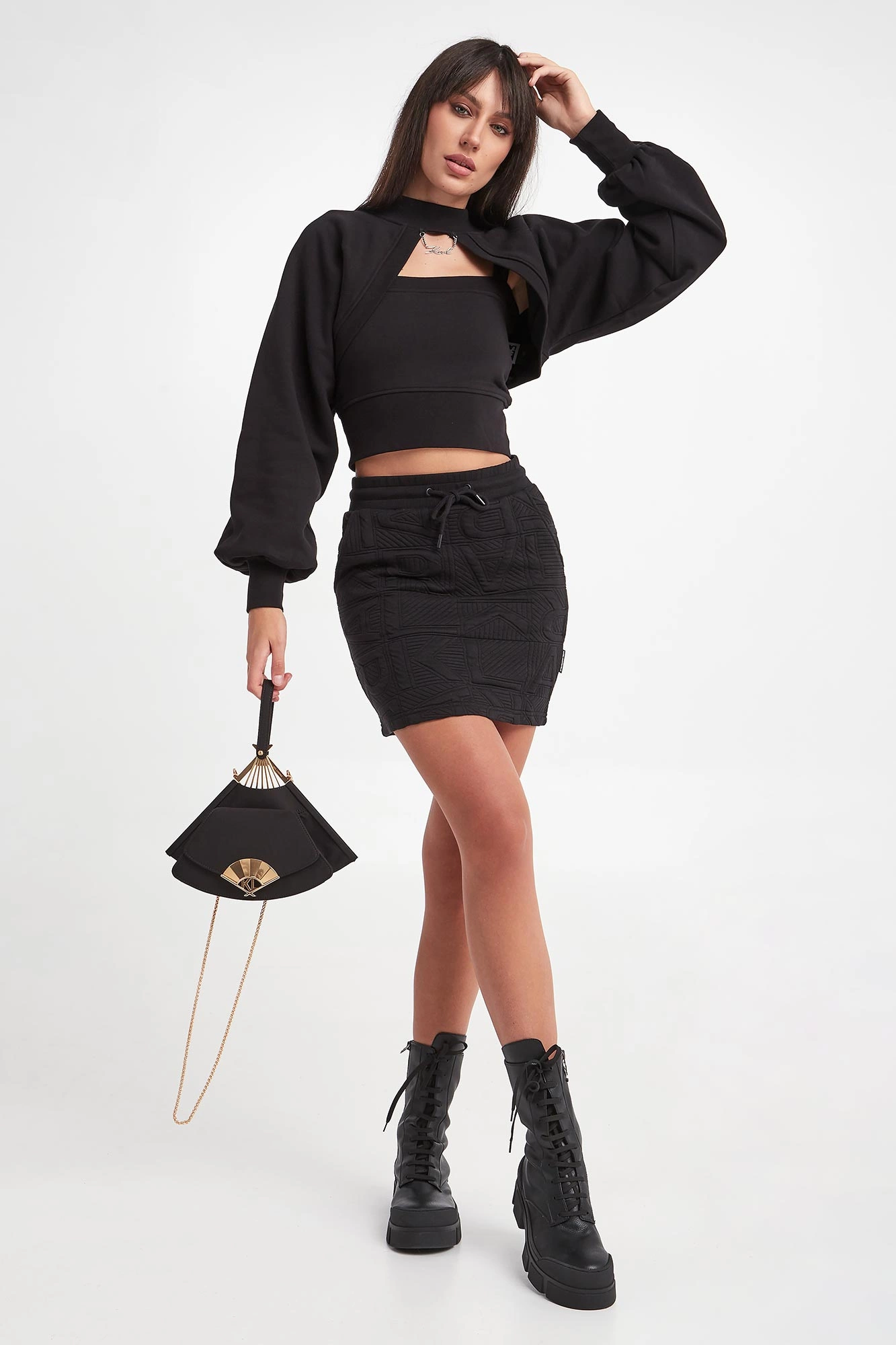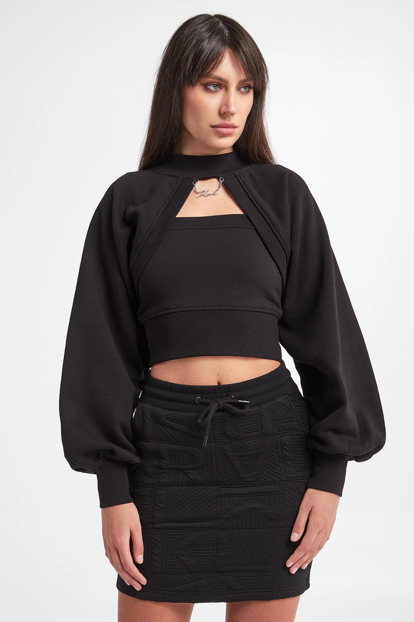 - Dekolt ze stójką ozdobiony srebrnym łańcuszkiem z logo.