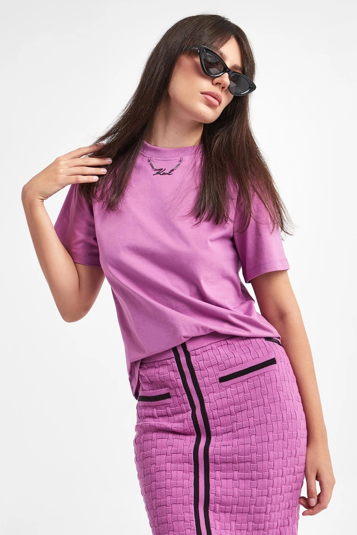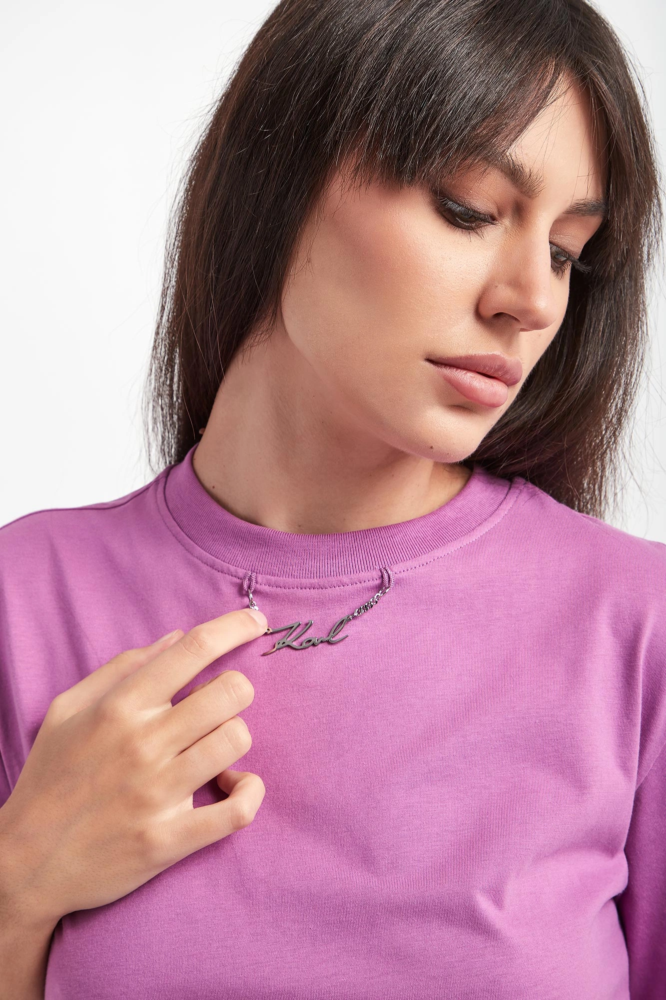 - Okrągły dekolt ozdobiony srebrnym łańcuszkiem z logowaną zawieszką.