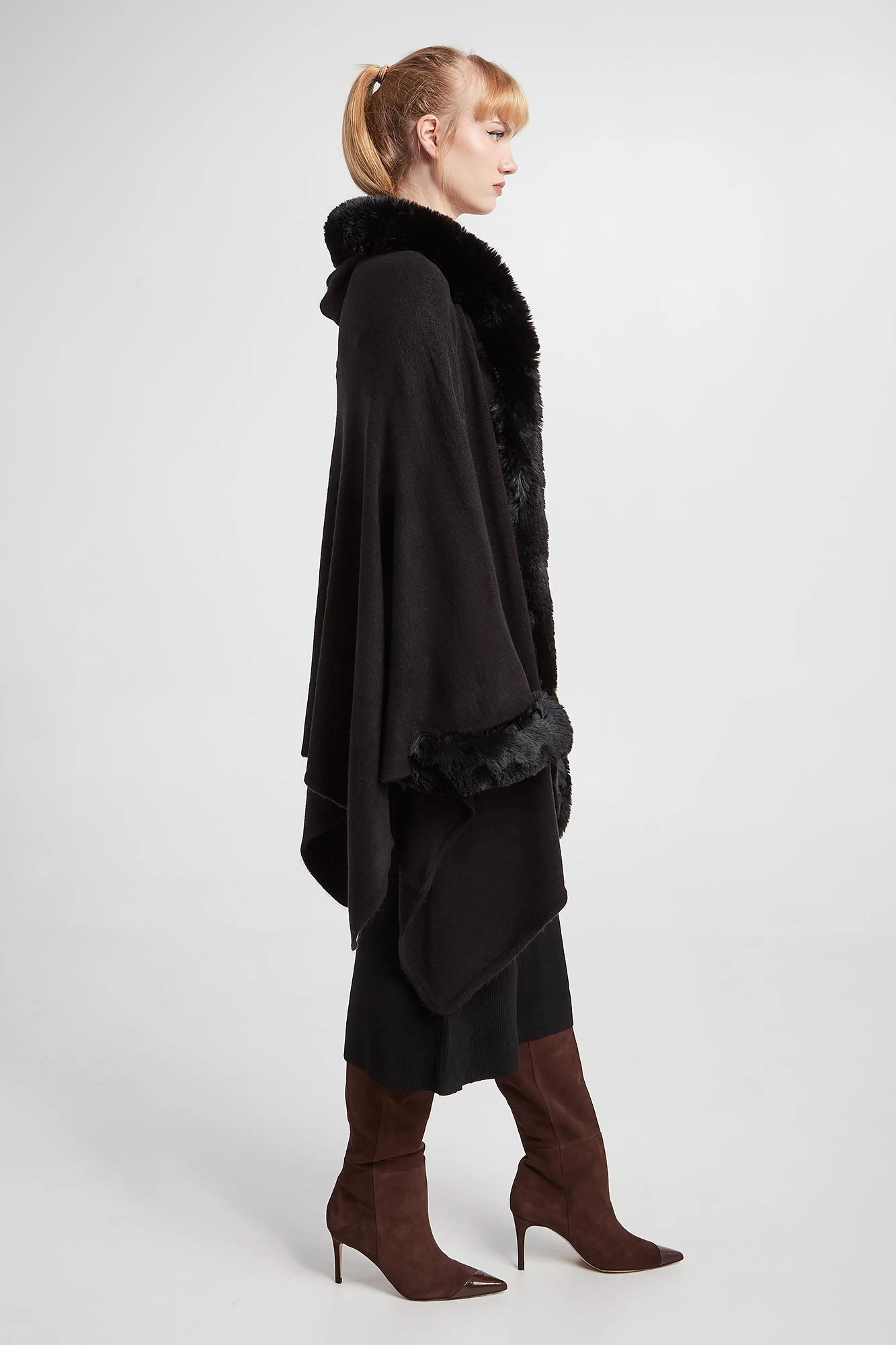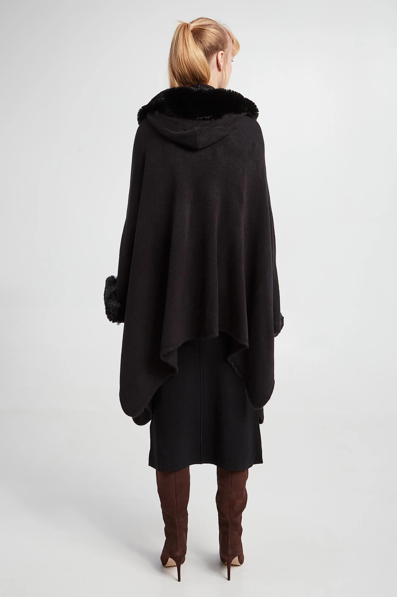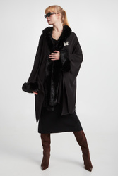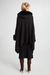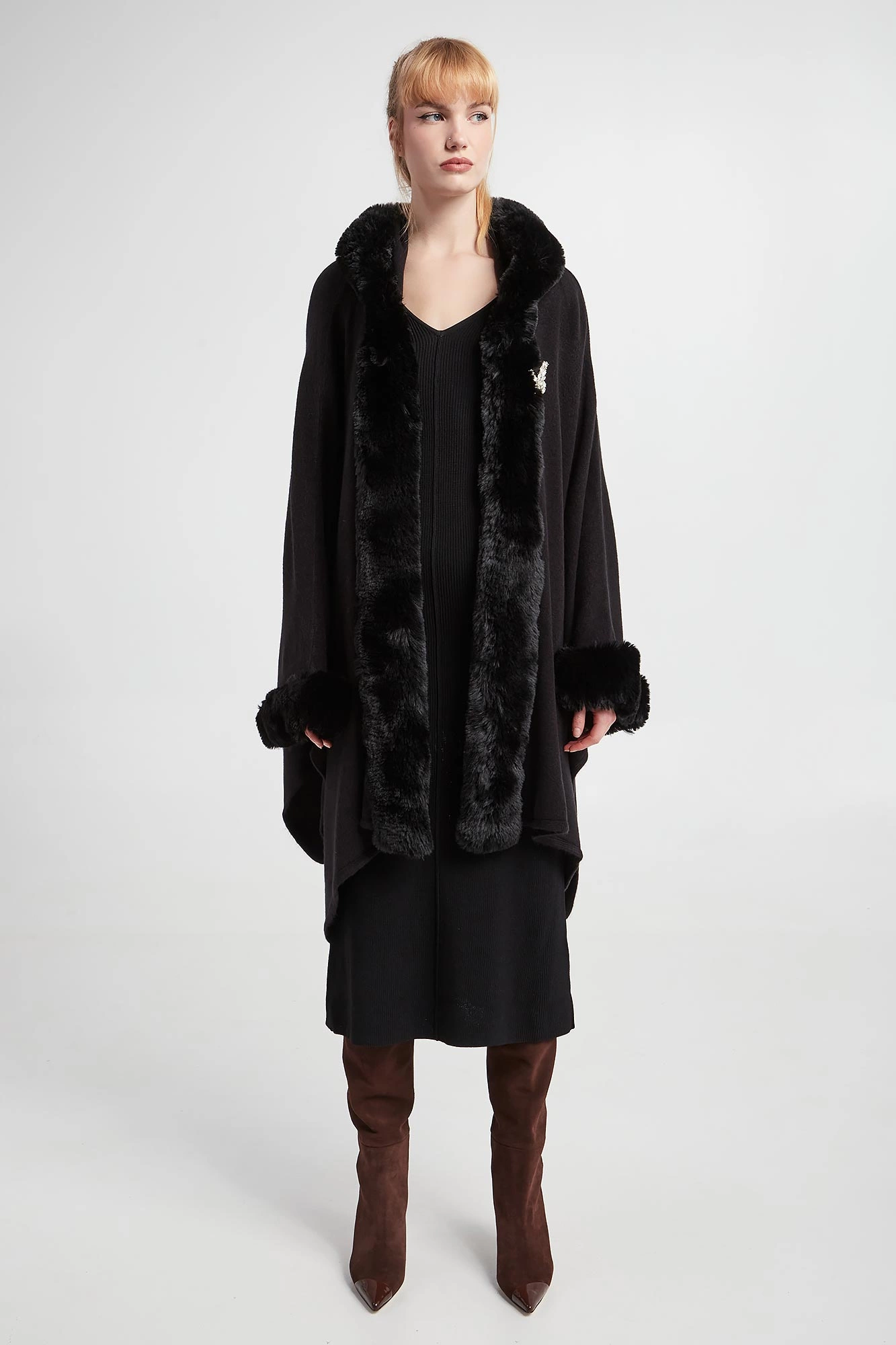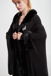 - Dekolt i rękawy ozdobione syntetycznym futrem.