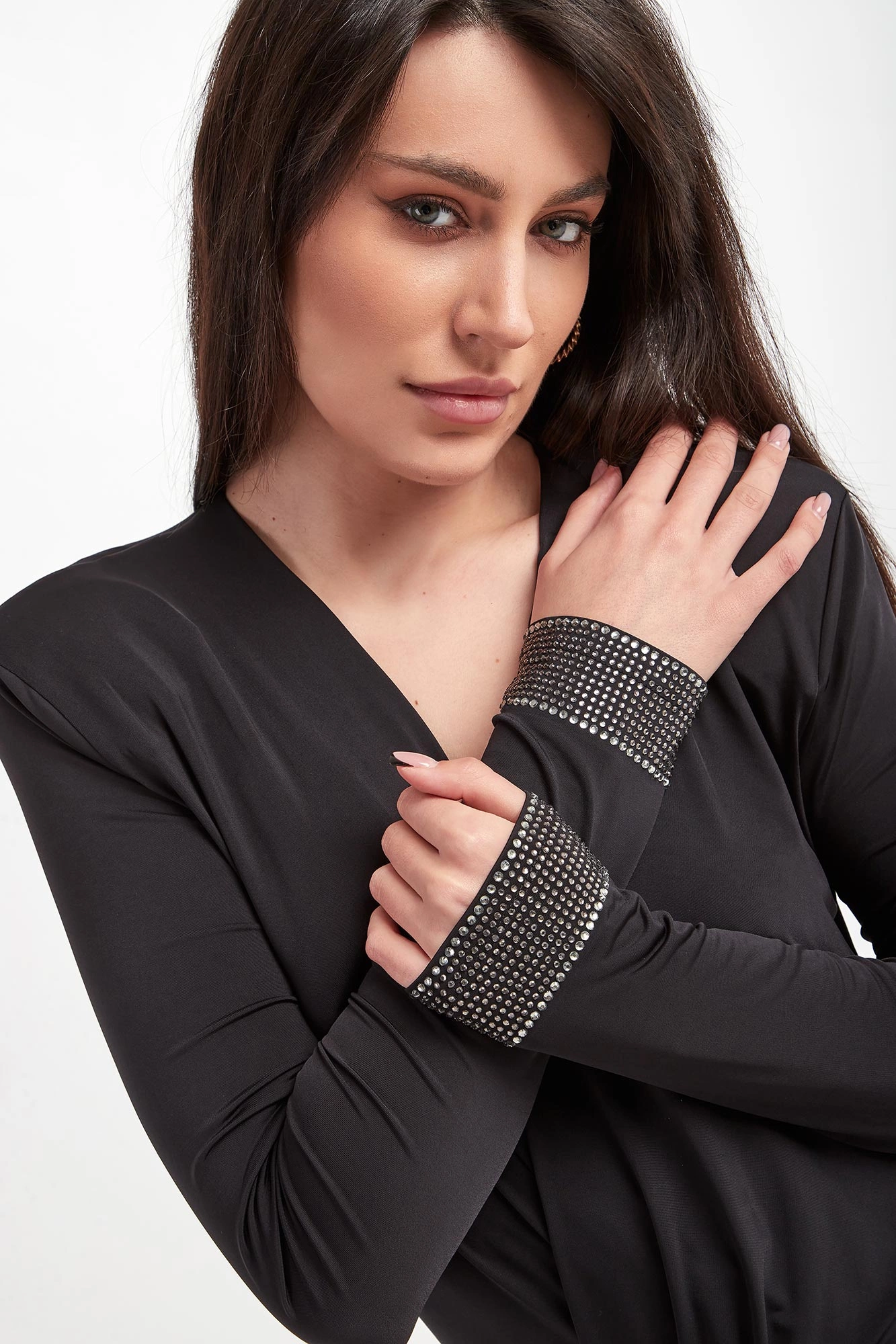 - Długi rękaw ozdobiony kryształkami.